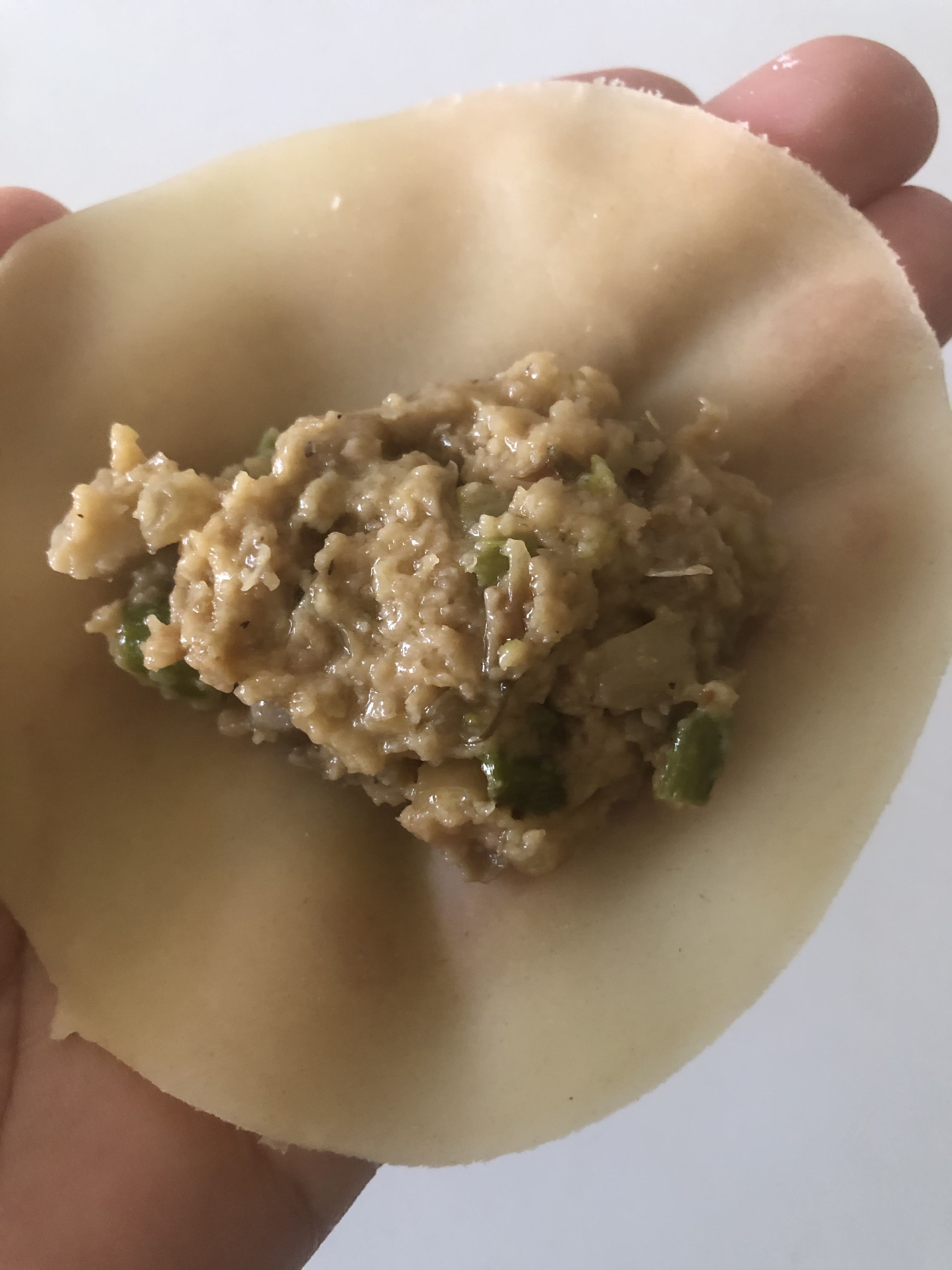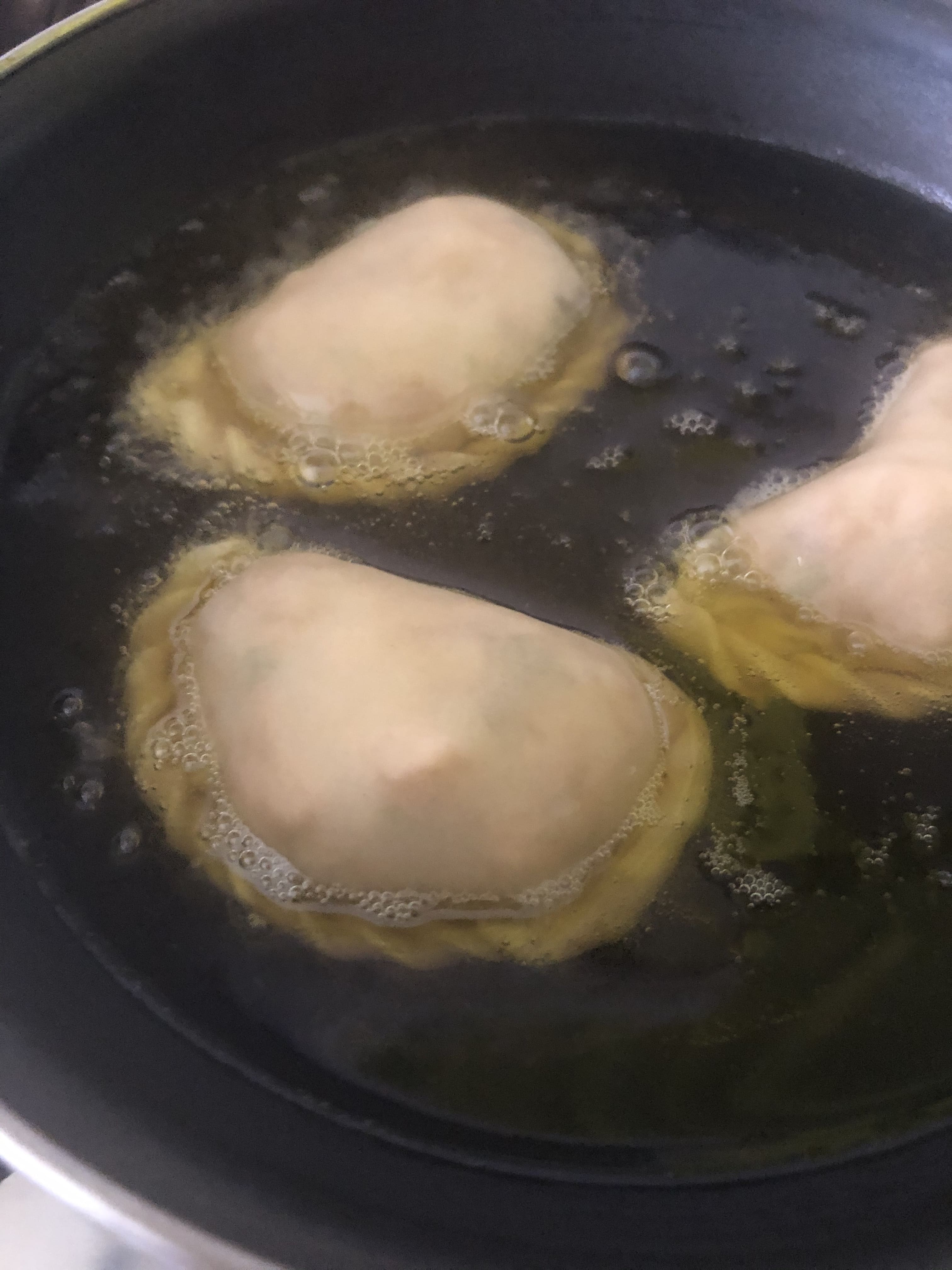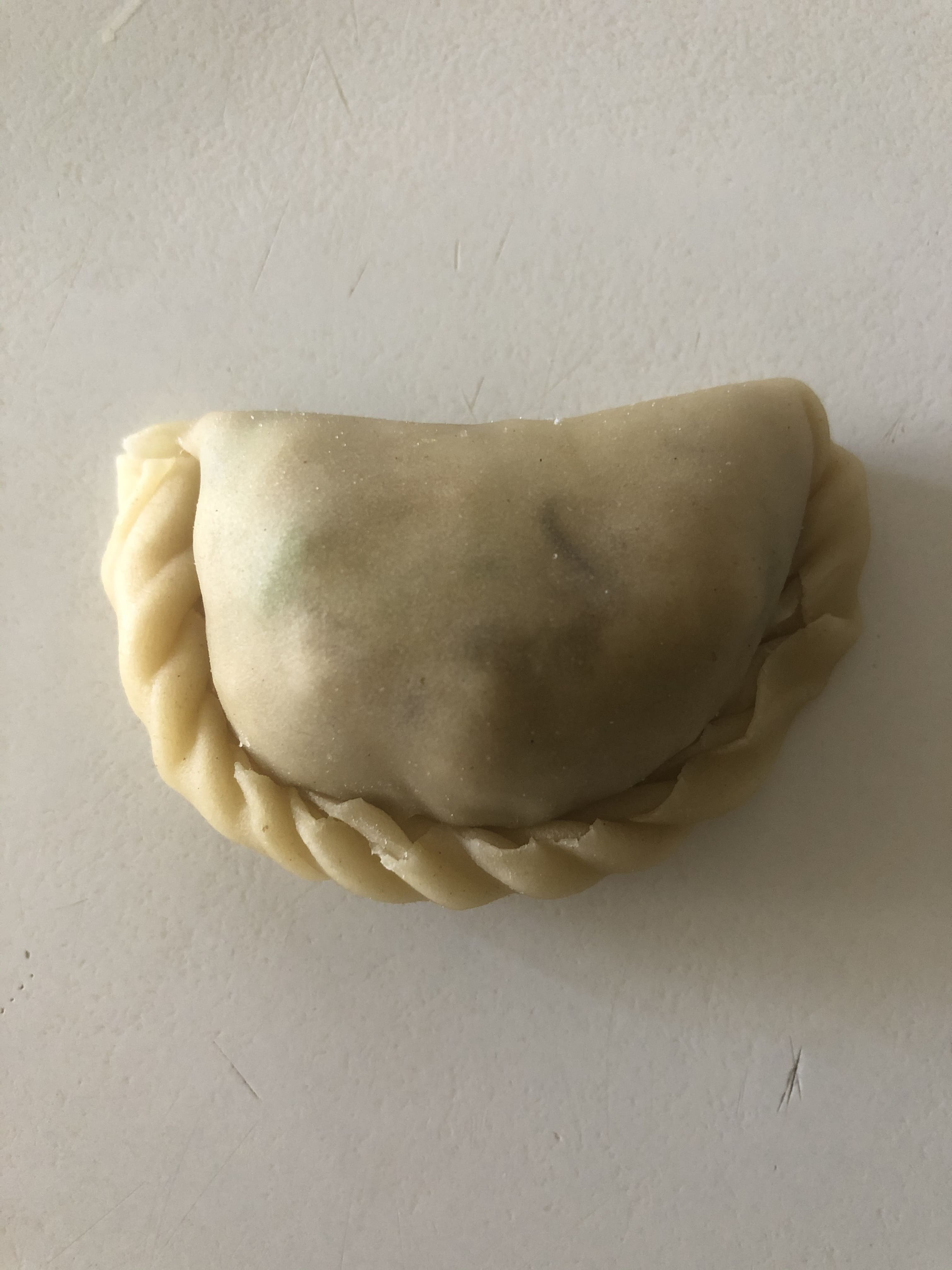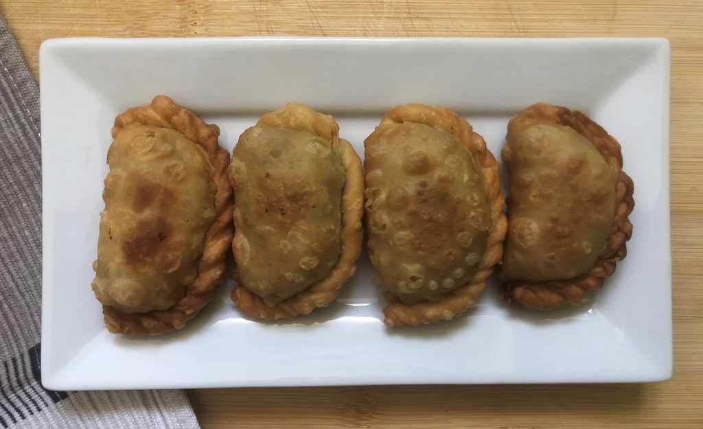 Cuando el relleno esté tibio (tirando a frío mejor), extiende las placas de empanadilla sobre una superficie de trabajo, agrega una cucharada del relleno en el centro y dobla la masa. Presiona suavemente con los dedos alrededor del relleno para sacar el aire y sella los extremos. Haz el borde, bien presionando con un tenedor y recortando los “picos” sobrantes con un cortapastas o bien haciendo un ribete, doblando el borde sobre sí mismo. Y ya estarían listas para cocinar. Fríelas o ásalas en el horno barnizadas con un poquito de aceite.