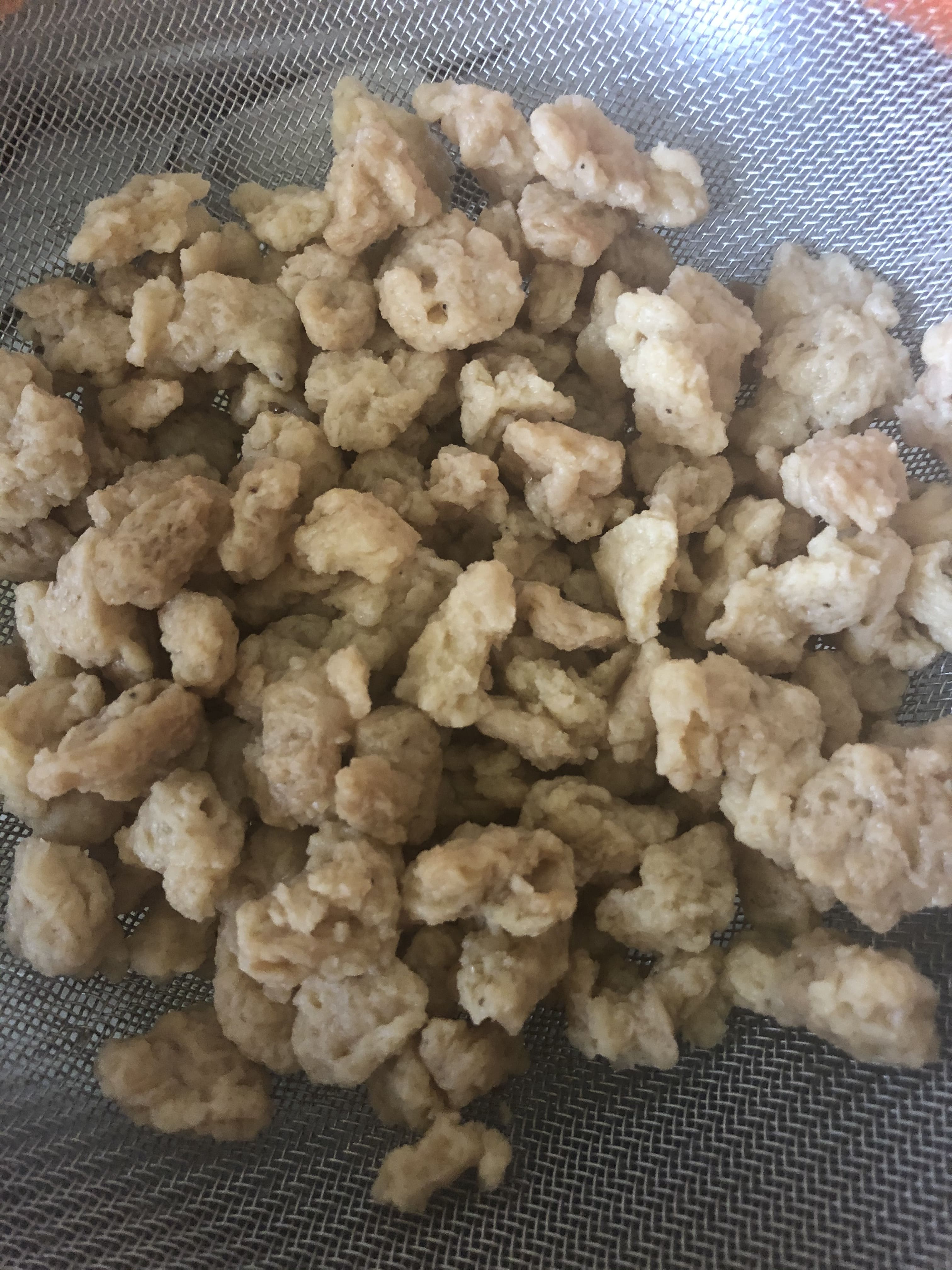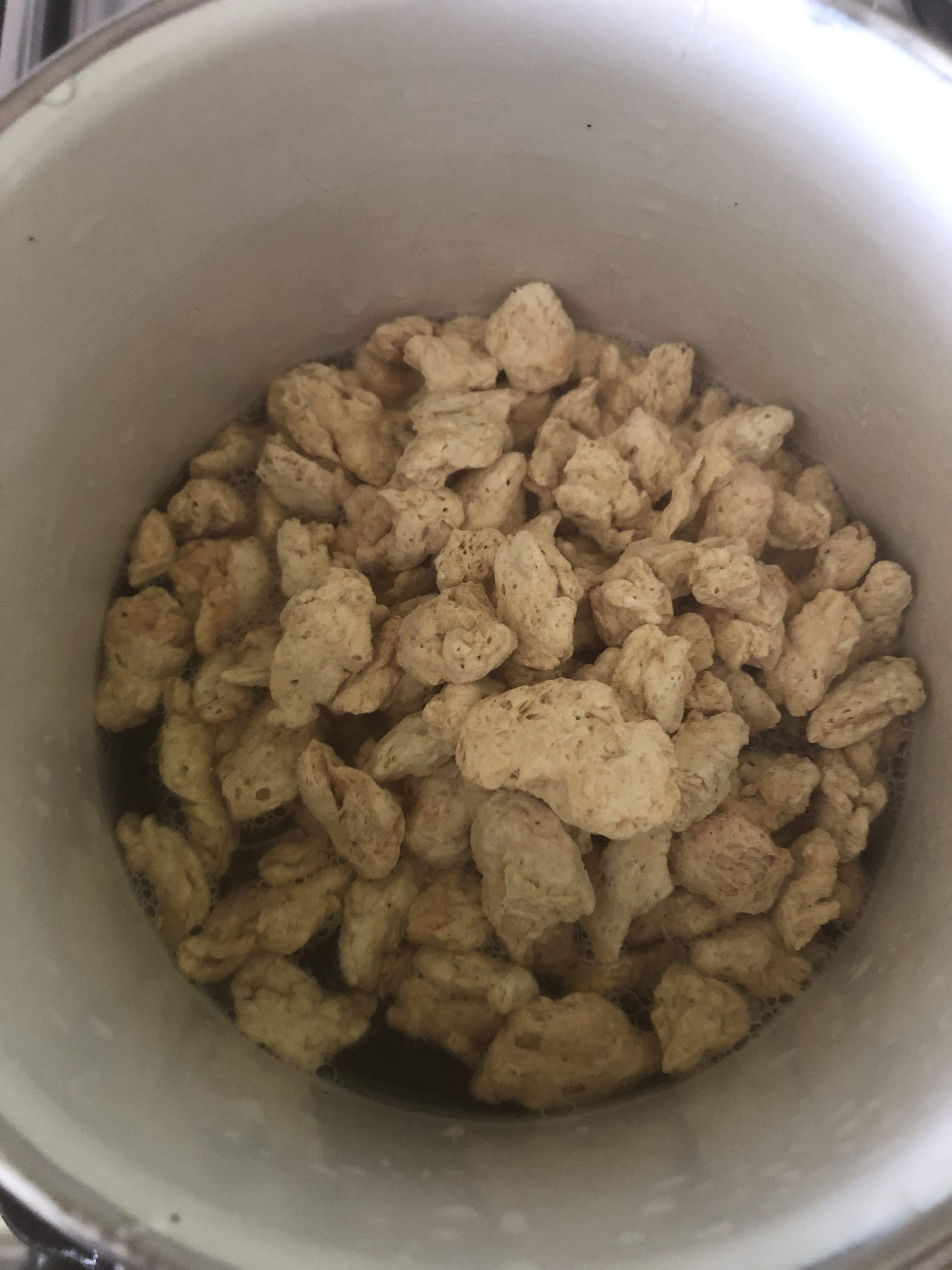 En una cazuela pon a hervir abundante agua con sal. Agrega la soja texturizada y cuando empiece a hervir, apaga el fuego, tapa la cazuela y deja reposar durante unos 15 minutos.