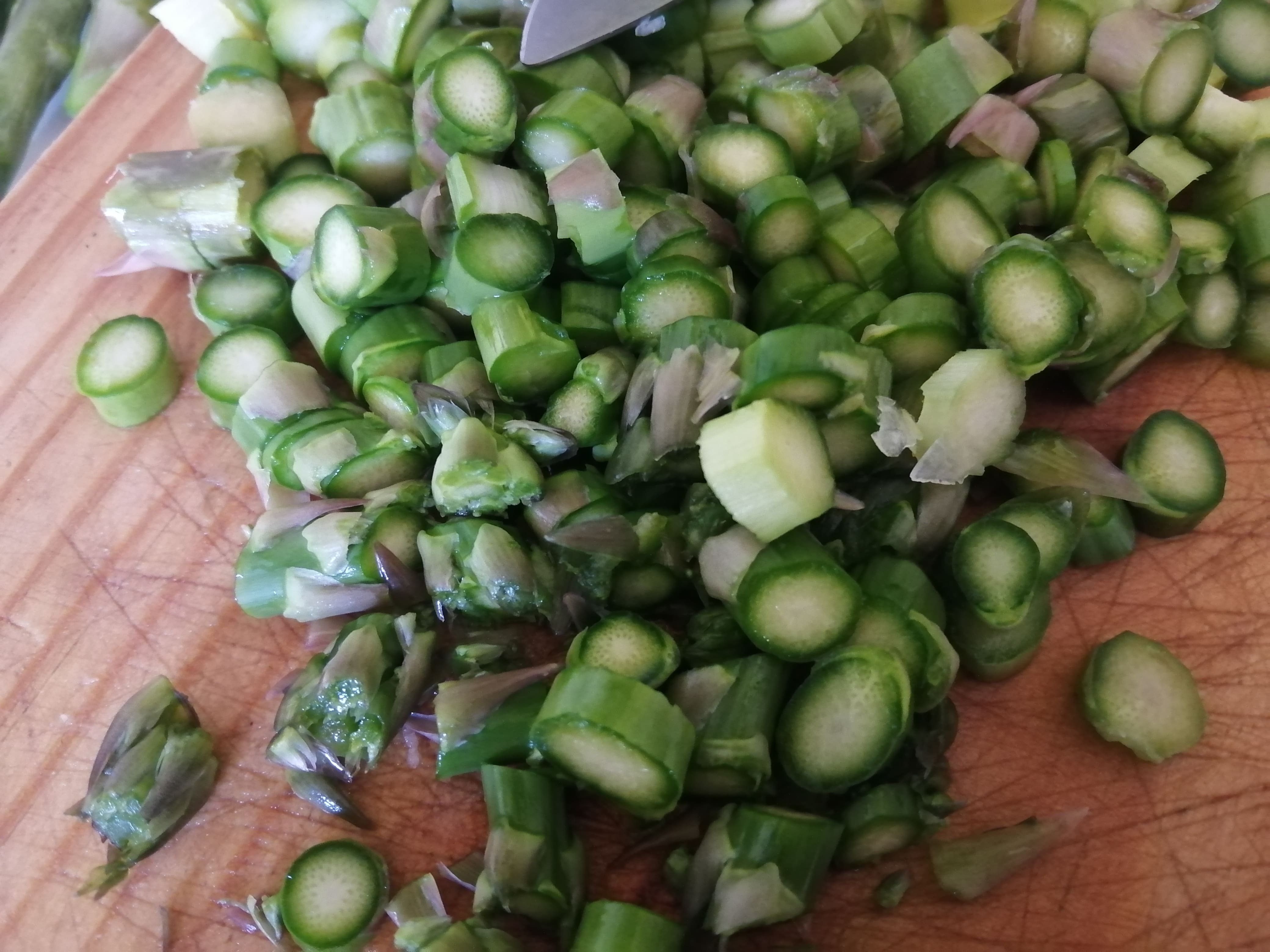 Pon otra cazuela grande al fuego con agua y sal para blanquear los espárragos. Límpialos primero, eliminando la parte dura y quitándoles la piel con un rallador. Corta en trocitos pequeños. Cuando el agua empiece a hervir, cuece los espárragos durante unos 5-6 minutos. Escurre y reserva. Mientras tanto corta la cebolla en brunoise. Limpia y corta las setas. Macha el ajo y el jengibre.
