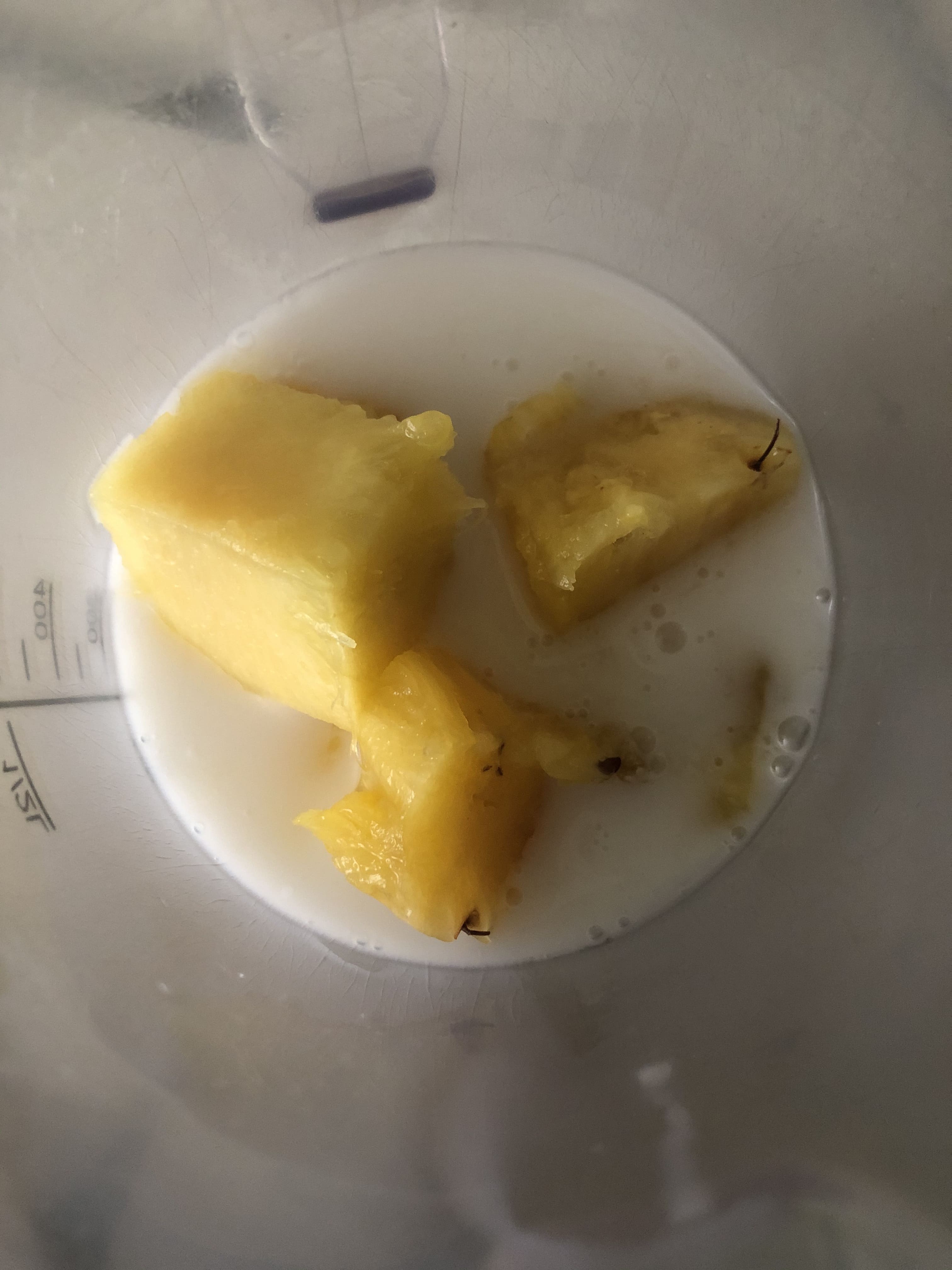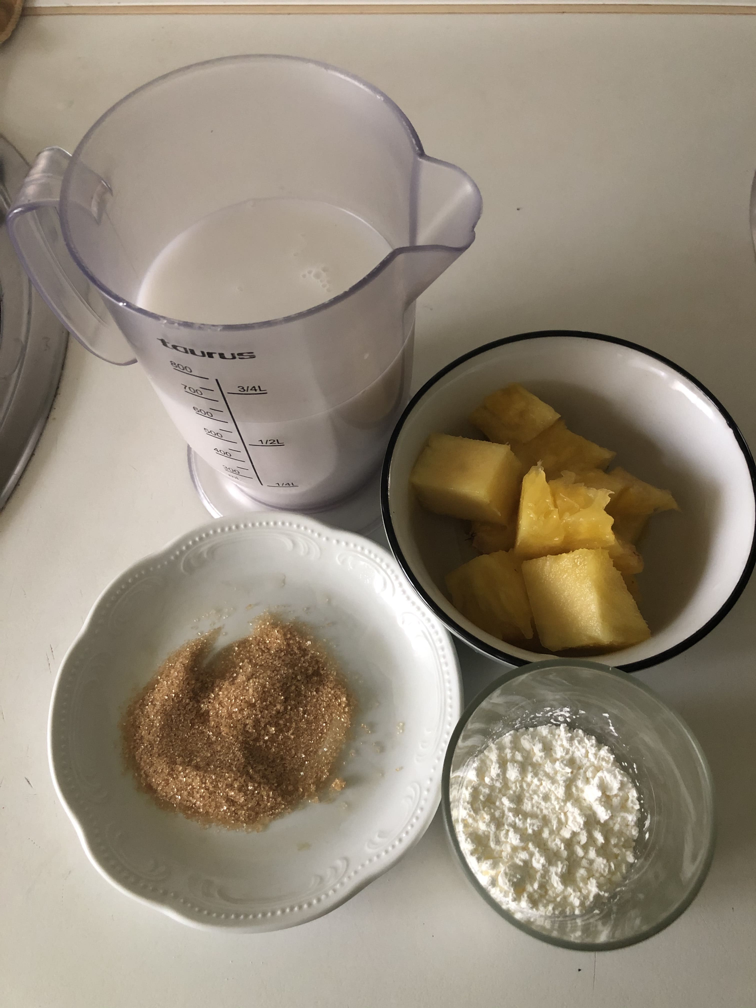 Disuelve la maicena en un poco de leche. Pela la piña, córtala en cubos y tritúrala con la batidora, junto con el azúcar y otro poco de leche, hasta obtener un puré fino.