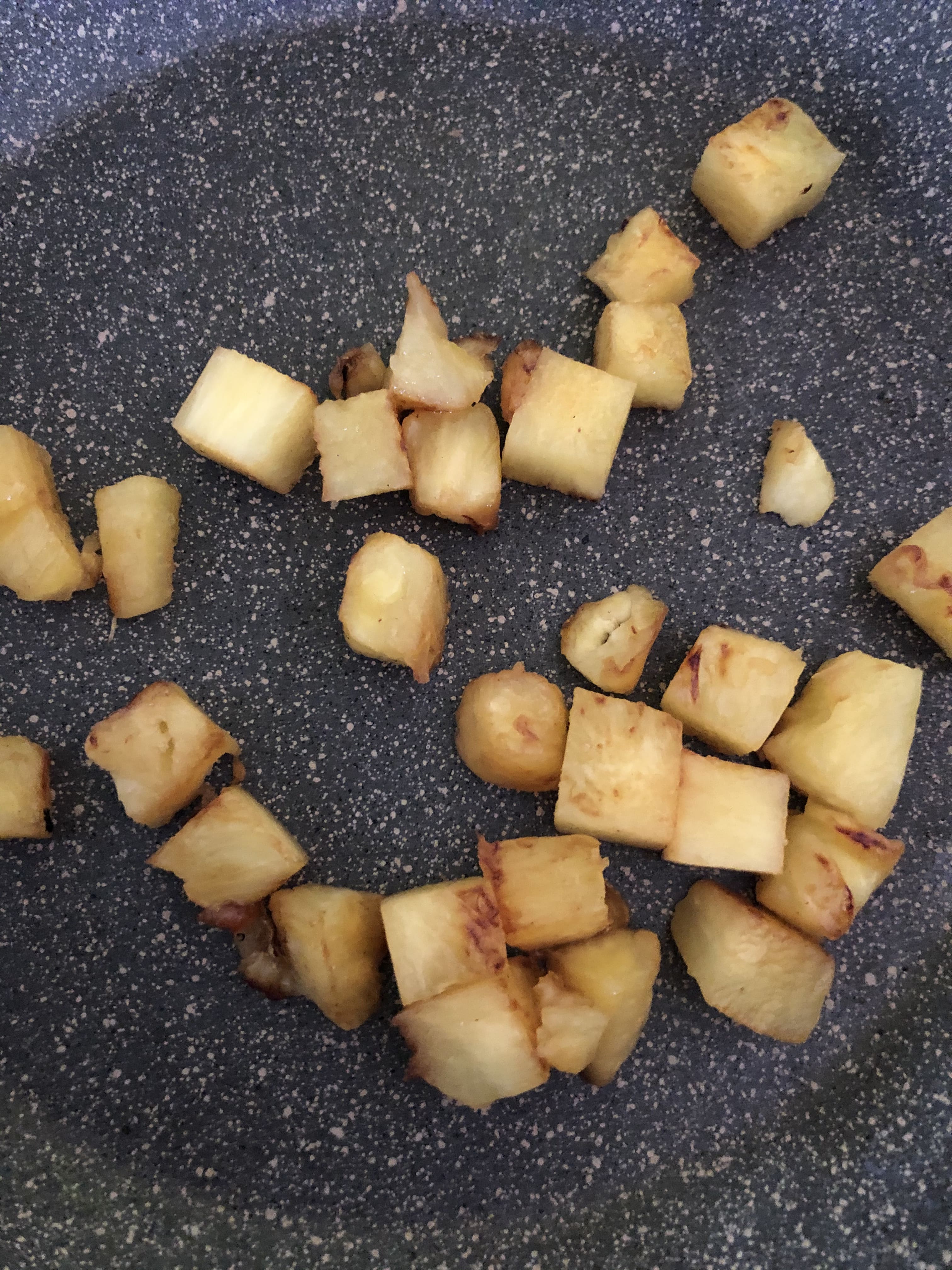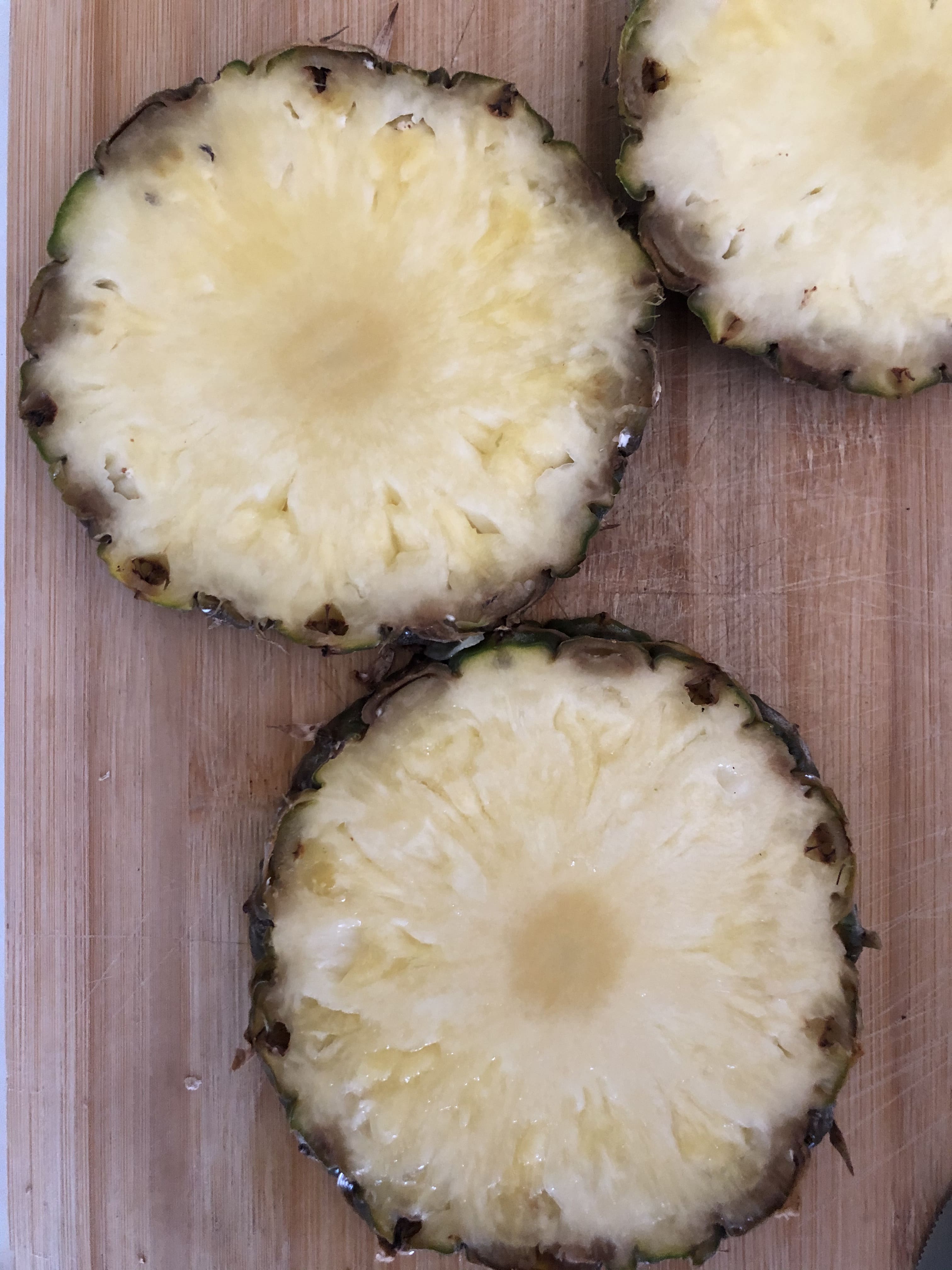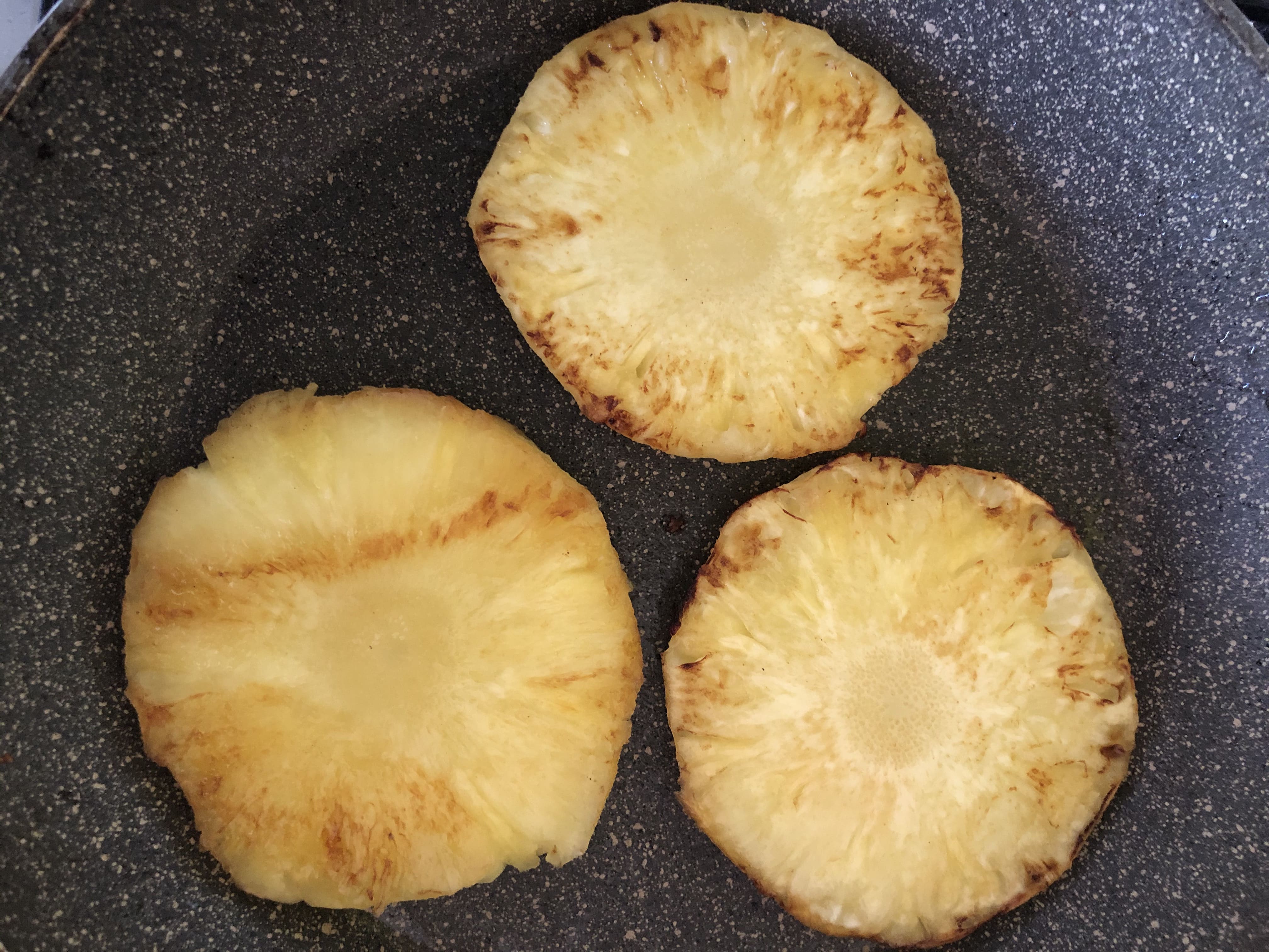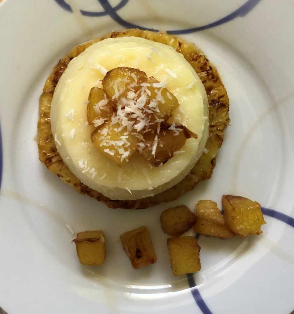 Antes de servir, corta la piña en rodajas (tantas como postres vayas a servir), de un centímetro de grosor. Elimina la parte externa. En una sartén vierte una cucharadita de aceite de coco y asa las rodajas de piña. Cuando estén doradas, ve añadiendo el azúcar y deja que se caramelice. No te he puesto cantidad de azúcar porque yo prefiero utilizar el mínimo posible, sólo lo justo.