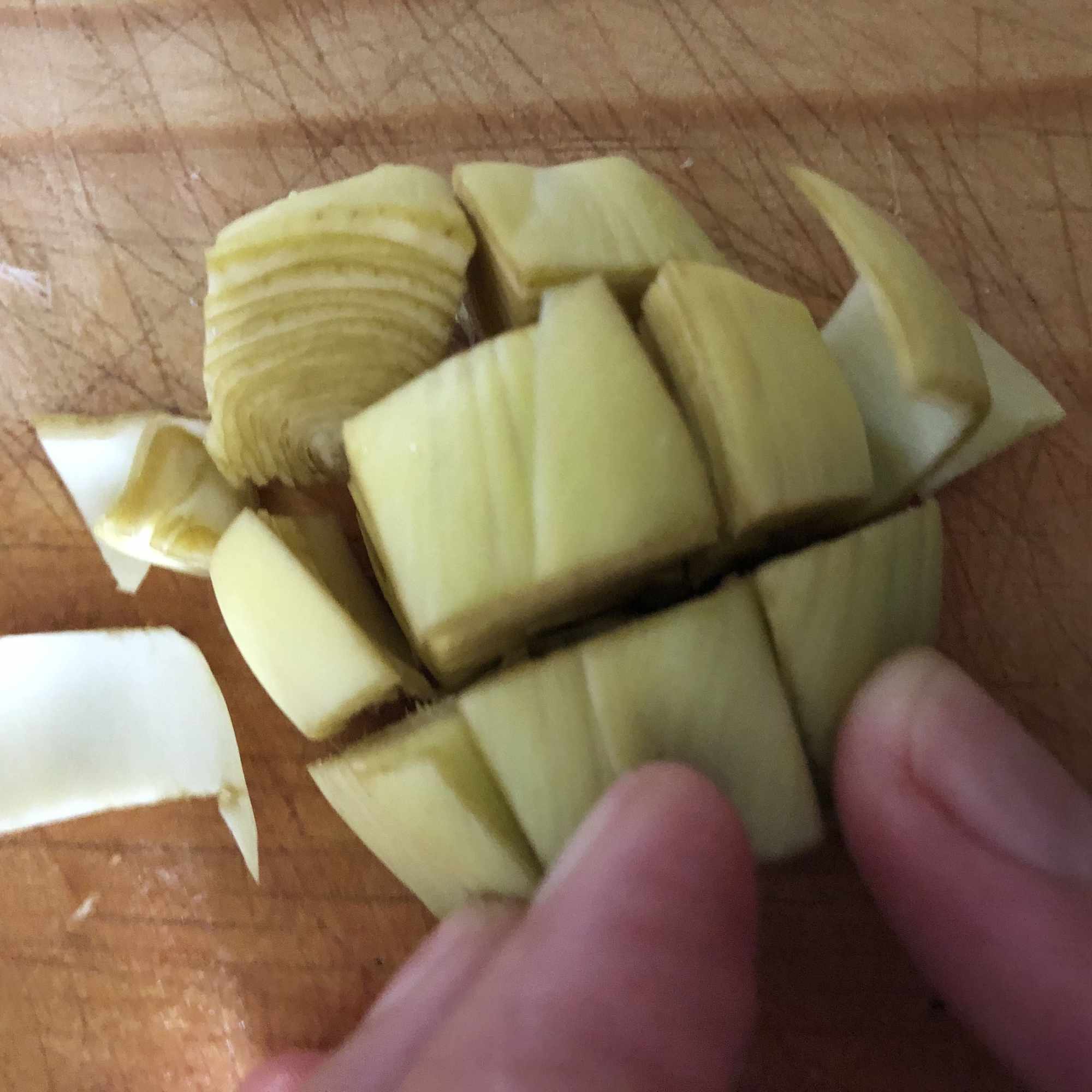 Prepara las verduras. Corta la cebolla en brunoise y el ajo finamente. Retira el tallo de las alcachofas y las hojas externas hasta llegar a la parte tierna (cuando las hojas se desprendan solas). Corta las puntas y cada alcachofa en 6-8 trozos.