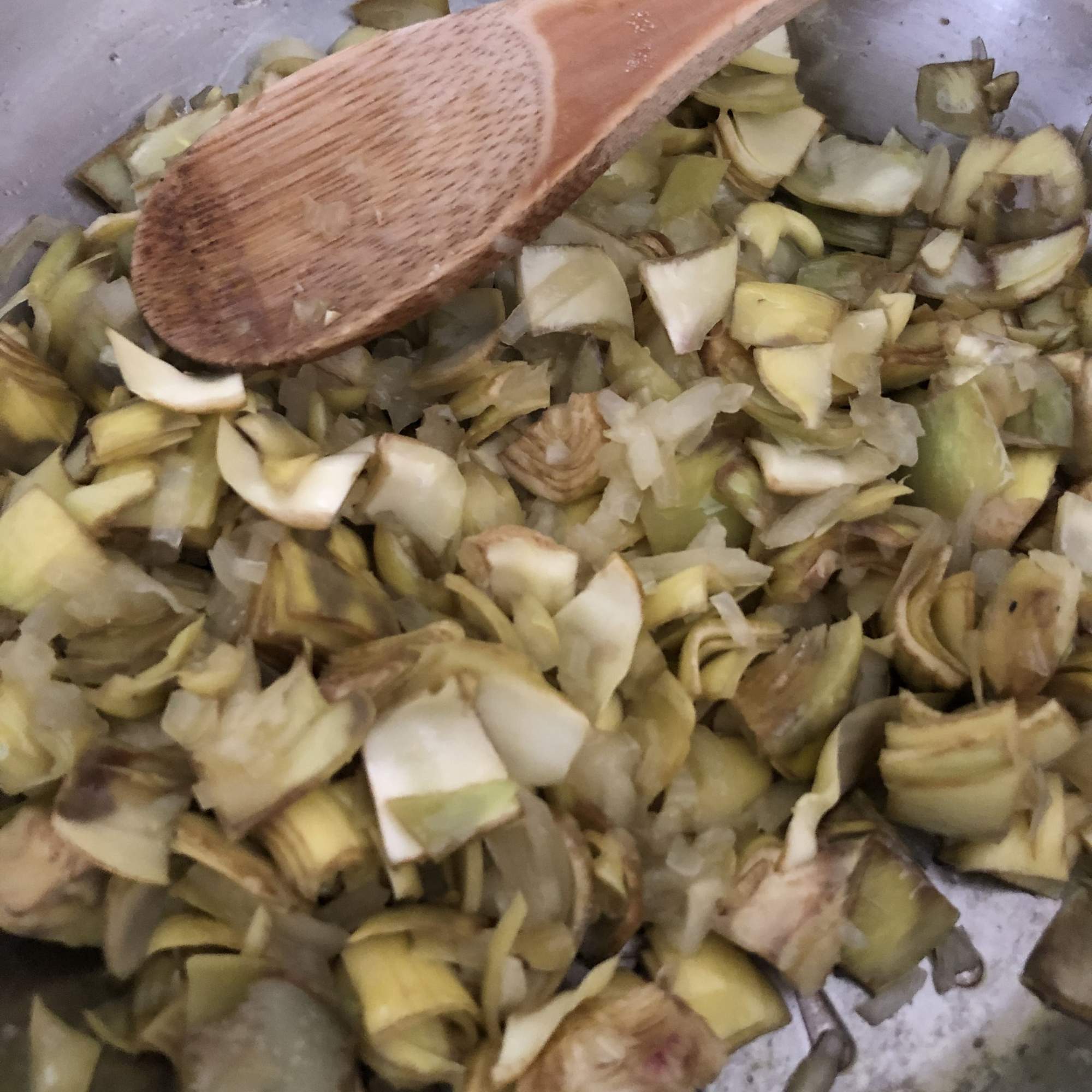 Vierte un poco de aceite en una sartén honda o una cazuela y pocha la cebolla. Cuando empiece a transparentar, agrega las alcachofas y rehoga unos minutos. Después añade al ajo y el trigo y sazona. Mezcla todo bien.