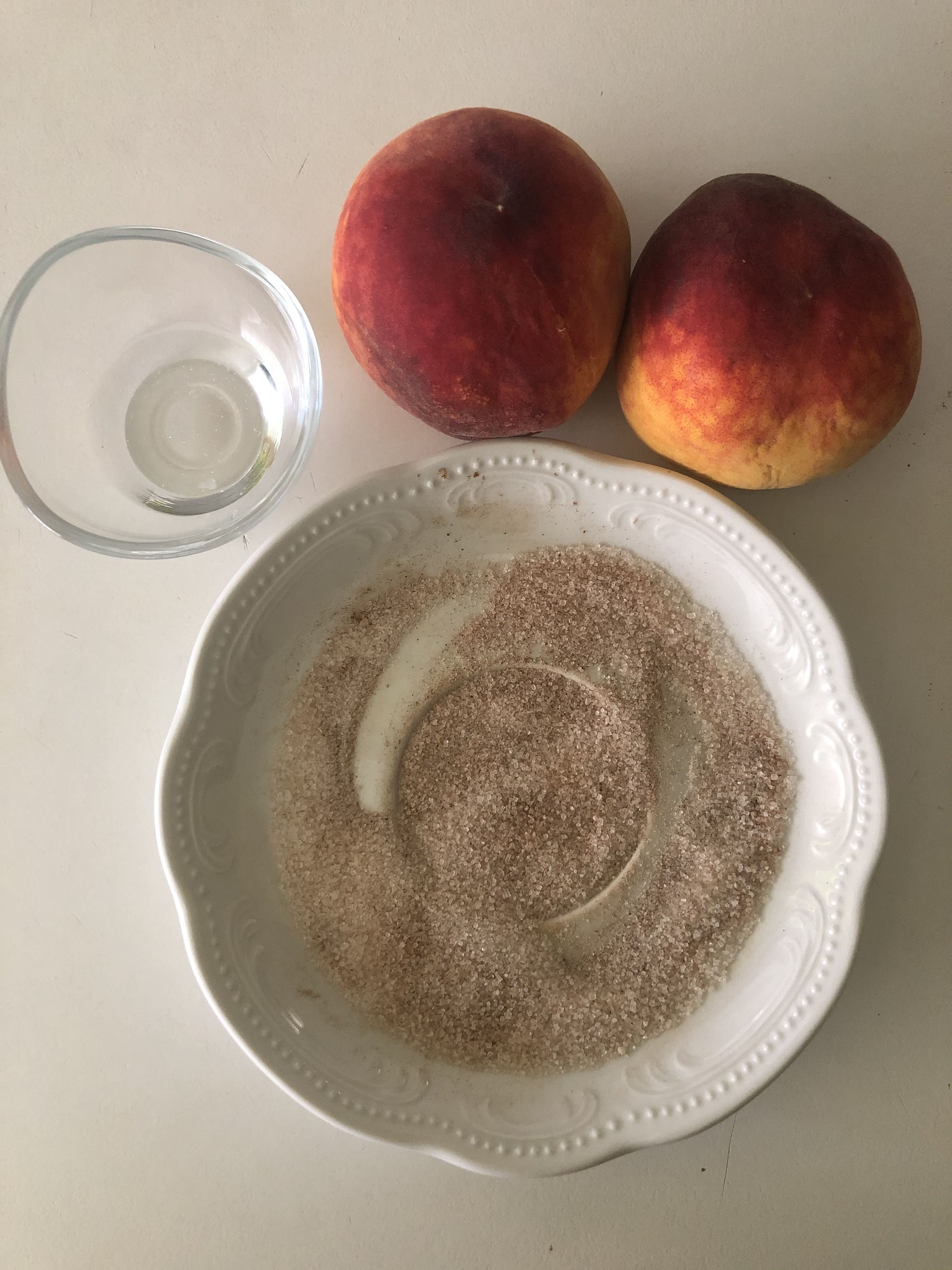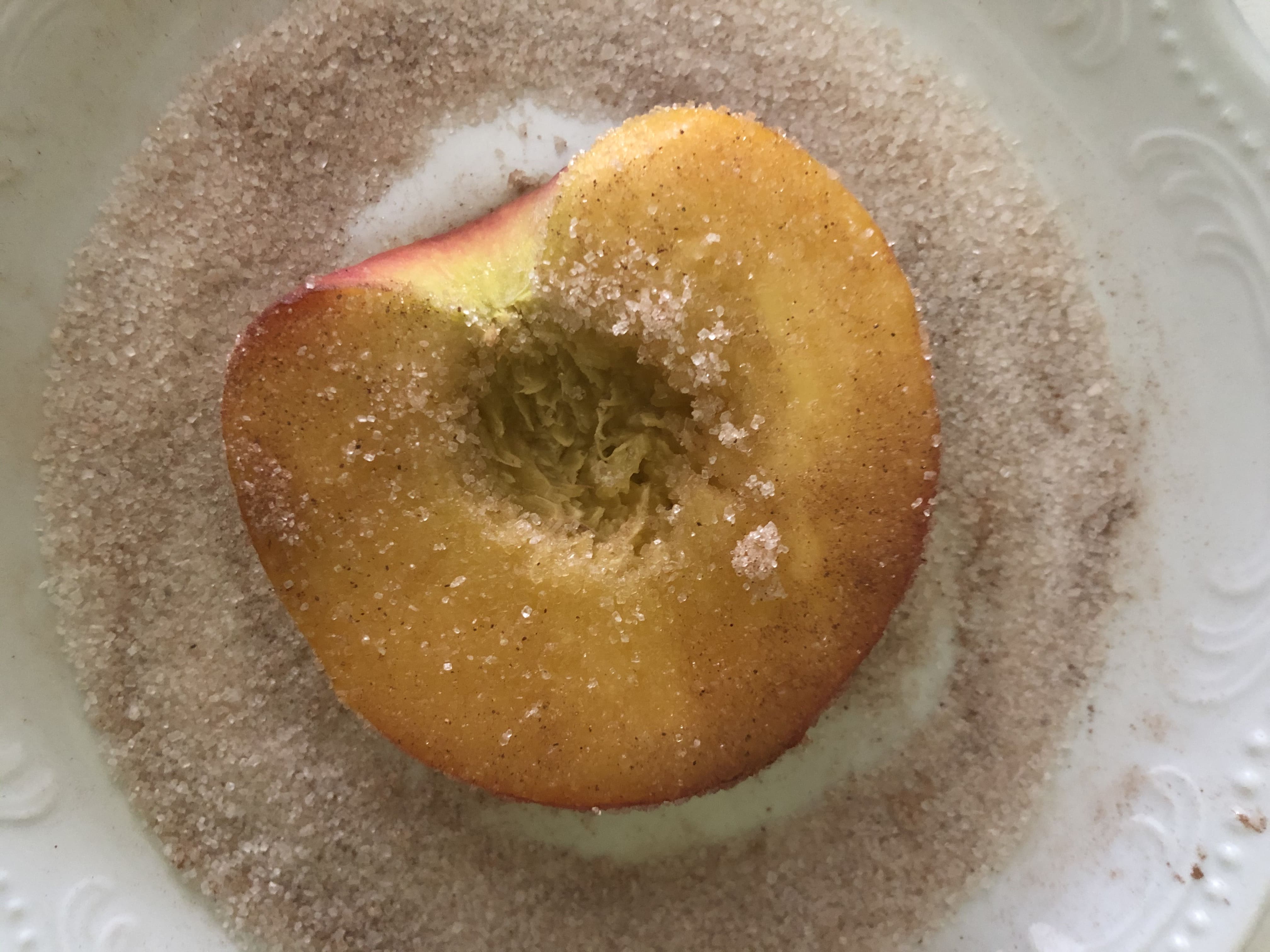 Lava bien los melocotones y seca con cuidado de no romper la piel. Corta a la mitad con un cuchillo y separa las dos mitades, girando despacio hacia los lados. Retira el hueso y corta cada mitad en dos. Prepara una mezcla con el azúcar y la canela y reboza los trozos de melocotón.