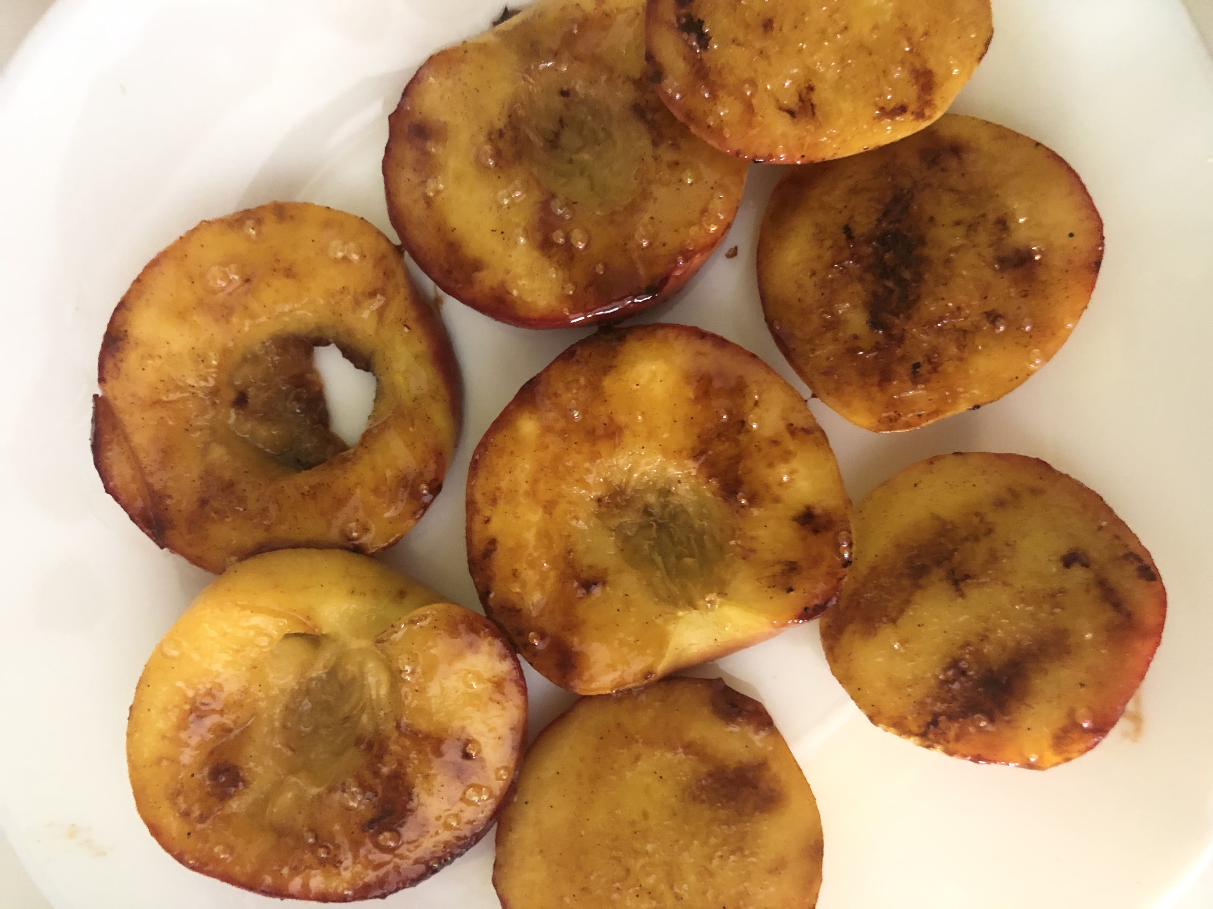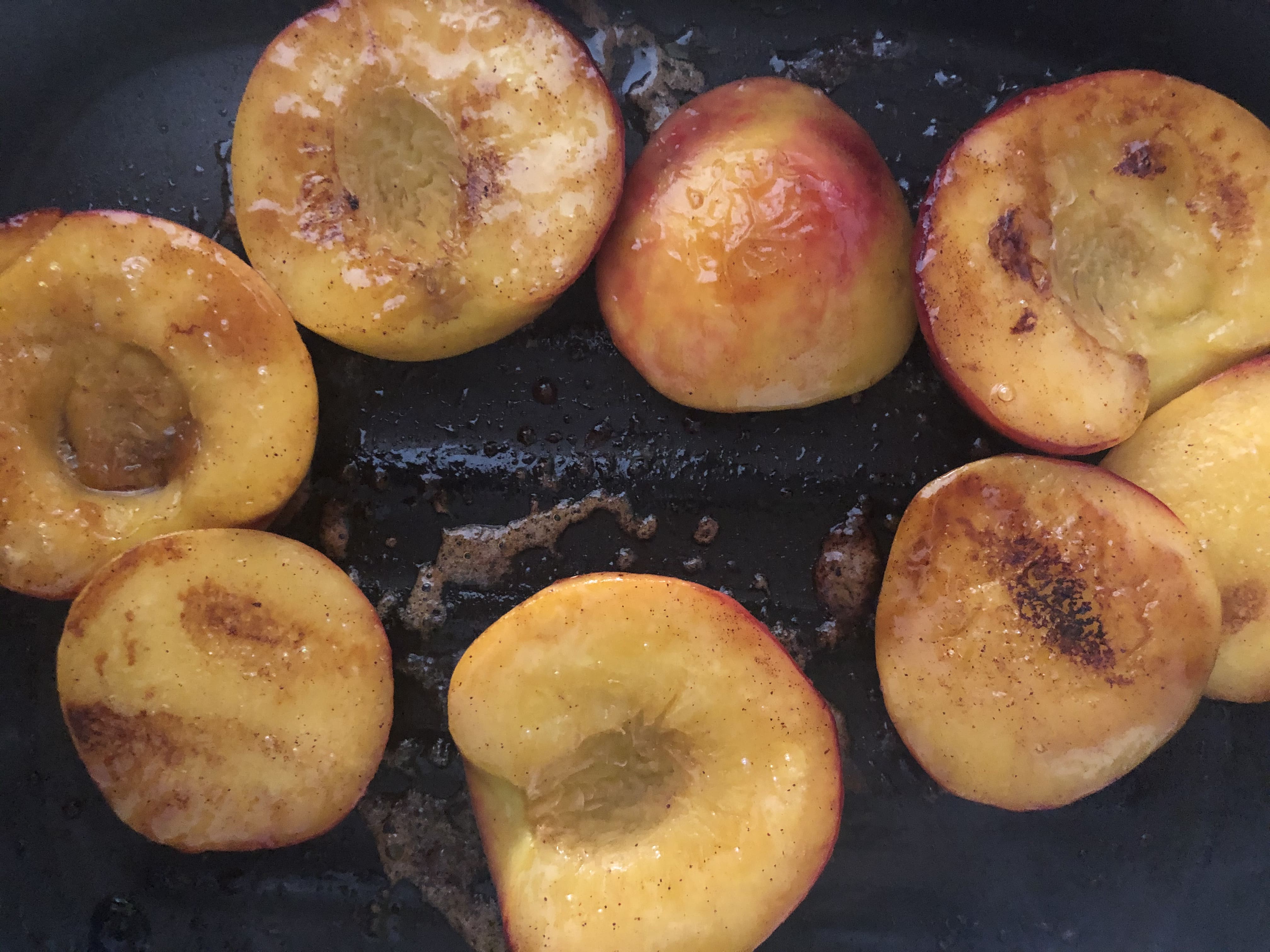 En una sartén o asador, vierte el aceite de coco y asa los melocotones a fuego lento. Déjalos unos 3 minutos por cada lado, hasta que se doren y notes que estén blanditos. Retira y deja enfriar.
