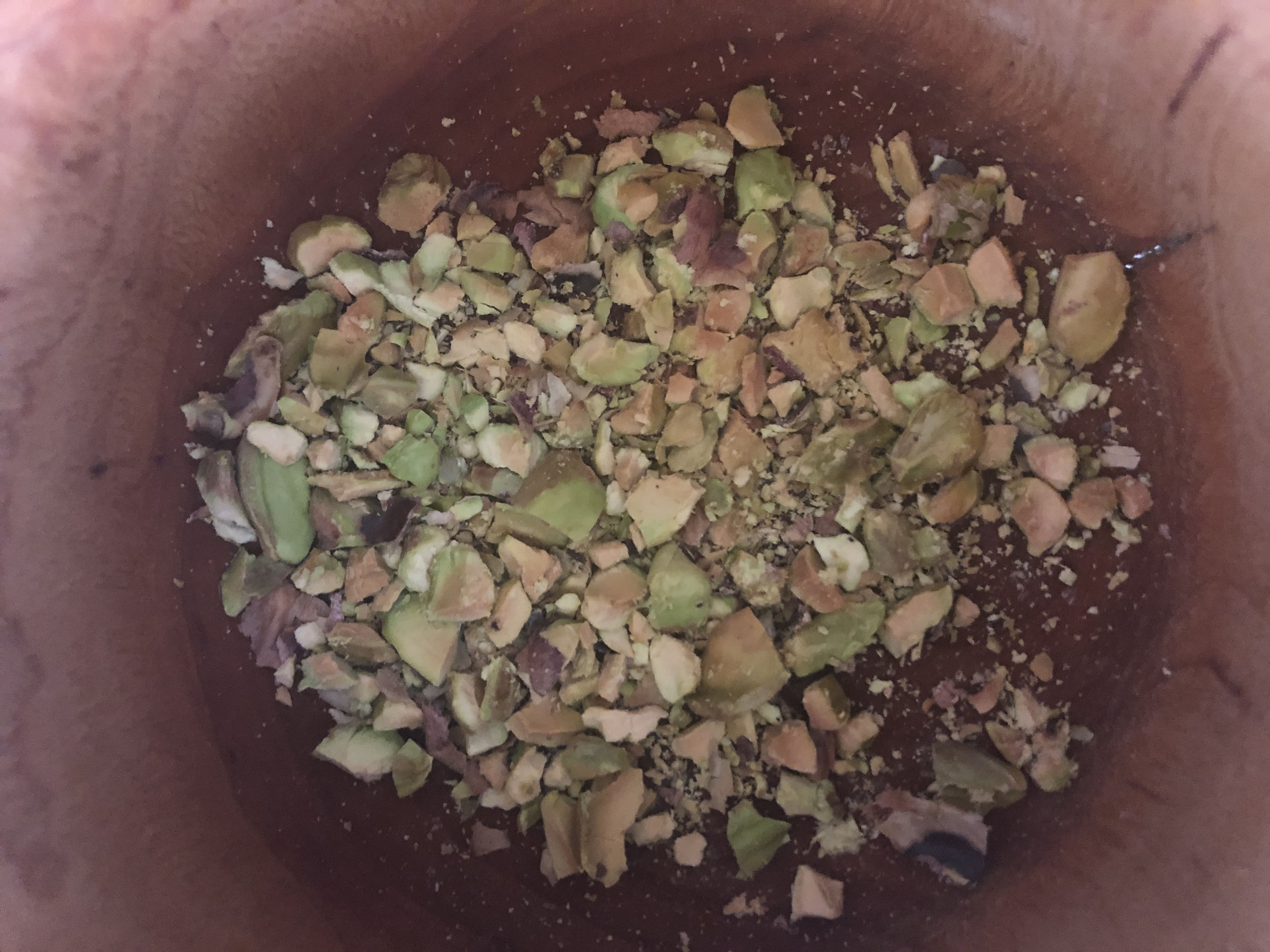Exprime el medio limón y añade el zumo a la sartén donde has hecho los melocotones. Agrega los arándanos y deja reducir unos minutos a fuego medio. En un mortero, tritura los pistachos y reserva para emplatar.