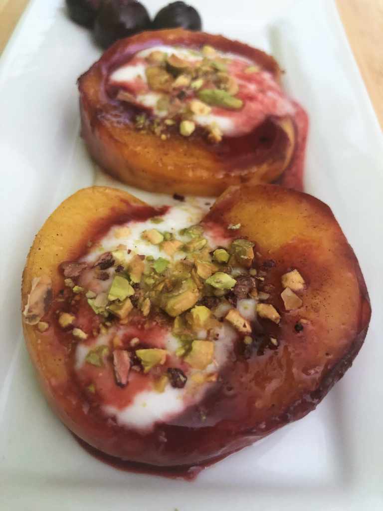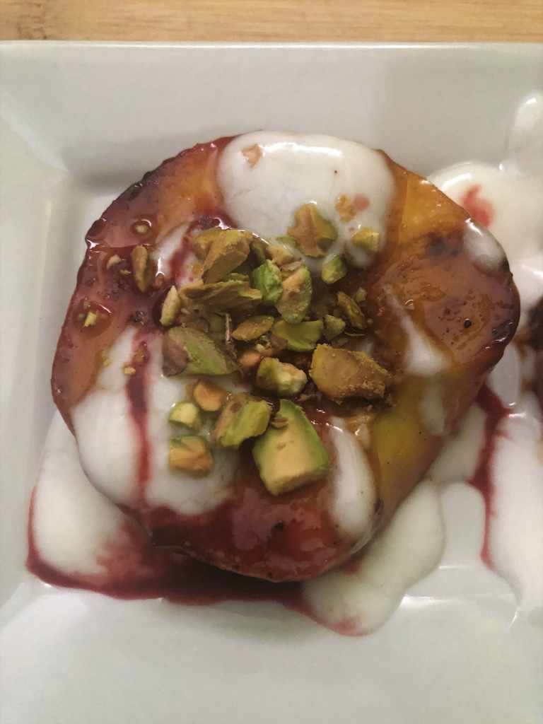 MELOCOTÓN ASADO CON YOGUR Y SALSA DE ARÁNDANOS