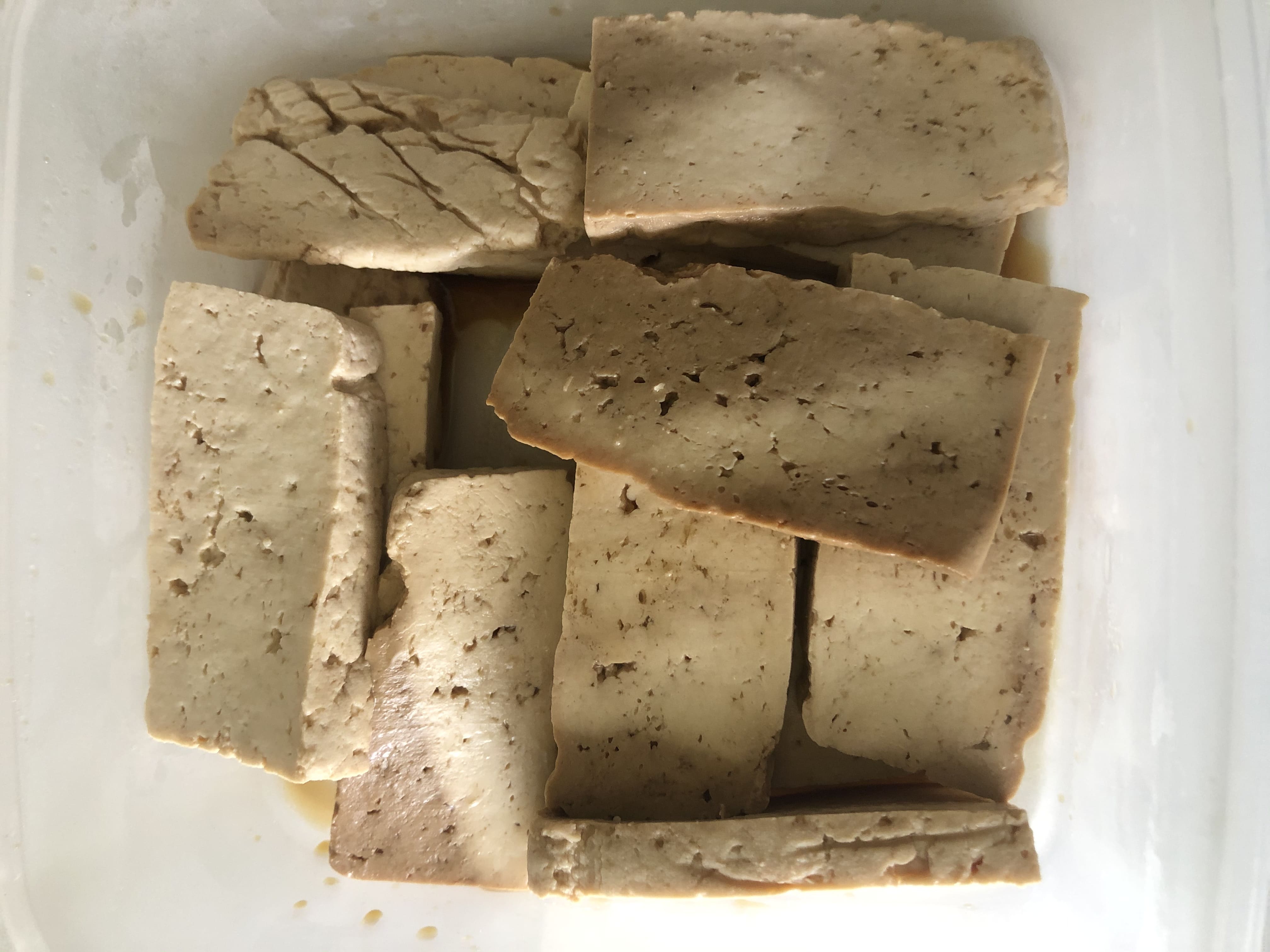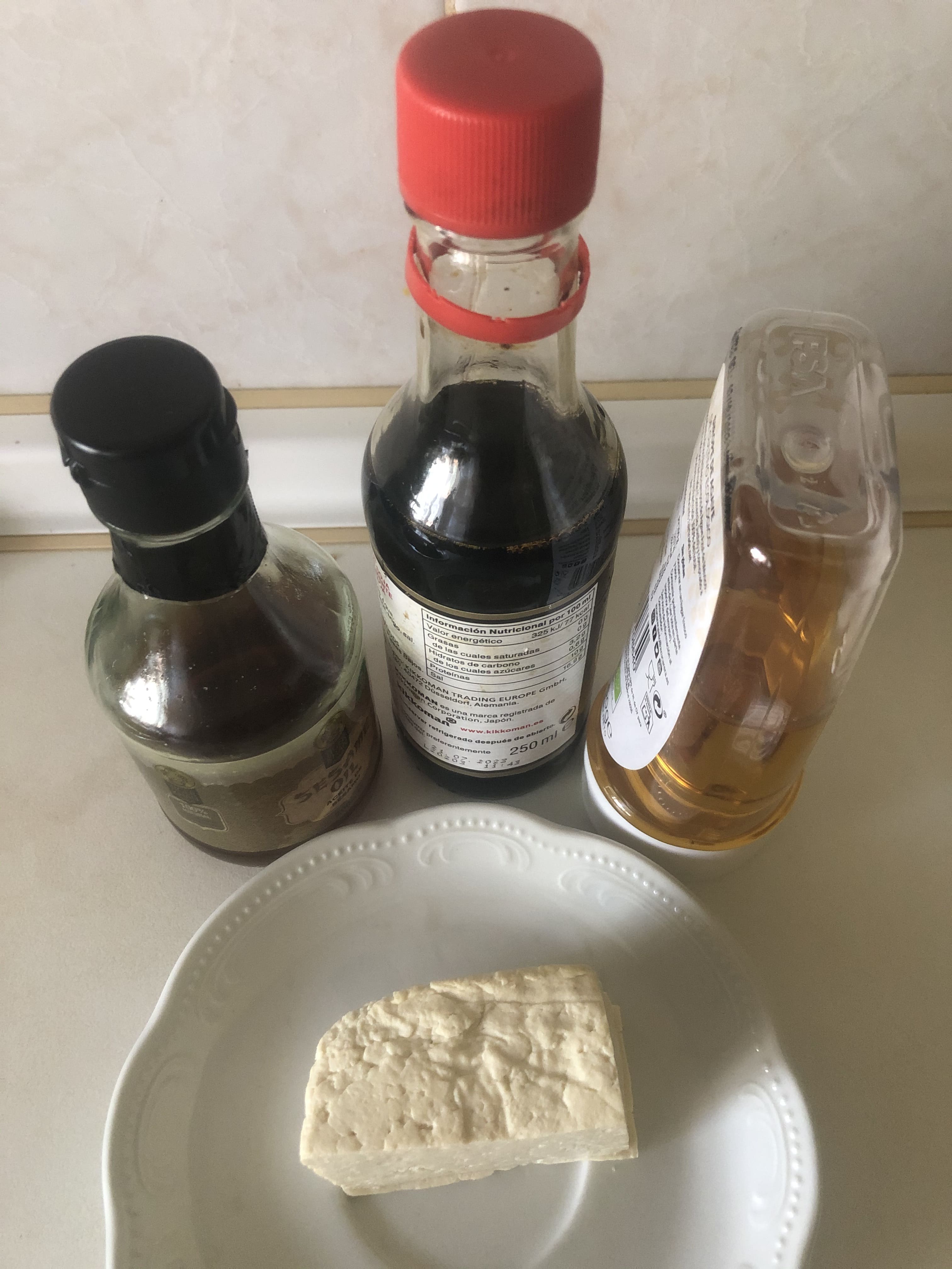 Prepara la marinada mezclando todos los ingredientes. En un tupper, coloca las rebanadas de tofu y la marinada. Tapa y deja marinar unos 30 minutos o más (a más tiempo, más sabor).