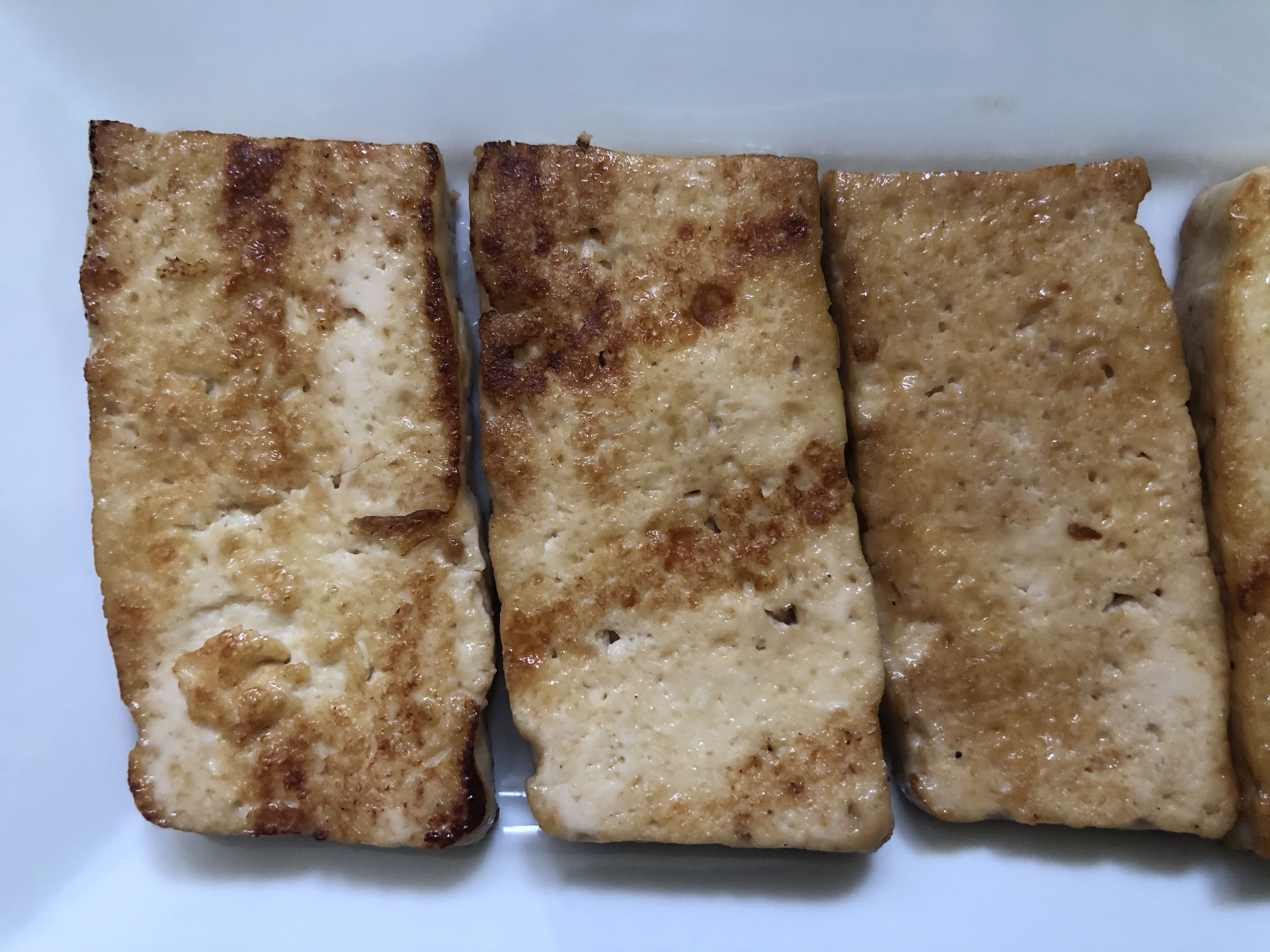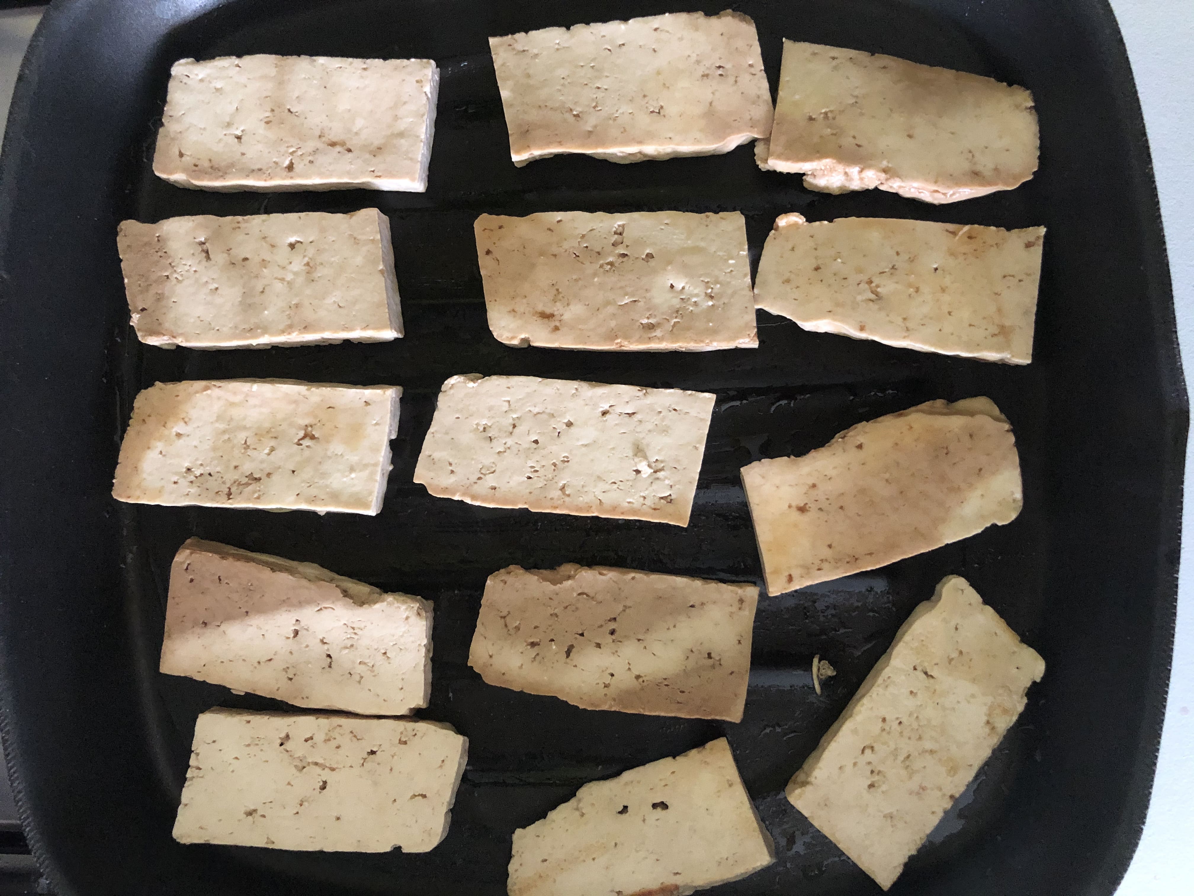 Corta el tofu en rebanadas no muy gruesas (aunque esto va al gusto, yo las prefiero finitas).