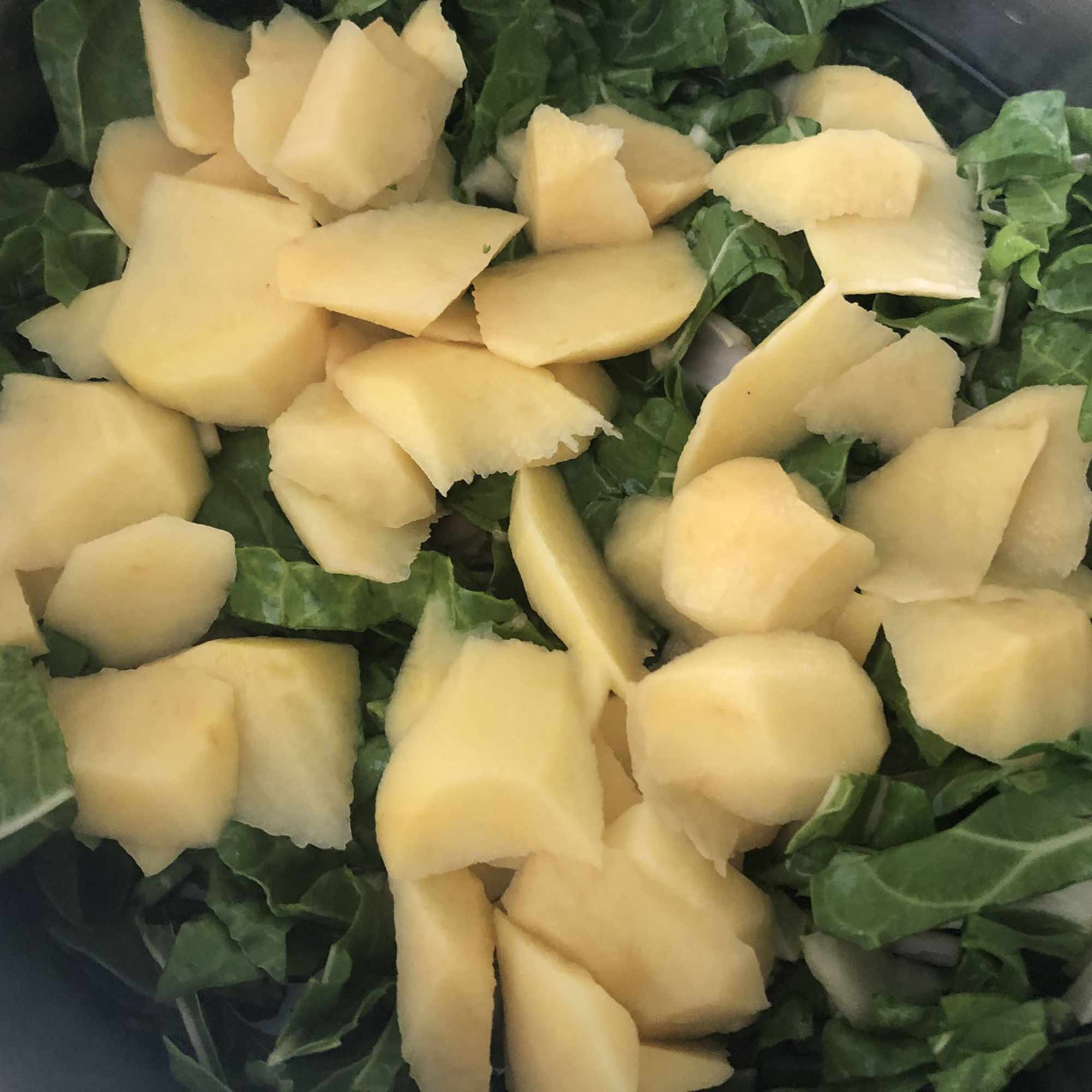 Lo primero que haremos será lavar bien las acelgas y picarlas (tanto la hoja como la penca), en trozos de tamaño mediano. Pela la patata y córtala en trozos también medianos.