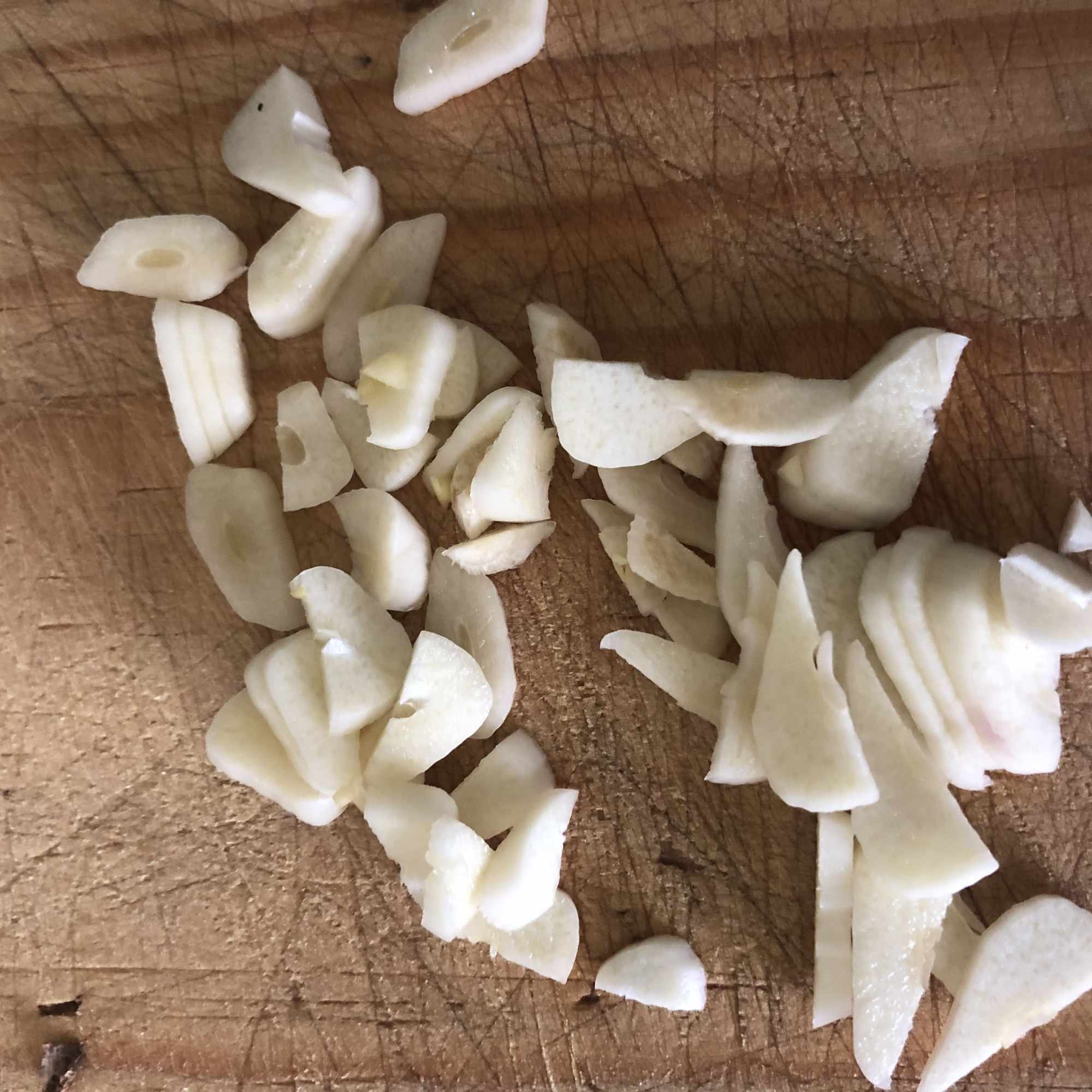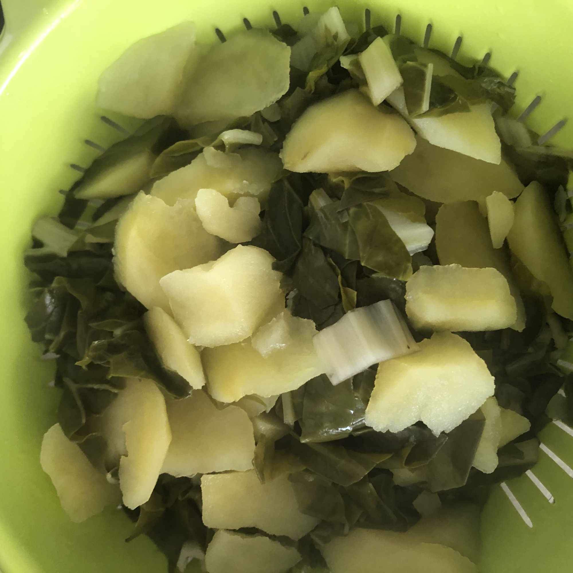 Pon agua con sal a cocer en una cazuela o en la olla (si quieres ir más rápido), agrega las acelgas y la patata y cuece hasta que esté tierna (unos 30 minutos). Escurre y reserva. Pelas los ajos y córtalos en láminas.