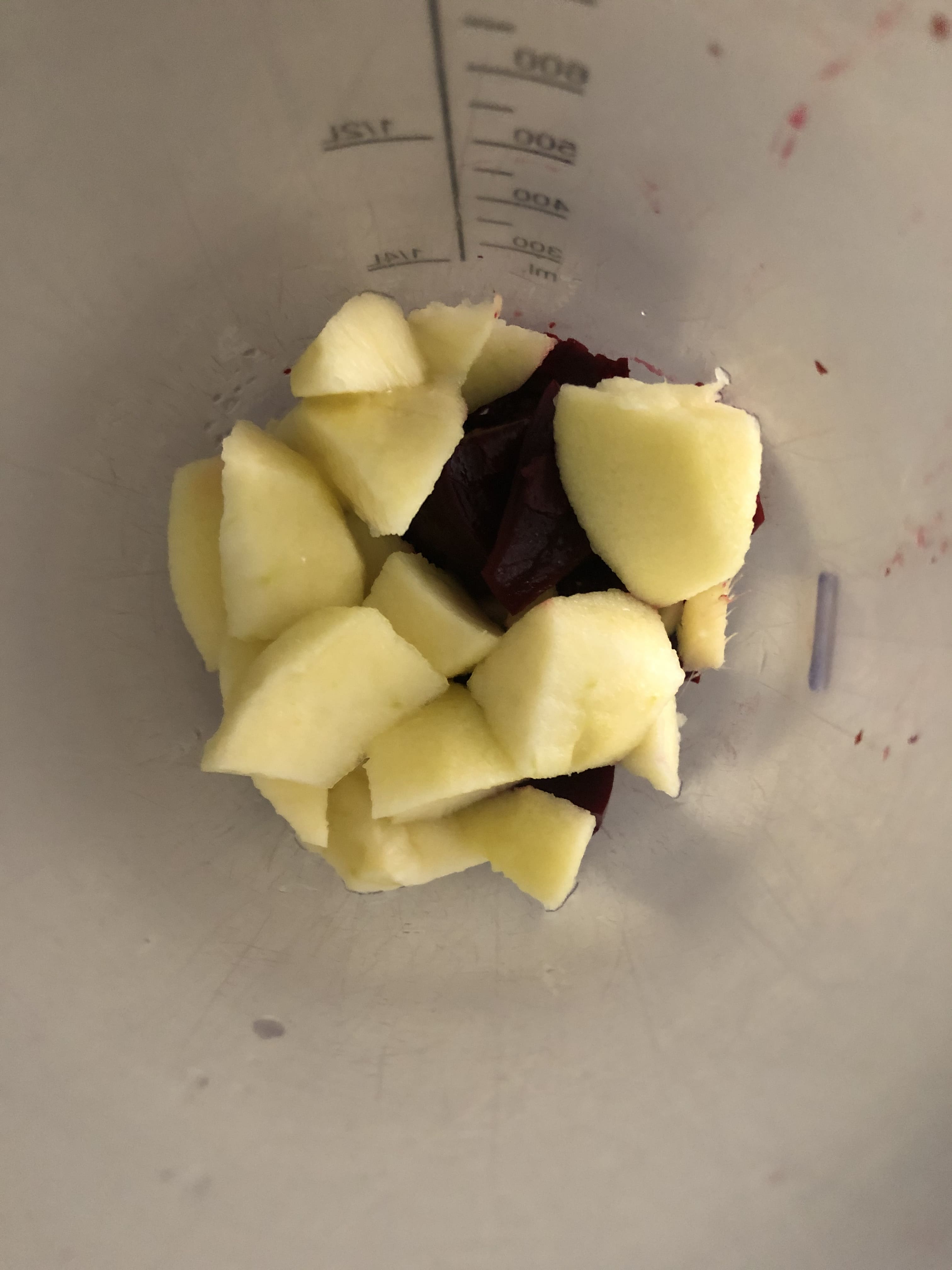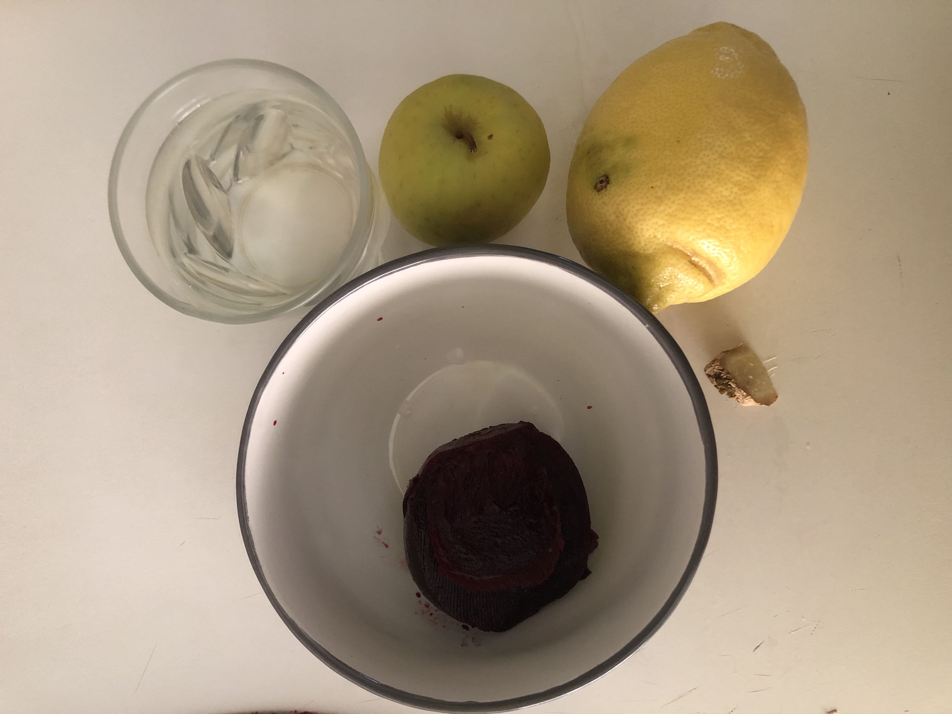 Vas a necesitar hacer zumo, así que si tienes una licuadora es pan comido. Si no es así, mezcla la remolacha, la manzana, el zumo de limón y el jengibre en el vaso de la batidora. Añade el agua y tritura todo bien. Extrae el zumo: puedes ayudarte de un colador o una bolsa de tela para leches vegetales. Reserva la pulpa.