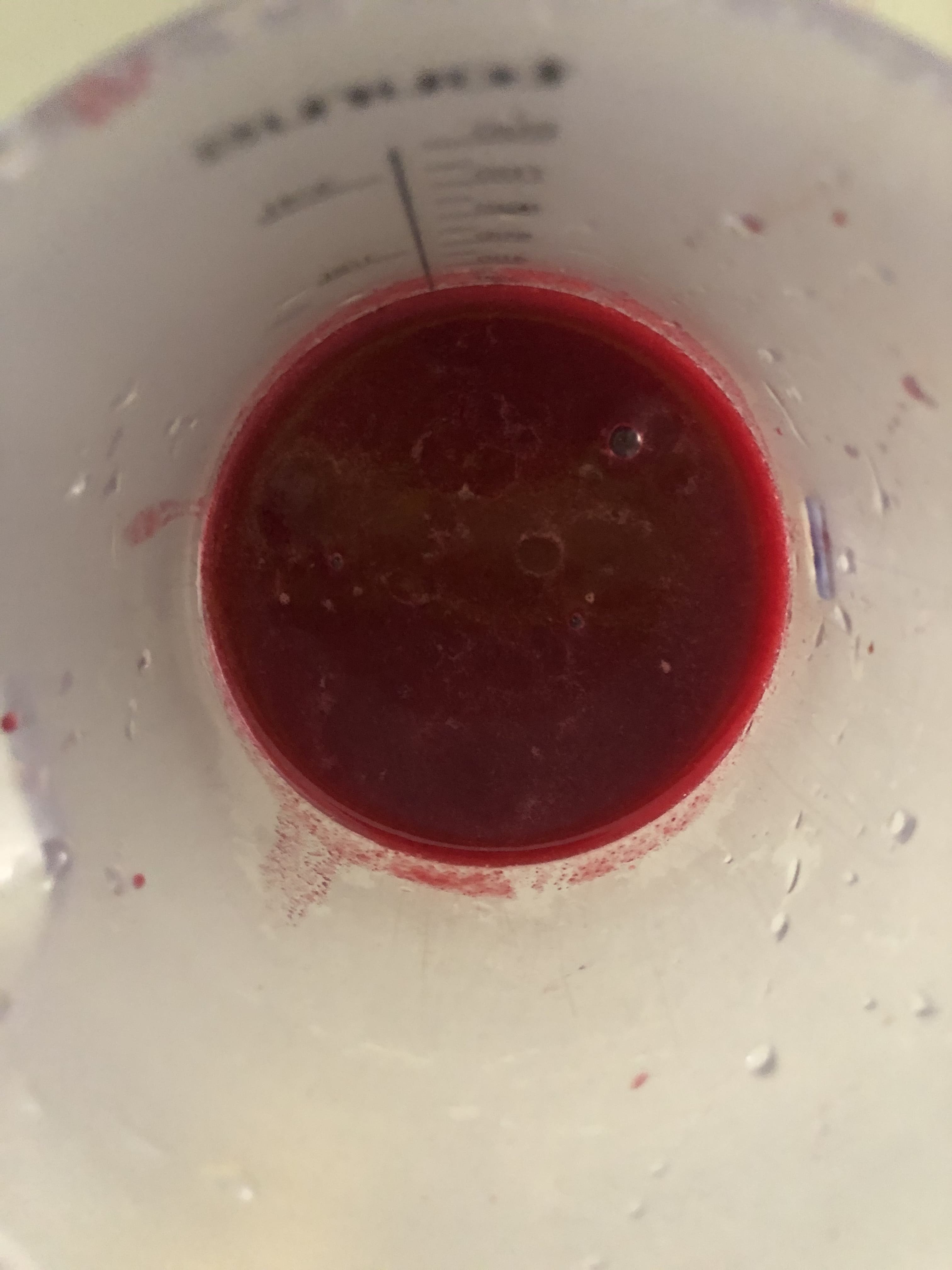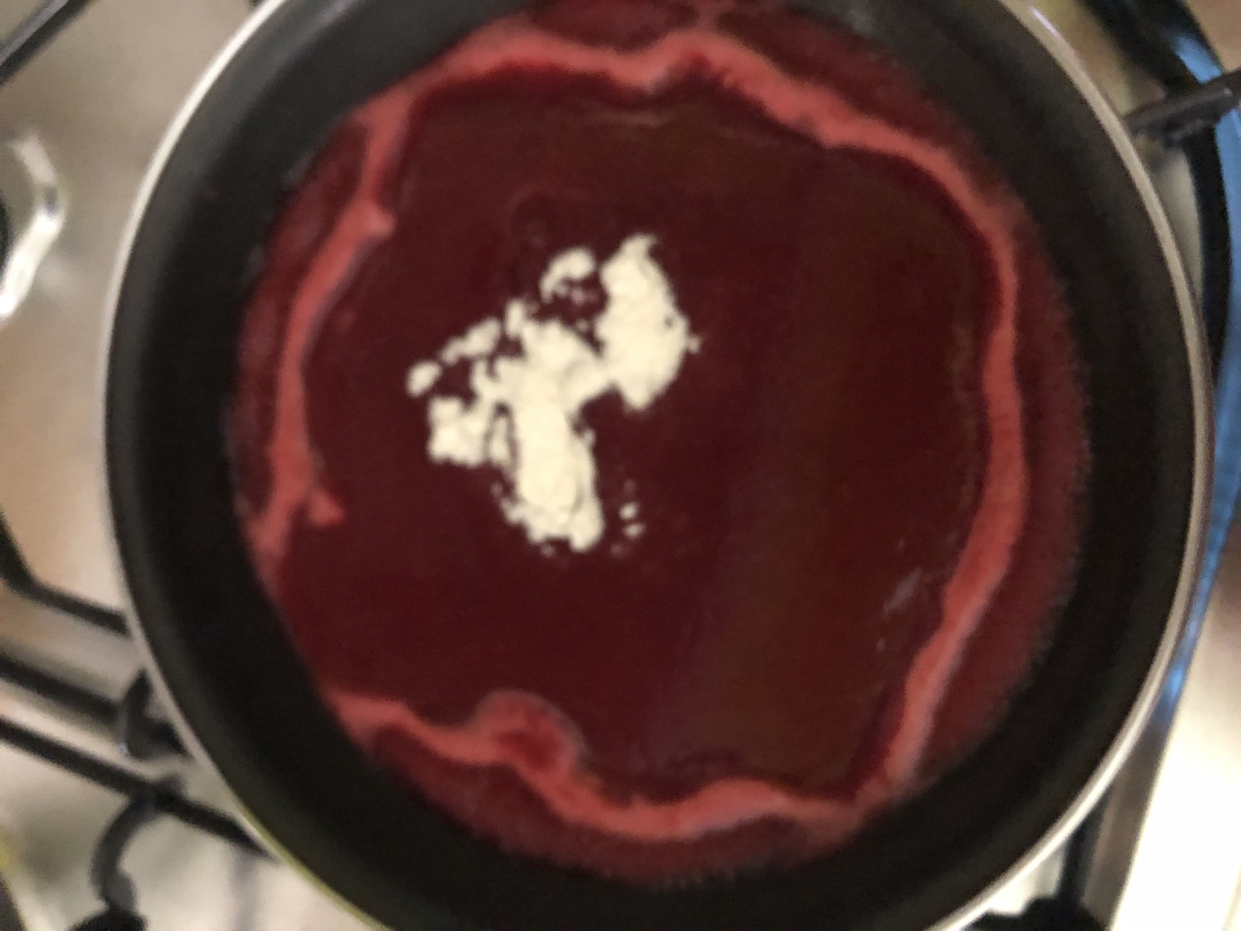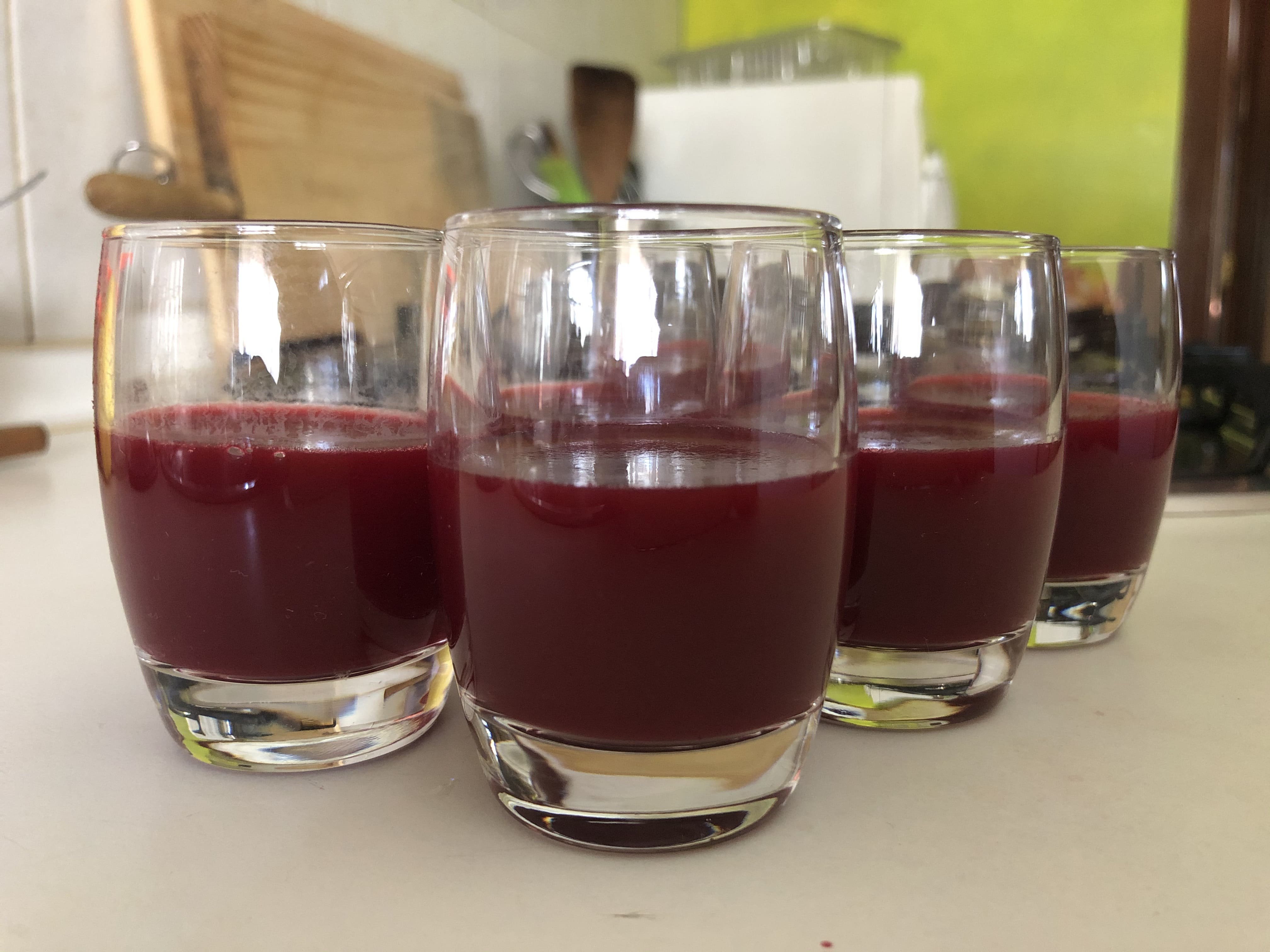 Pon el zumo en un cazo al fuego (conseguí 300 ml) y agrega una cucharadita de postre rasa de agar agar (no tengo báscula de precisión, así que no puedo decirte cantidad exacta). Mezcla con unas varillas y cuando empiece a hervir, deja cocer un par de minutos. Retira del fuego y sirve en vasitos de chupito (he hecho 6). Enfría durante unos 15 minutos.
