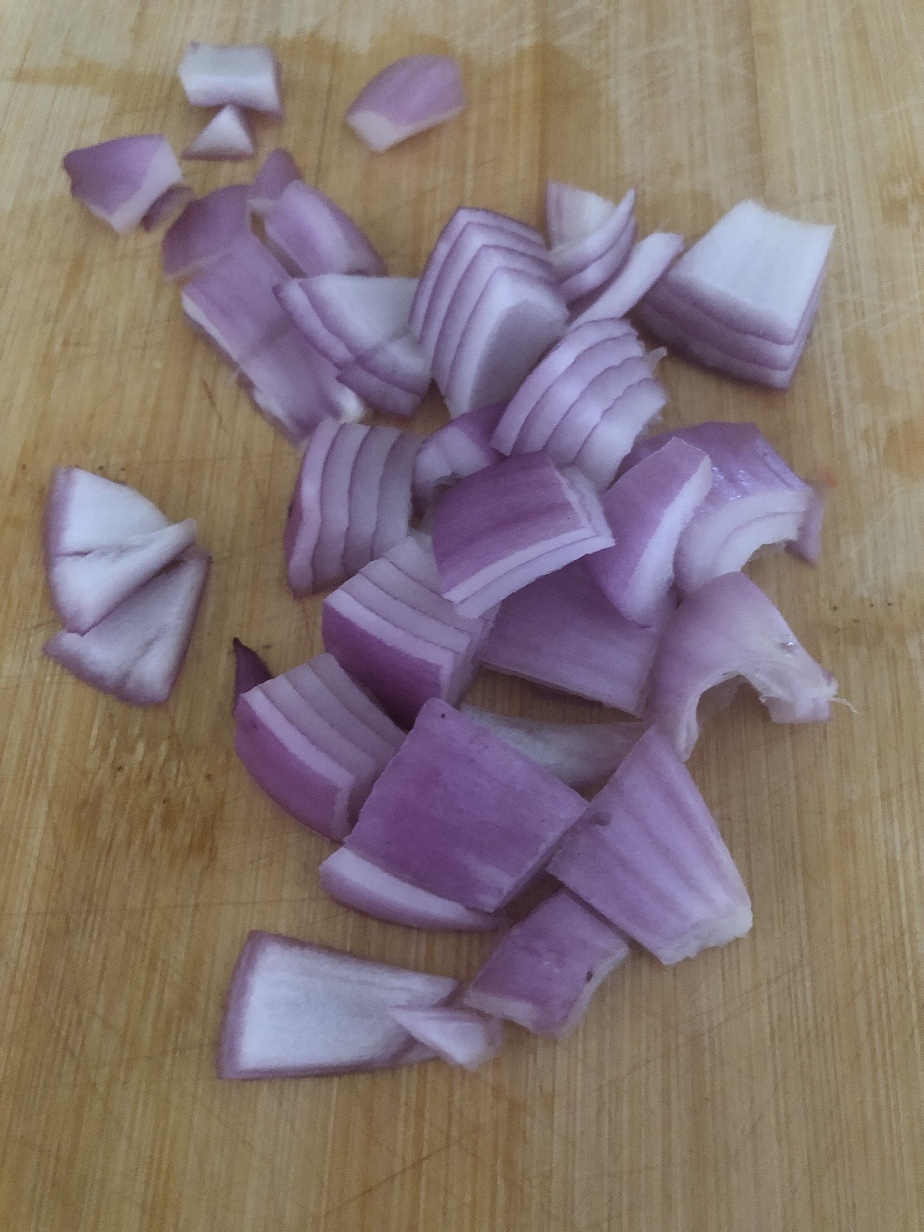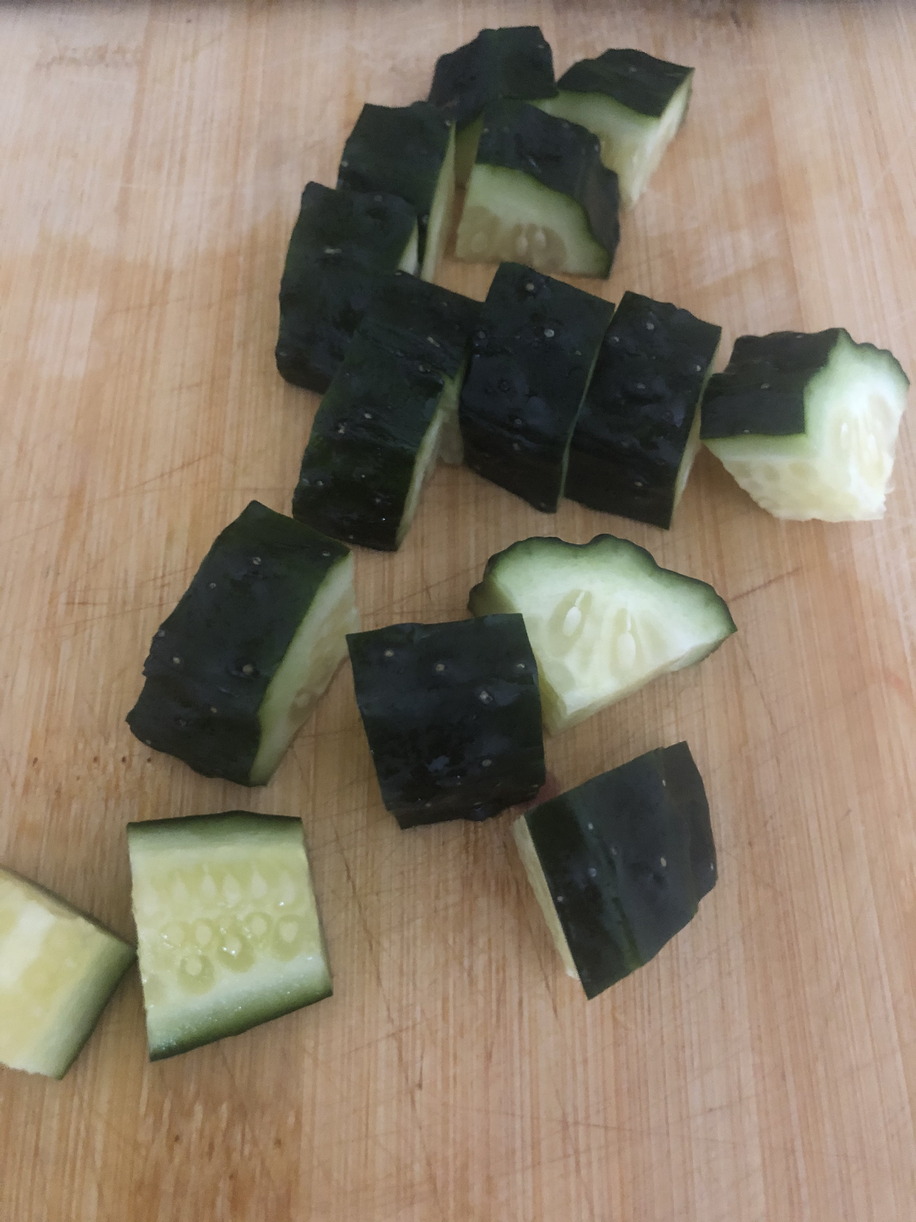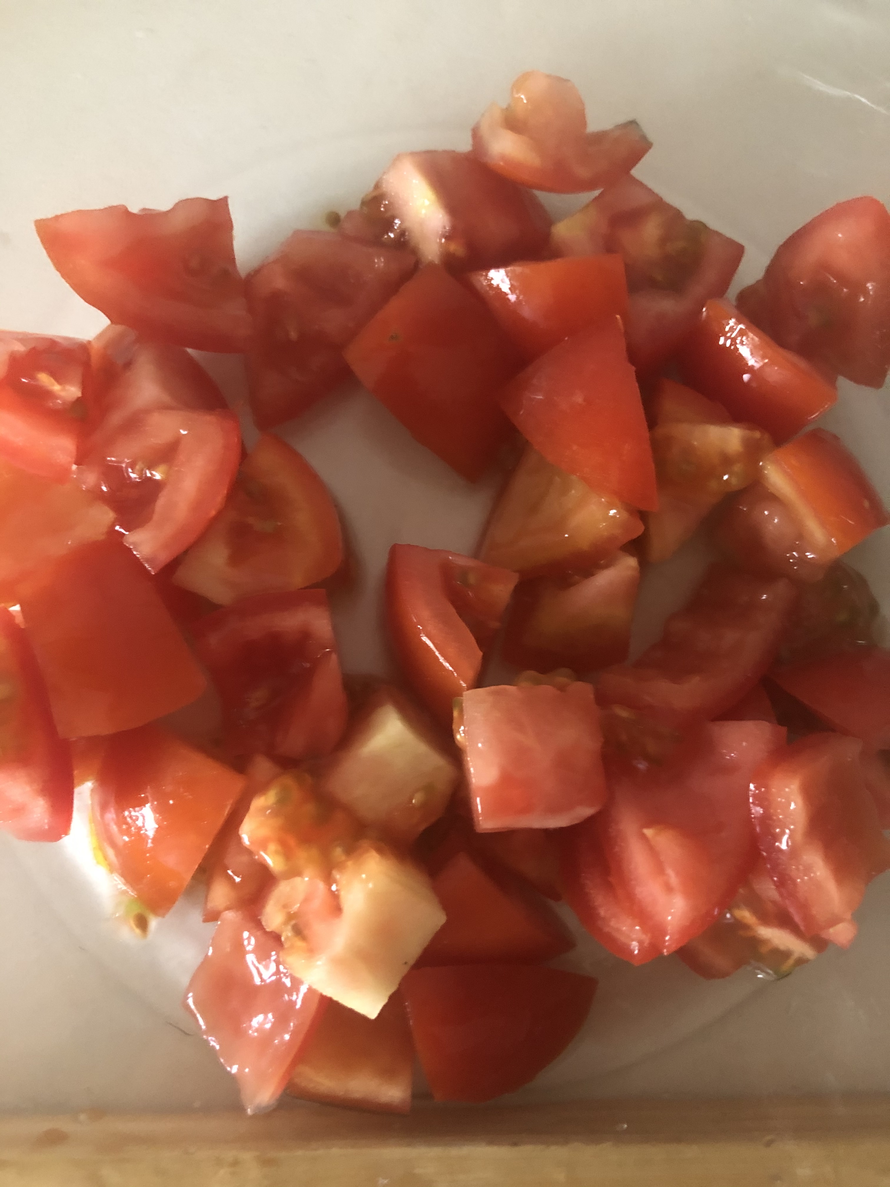Lava los tomates y córtalos en cubos. Haz lo mismo con el pepino. Corta la cebolla en trozos medianos.