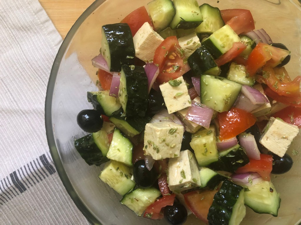 Hoy os traigo una receta muy simple inspirada en la ensalada griega, pero apta para todos los públicos, ya que es vegana y sin gluten. Además, es otra manera de consumir tofu. Así que, si aún no habéis aprovechado todas sus propiedades, creo que esta es una buena oportunidad para hacerlo.