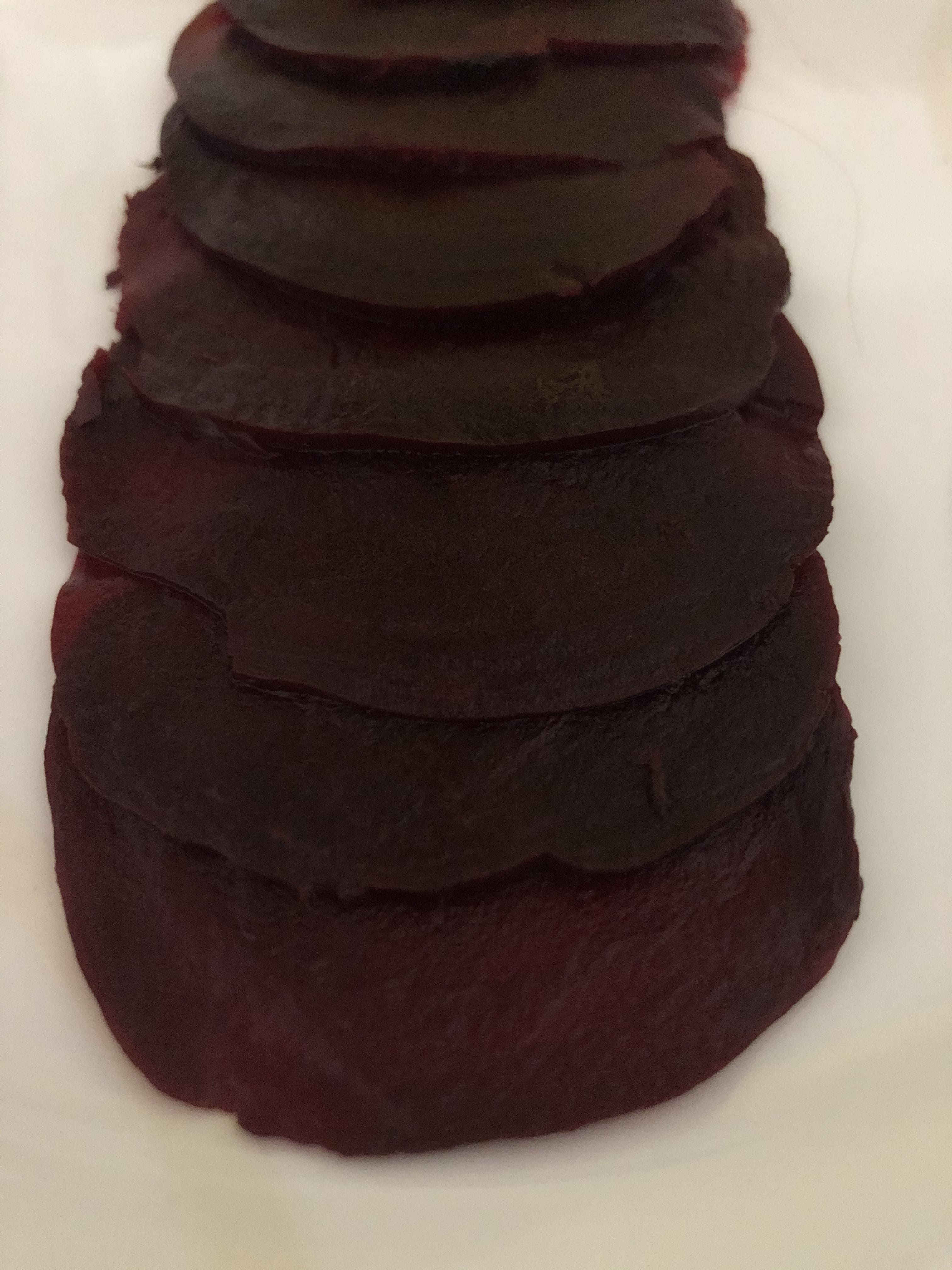 Así que la alternativa de hoy es ideal para mí (aparte de ser genial para personas veganas), ya que está elaborada a base de remolacha. Intenté varias veces realizar el plato con láminas finas de cada ingrediente, pero me resultó imposible. Si tienes una mandolina, será mucho más fácil, al igual que si tienes un poco más de arte que yo con un buen cuchillo jejeje. Y este ha sido el motivo por el que utilizo remolacha cocida en lugar de cruda, es más fácil de manipular.