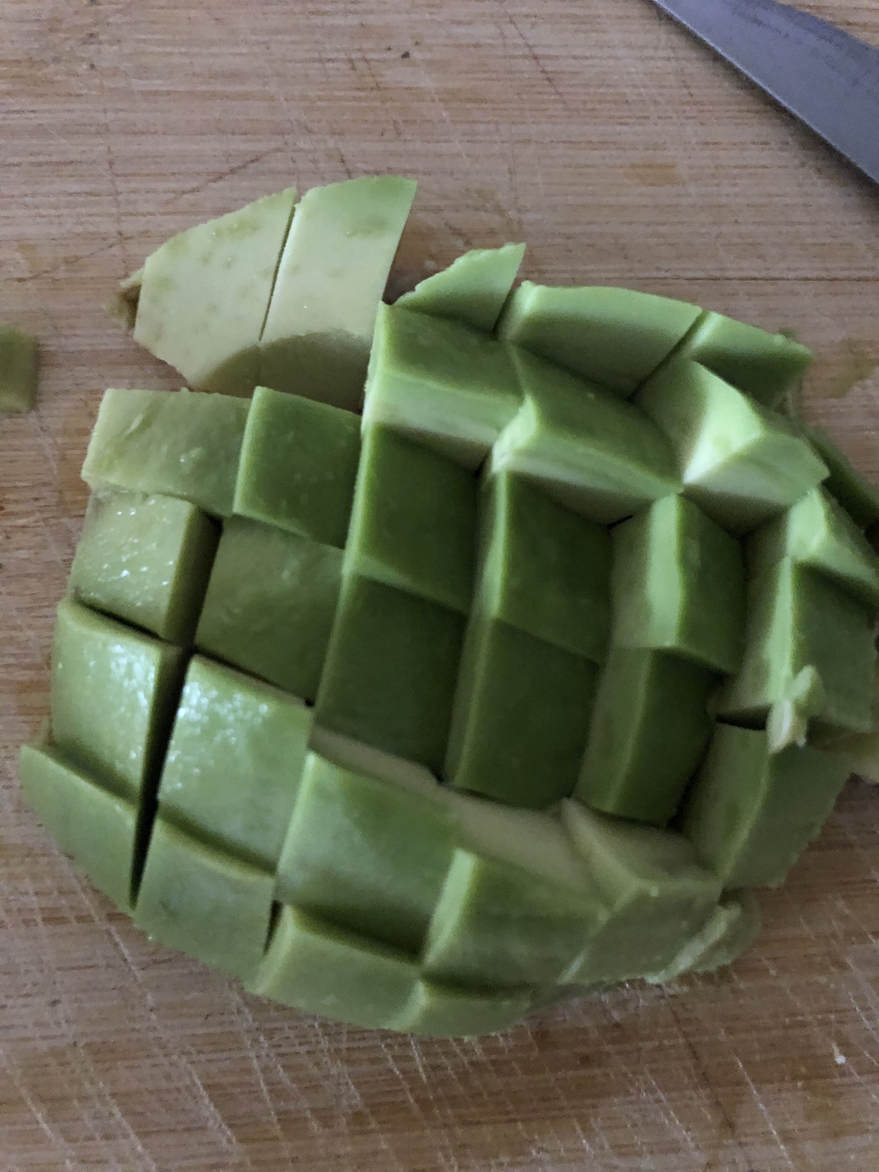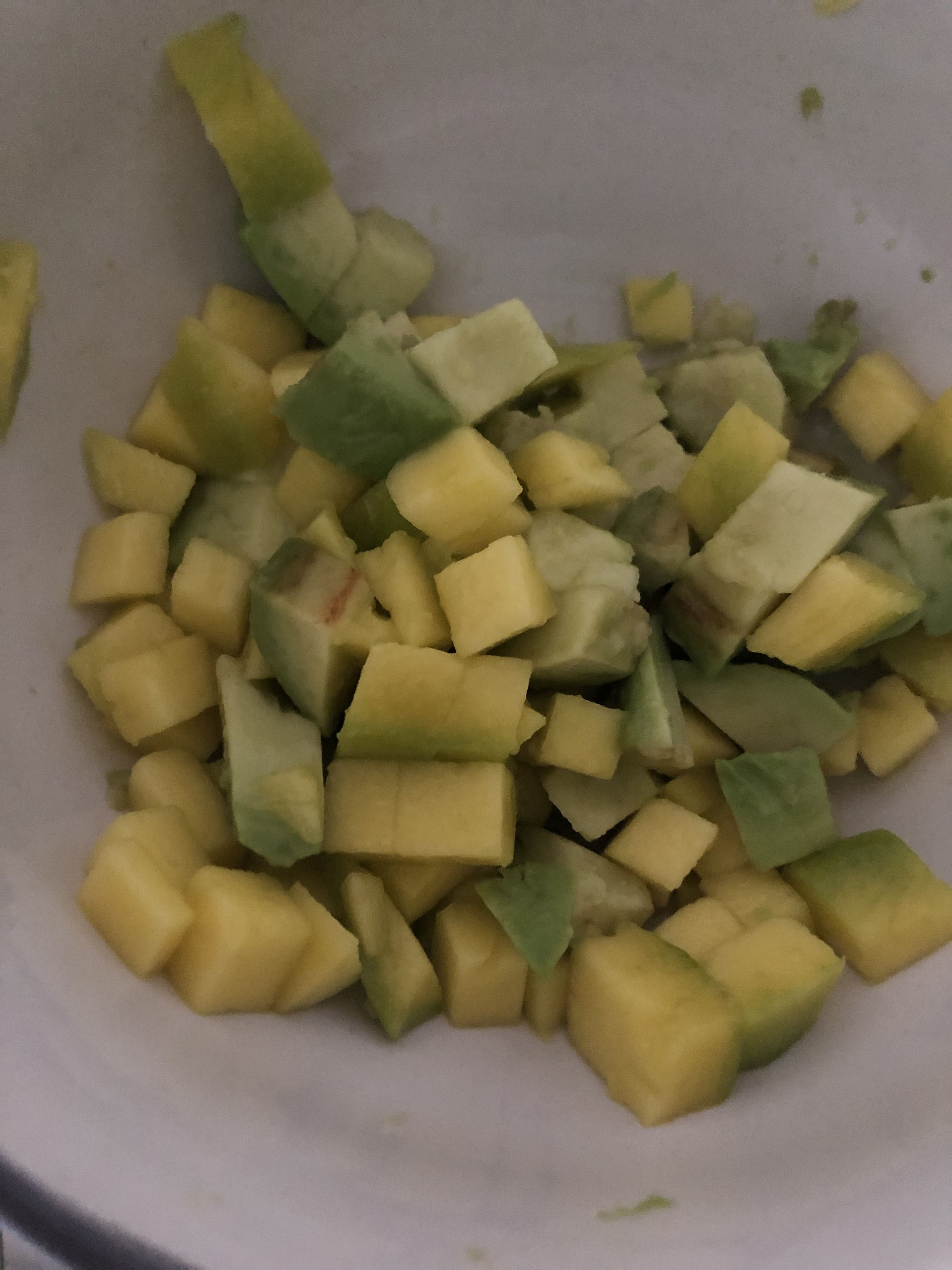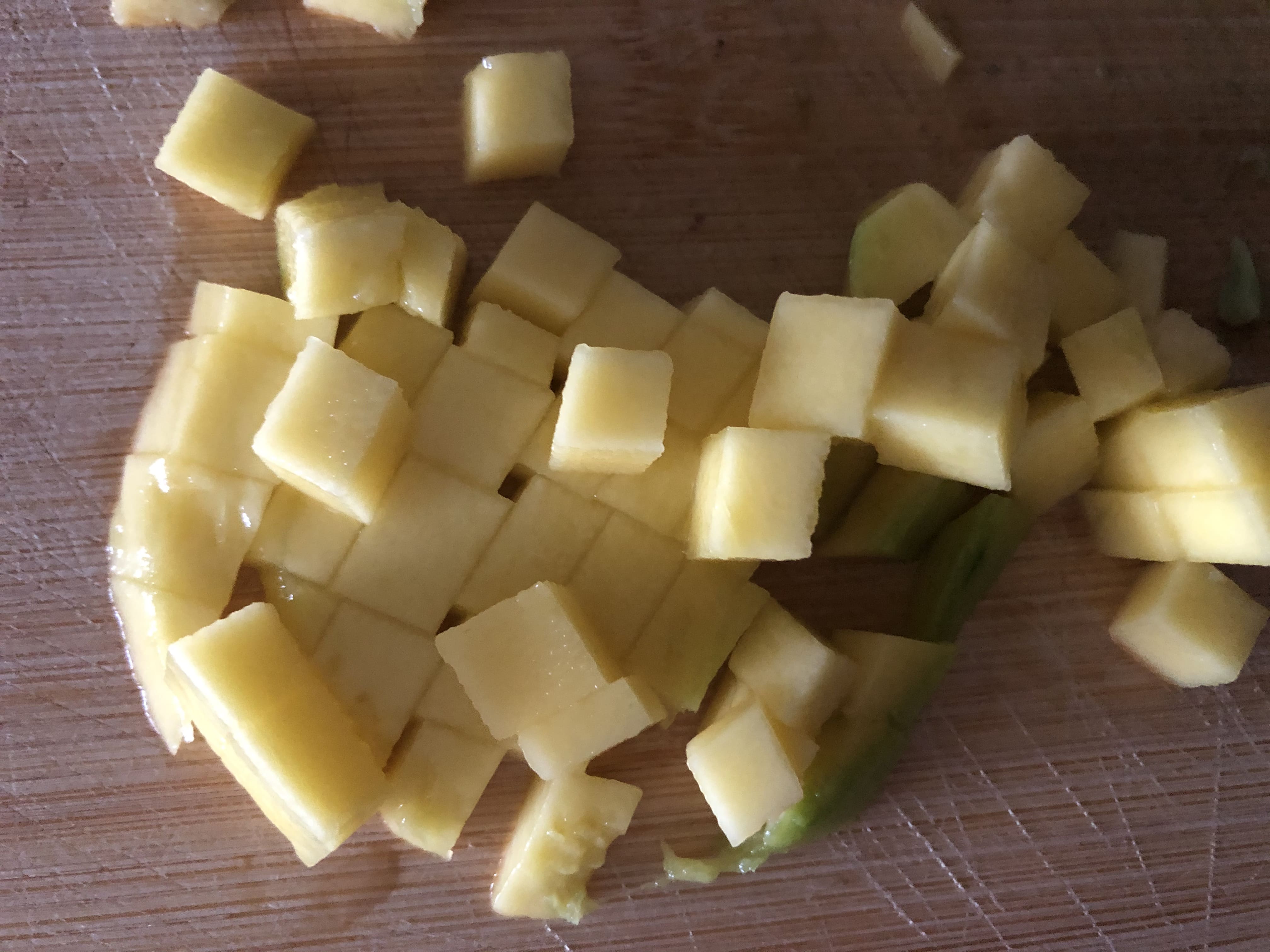 Corta la remolacha en láminas finas. Corta el mango y el aguacate en cubos pequeños y rocía con un poco de zumo de limón. Mezcla bien.