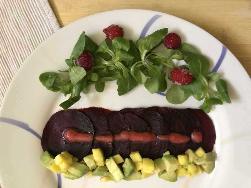 CARPACCIO DE REMOLACHA, MANGO Y AGUACATE CON VINAGRETA DE FRAMBUESAS