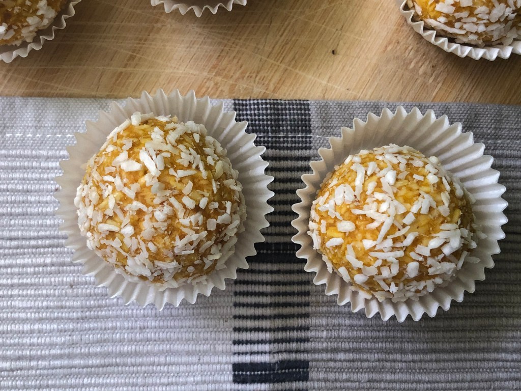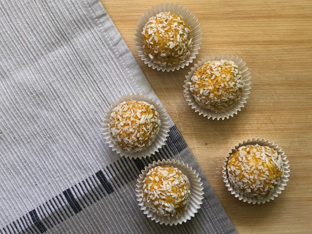 Deja reposar en la nevera durante unos 30 minutos (ver sugerencias). Haz bolitas de tamaño similar y reboza con más coco rallado.