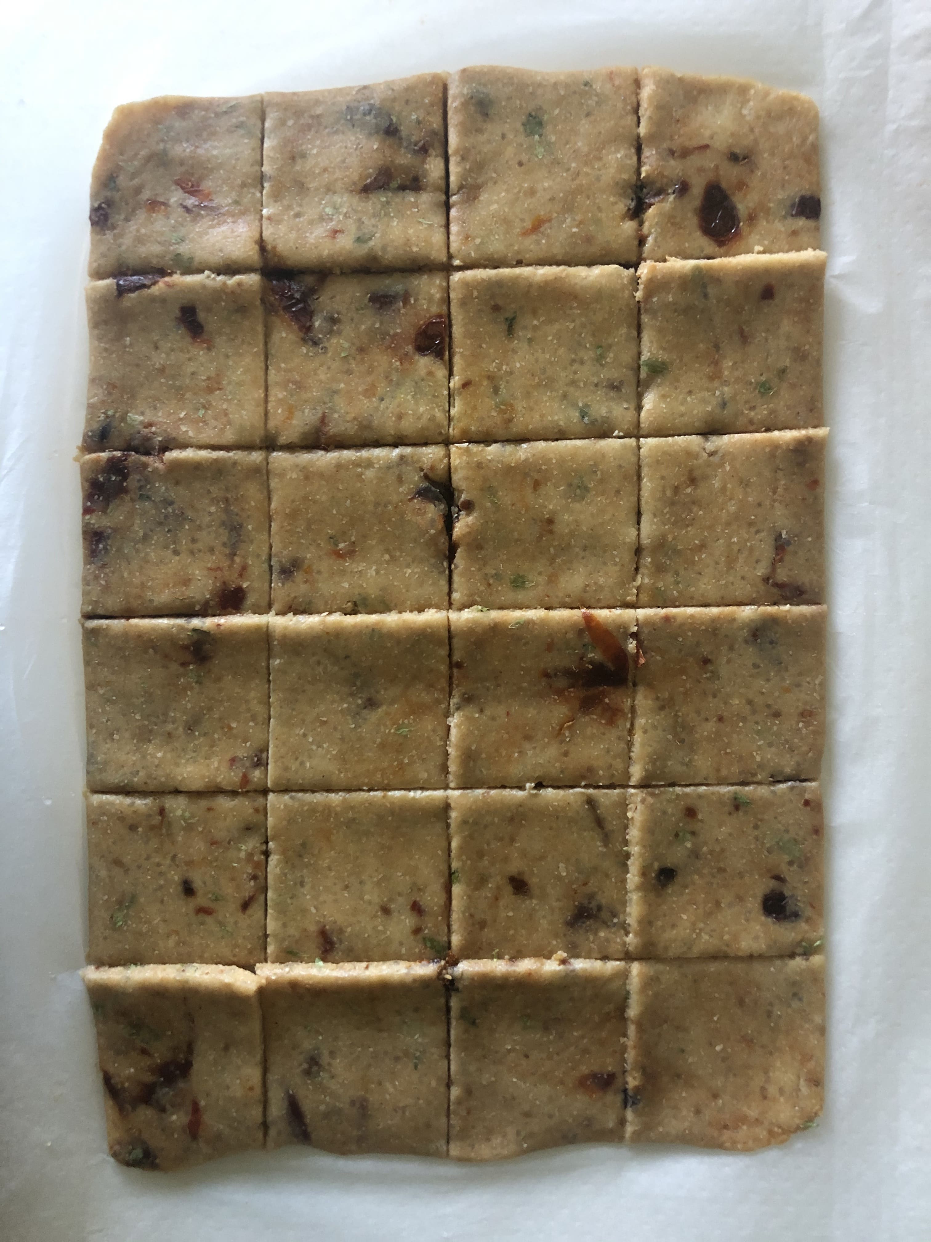 Precalienta el horno a 190º C. Divide en tres porciones y agrega a cada una los ingredientes de arriba para hacer diferentes sabores. Mezcla bien y haz una bola. Coloca la masa entre dos papeles de horno y estira con ayuda de un rodillo o con las manos hasta dejarla de un grosor de 0,5 cm. Corta en cuadraditos del tamaño que prefieras.
