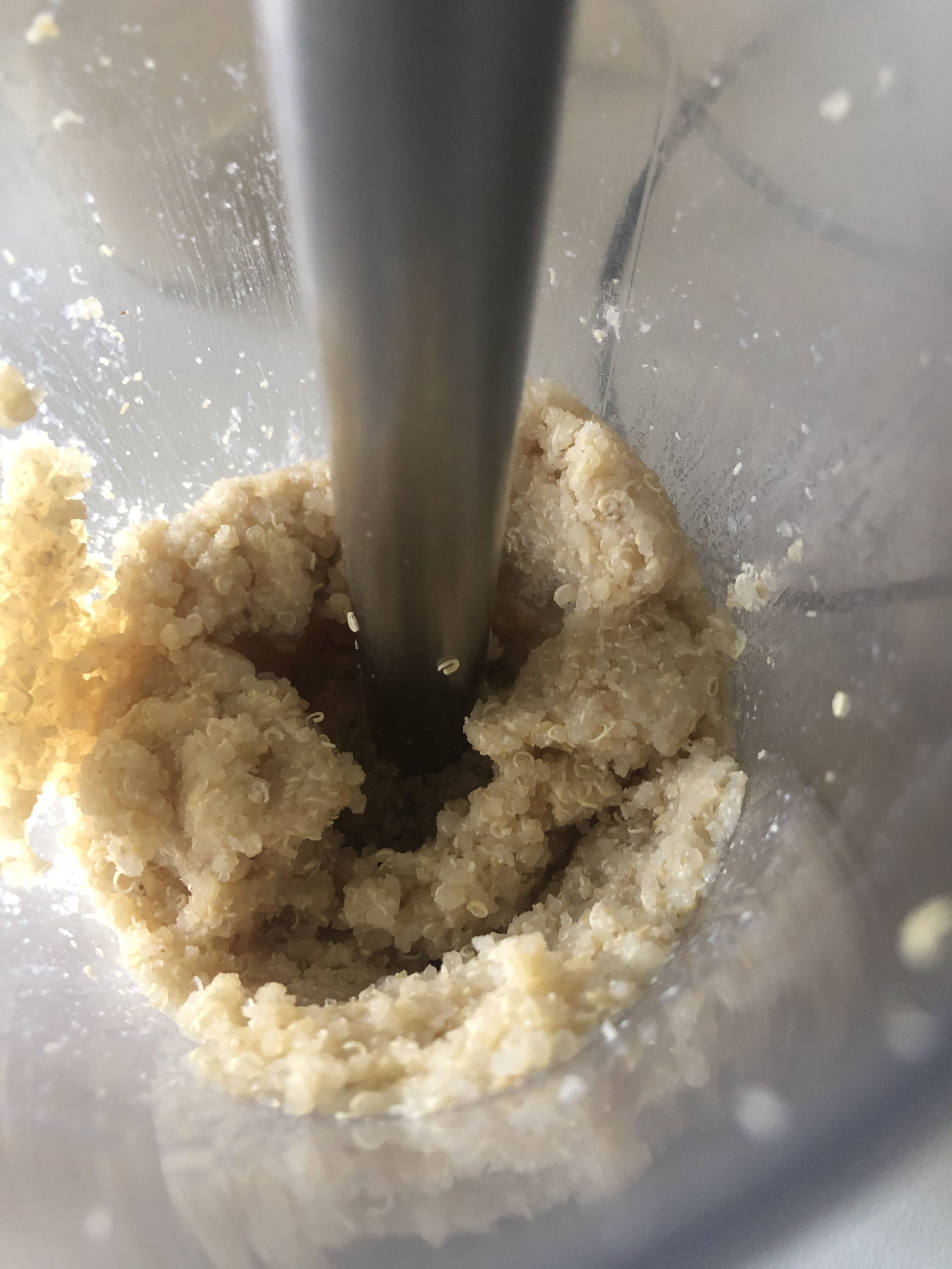 Tritura los granos en un procesador de alimentos o con ayuda de una batidora de mano. Puedes añadir el agua para facilitar la tarea. Cuando tengas una masa homogénea añade la harina de garbanzos y el lino molido. Mezcla con una cuchara de madera y termina con las manos, amasando e integrando todos los ingredientes bien. Es una masa pegajosa.