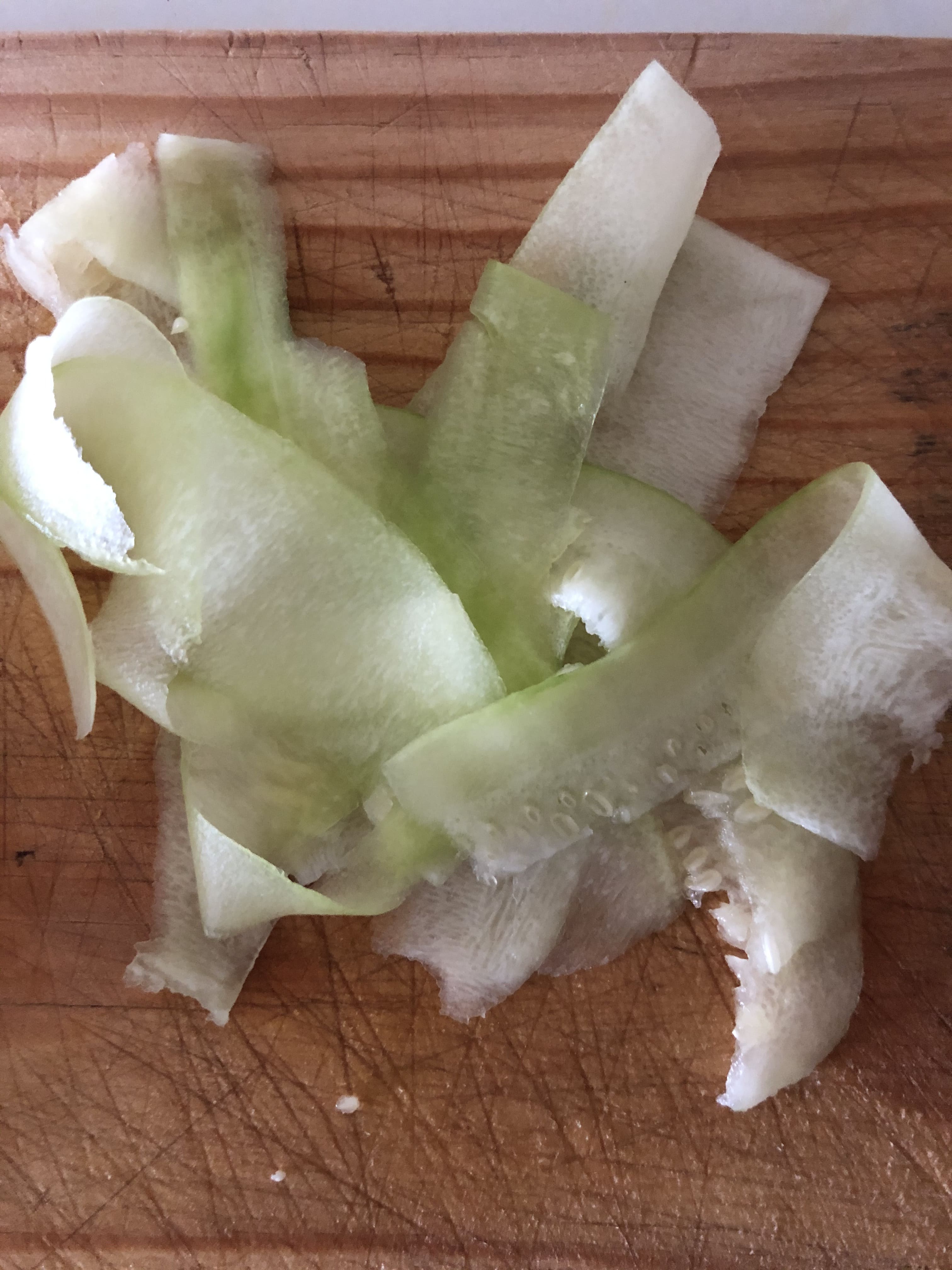 Pela el calabacín y córtalo en tiras finas, con ayuda de una mandolina, cuchillo o el propio rallador. Coloca las tiras en un recipiente grande y cubre con vinagre (no hace falta mucha cantidad).