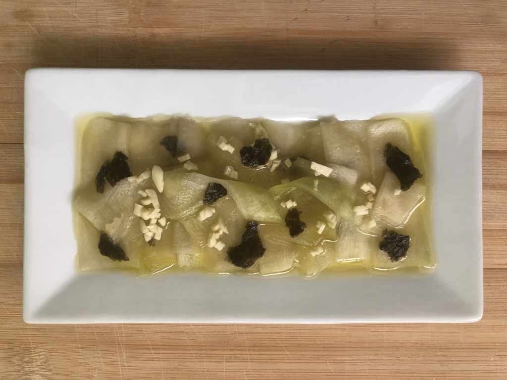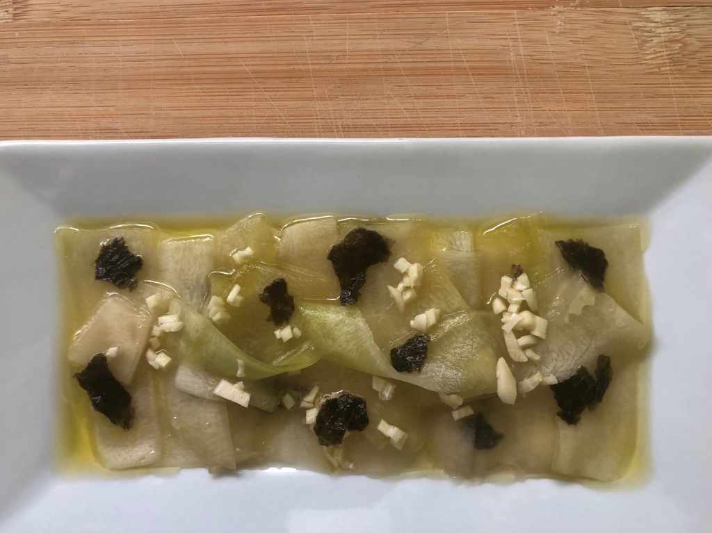 Los boquerones veganos no son otra cosa que tiras finas de calabacín, maceradas en vinagre y alga nori (que le da ese saborcito tan característico y mar) y aliñados después con aceite de oliva, ajo y perejil.