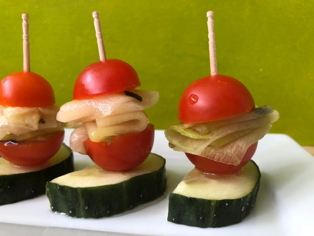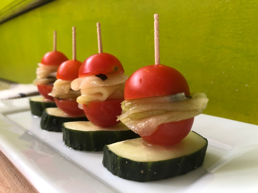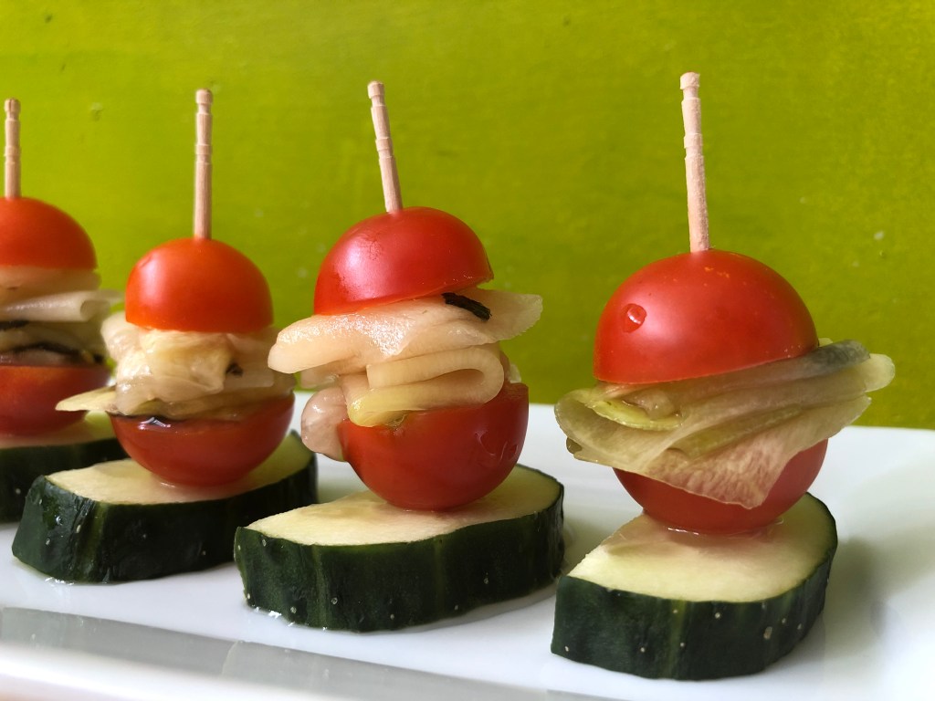 BROCHETAS DE CALABACÍN, CHERRIES Y PEPINO