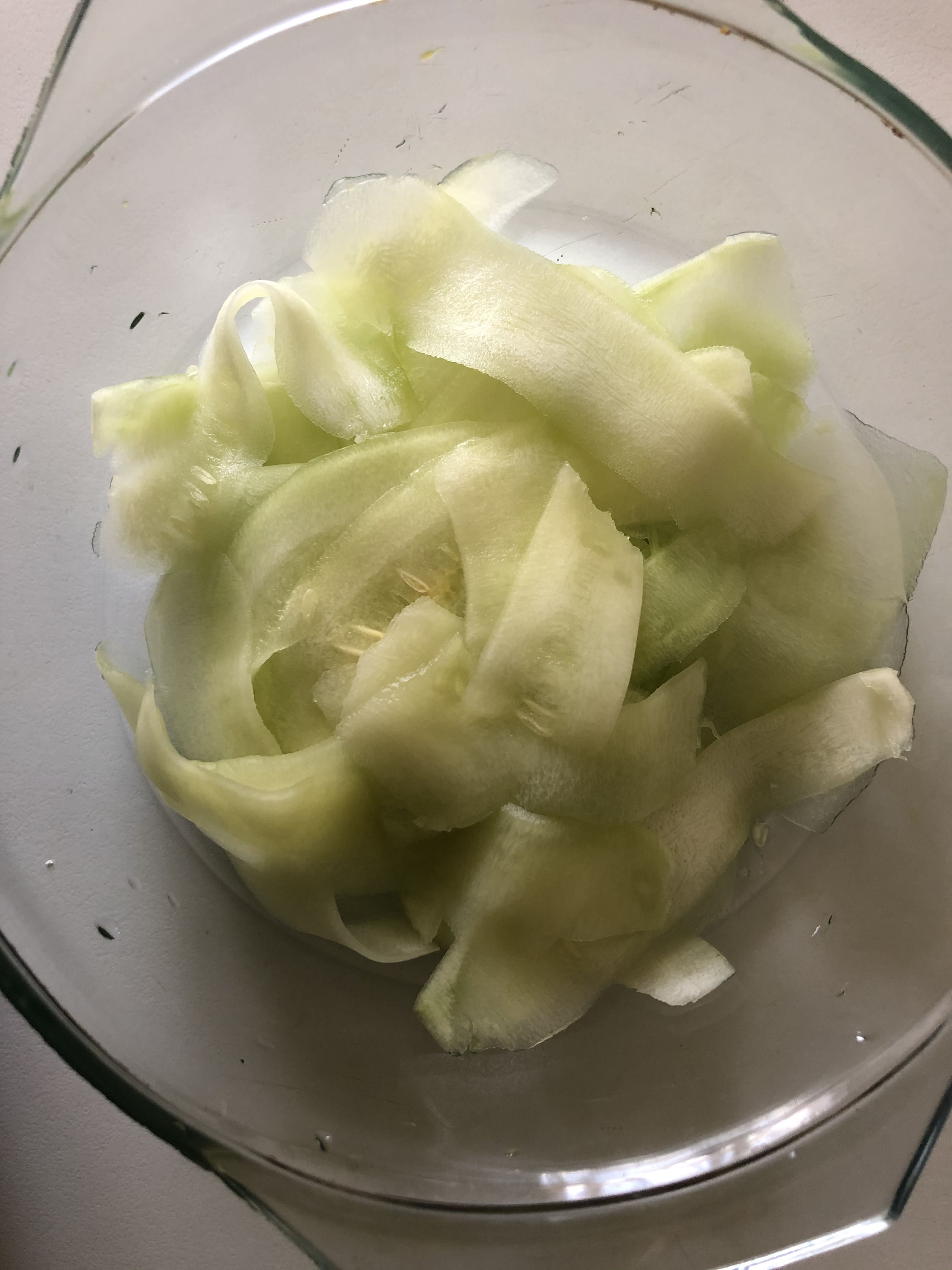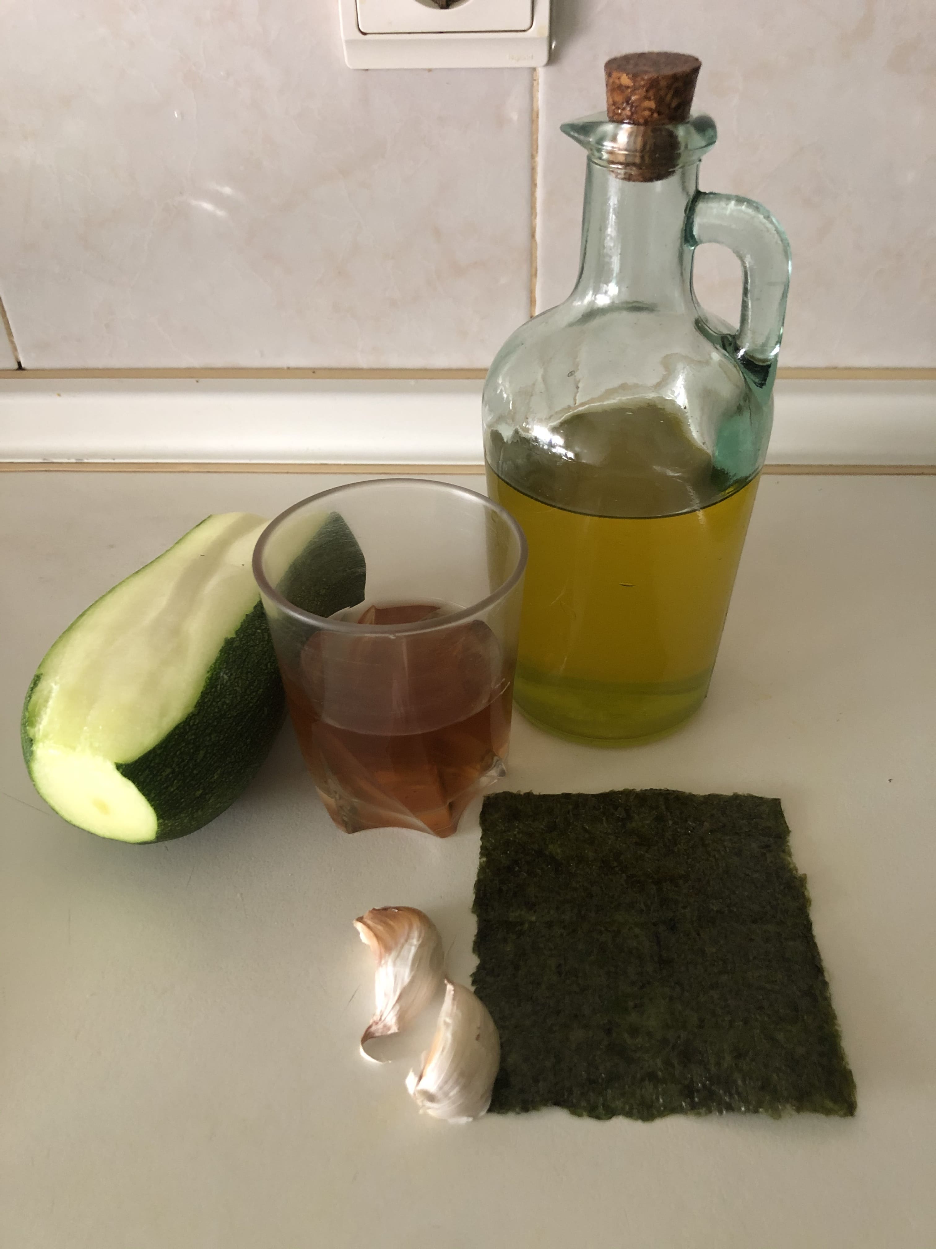 Lava el calabacín, elimina la piel con un rallador y córtalo en láminas finas. Puedes hacerlo con una mandolina, cuchillo o el propio rallador. Pon el calabacín en un recipiente grande y cubre con el vinagre y el alga nori cortada en trocitos. Deja macerar unas horas (mejor toda la noche).