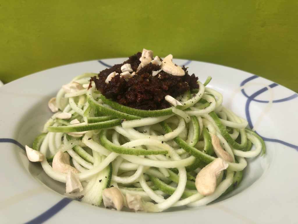 ESPAGUETIS DE CALABACÍN CON PESTO DE TOMATES SECOS Y ANACARDOS
