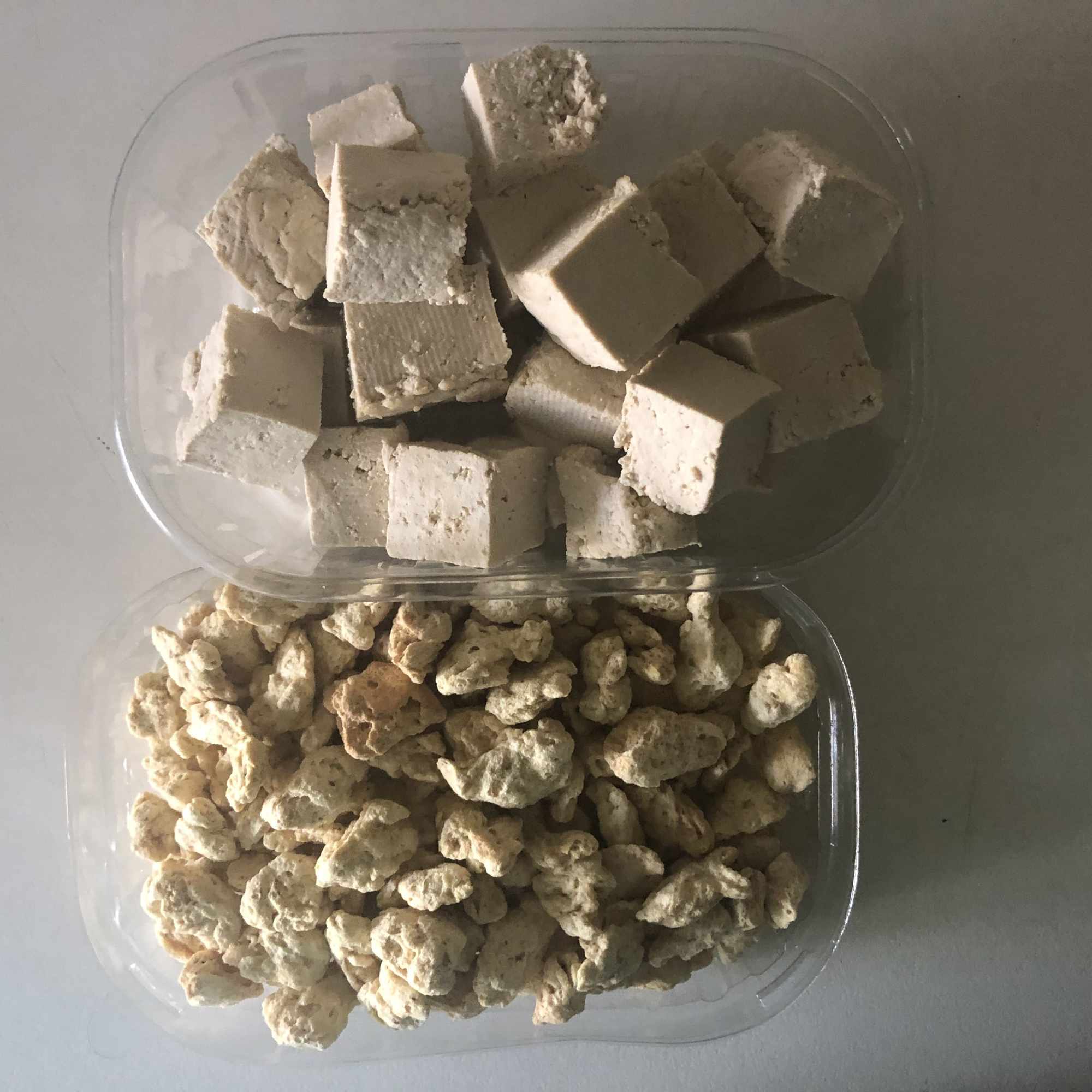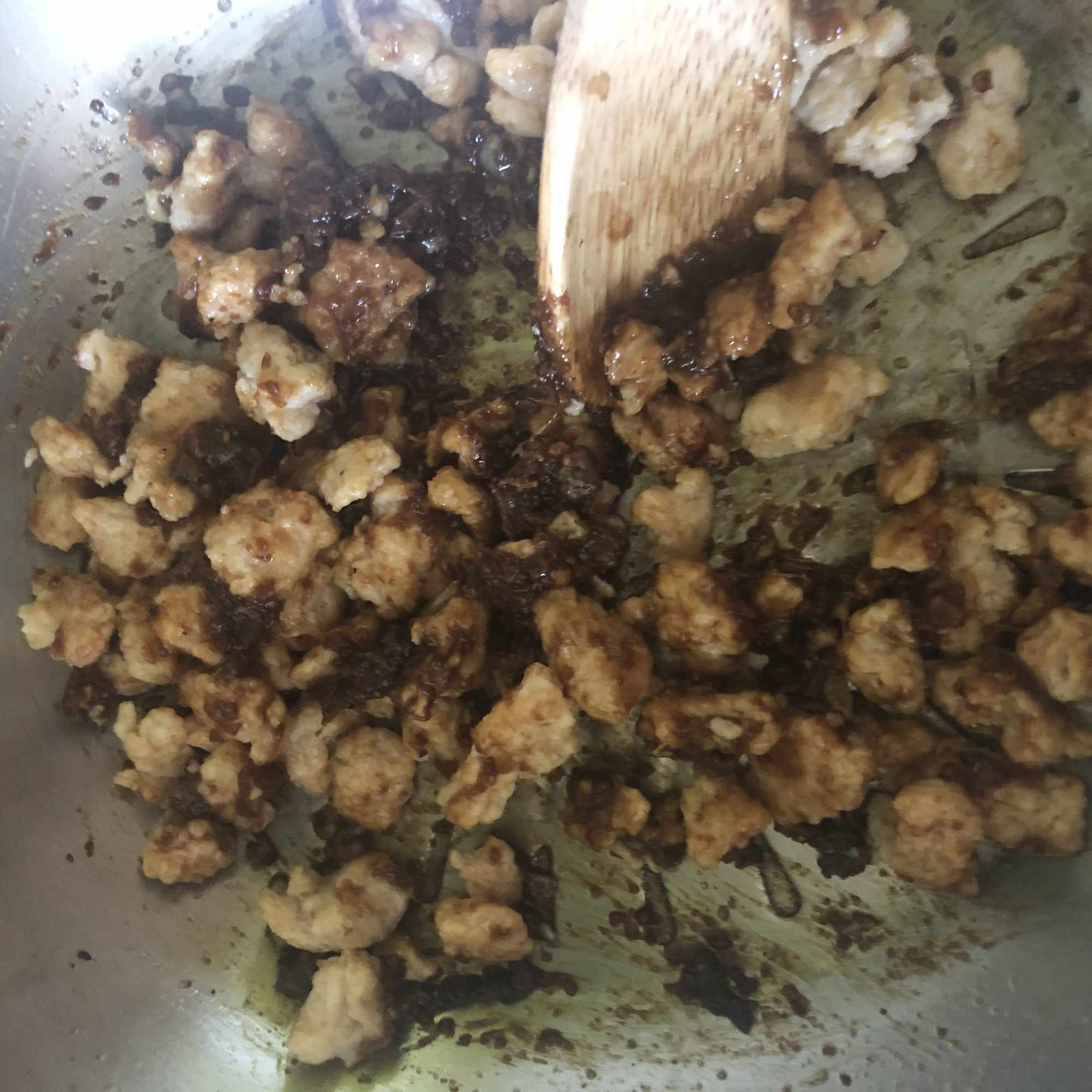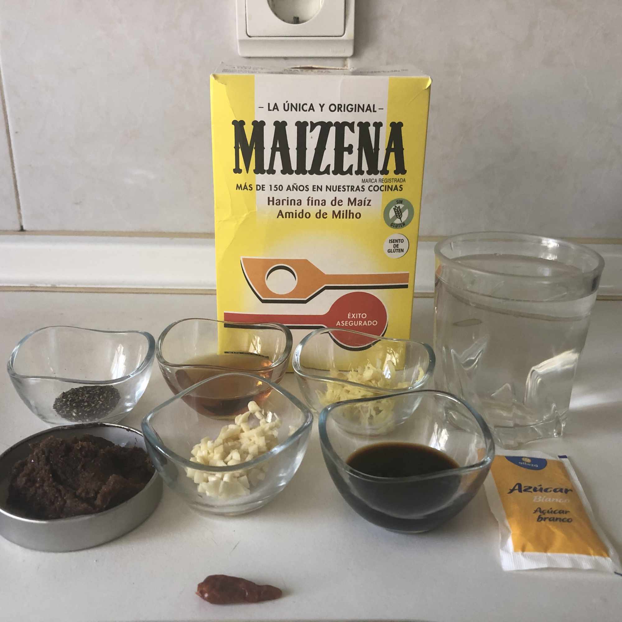 Añade el azúcar y deja que caramelice. Después la soja deshidratada, la salsa de soja, el agua y la sal. En un vaso de agua fría disuelve la maicena. Agrega a la sartén y deja que espese. Por último, corta el tofu en cubos y agrega al resto.
