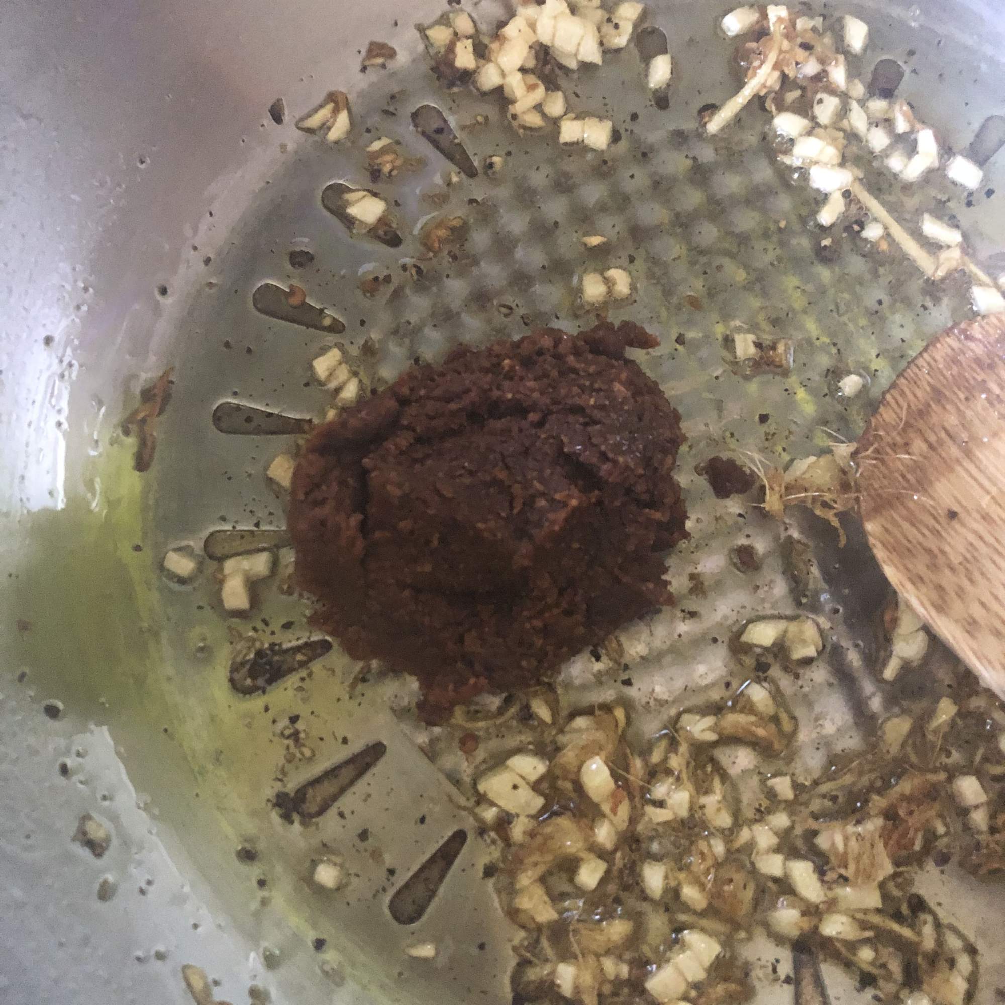 En una sartén con aceite de sésamo tuesta la guindilla picada para aromatizar el aceite. Retira la guindilla. En ese mismo aceite, agrega la pimienta molida y el jengibre y cocina a fuego medio un minuto. Agrega el ajo y cocina dos minutos más. Por último, añade el miso y mezcla todo bien.