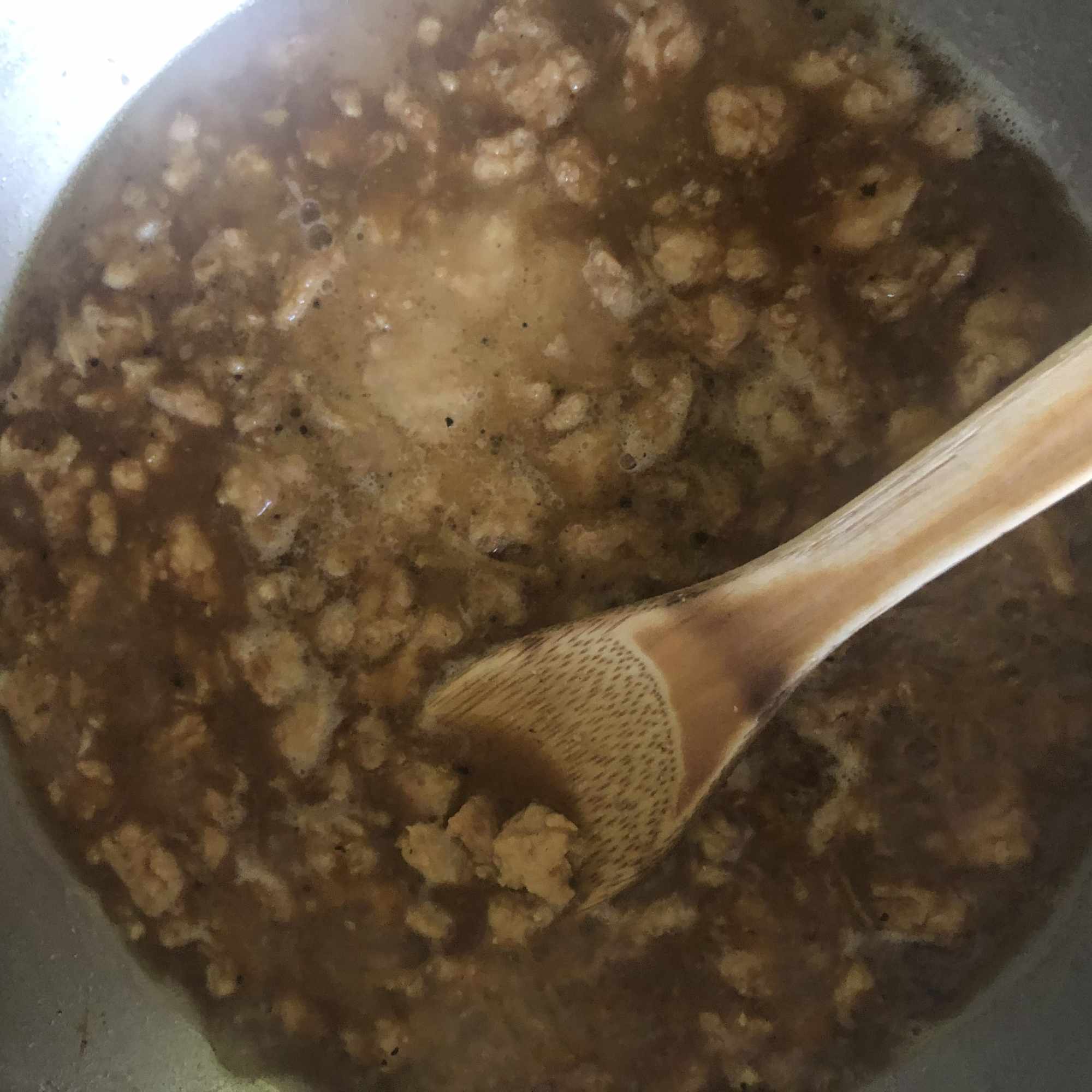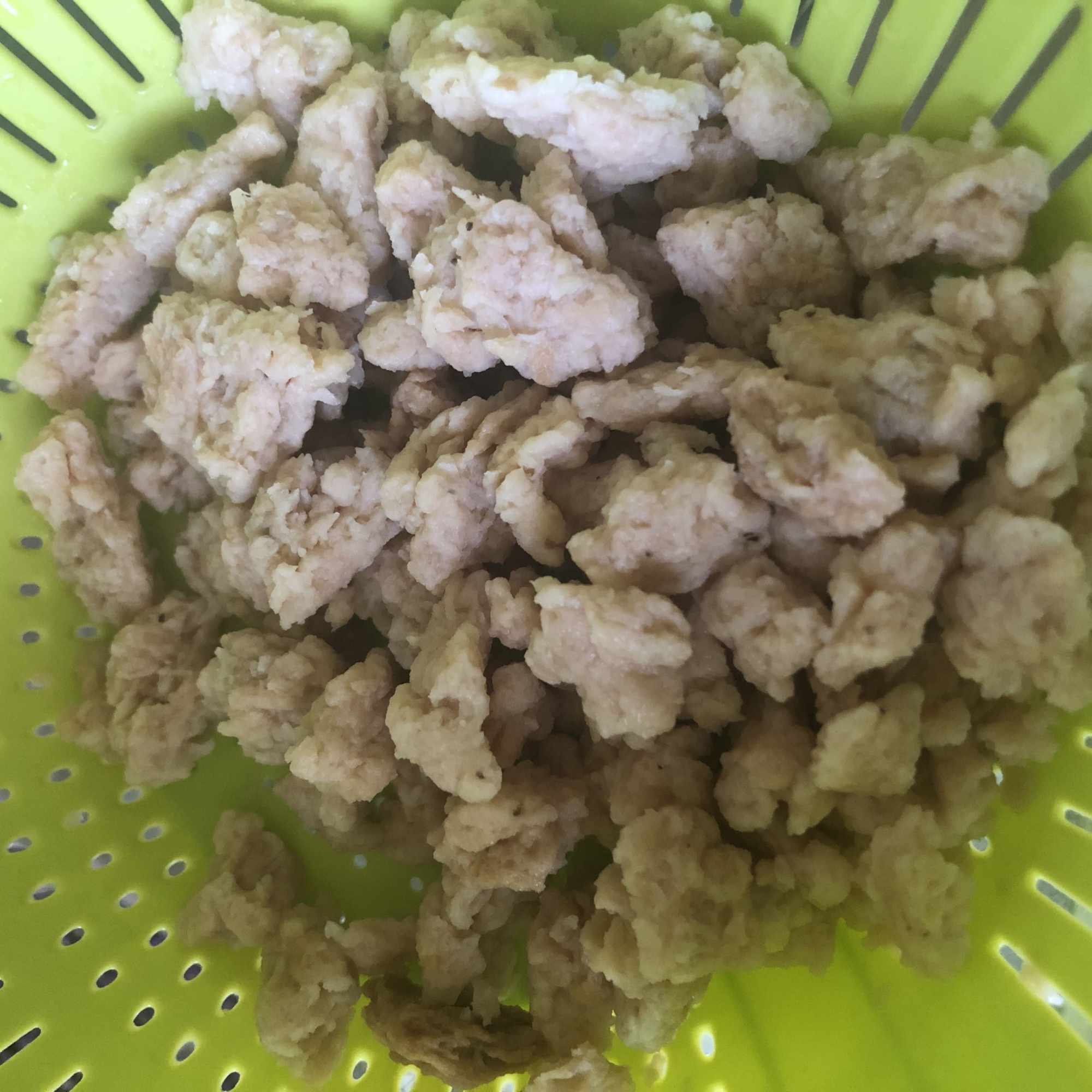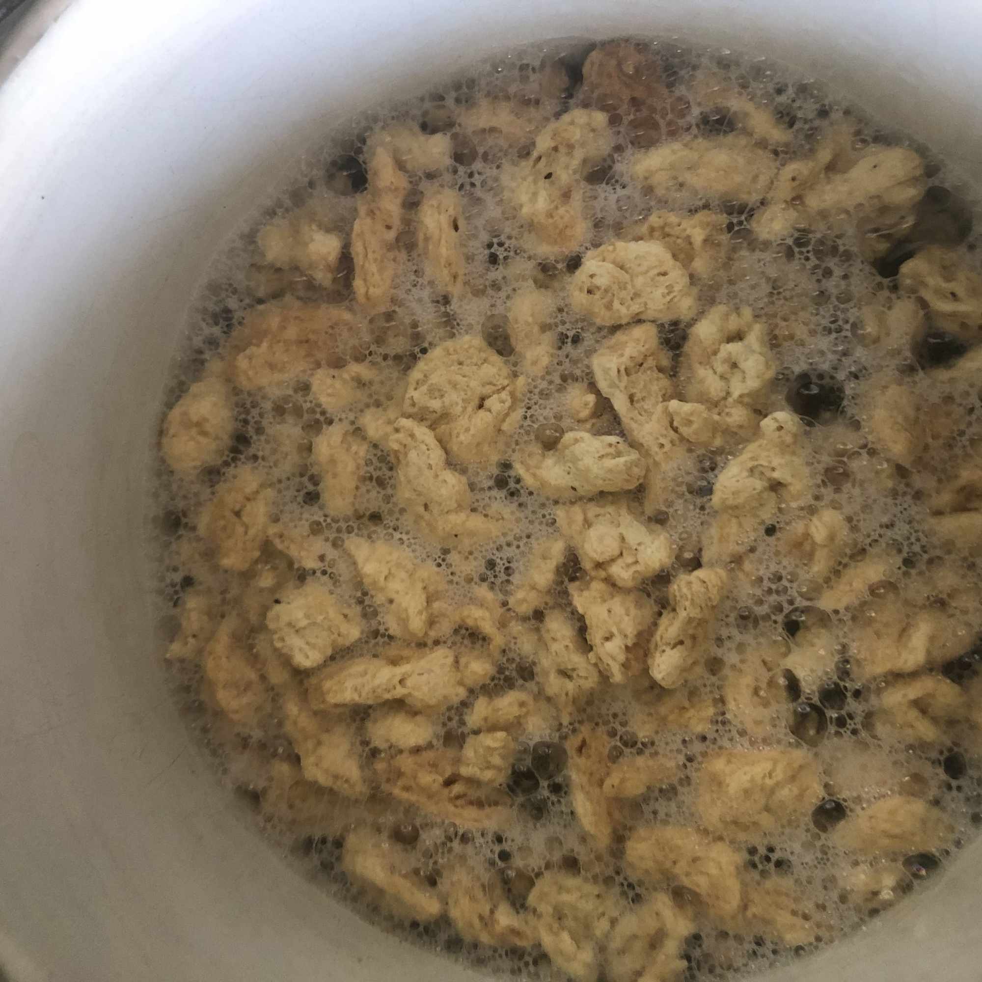 Pon agua a hervir en un cazo y agrega la soja texturizada. Retira del fuego, cubre con una tapadera y deja hidratar durante unos 20-30 minutos. Escurre y elimina el exceso de agua presionando un poco con las manos y reserva.