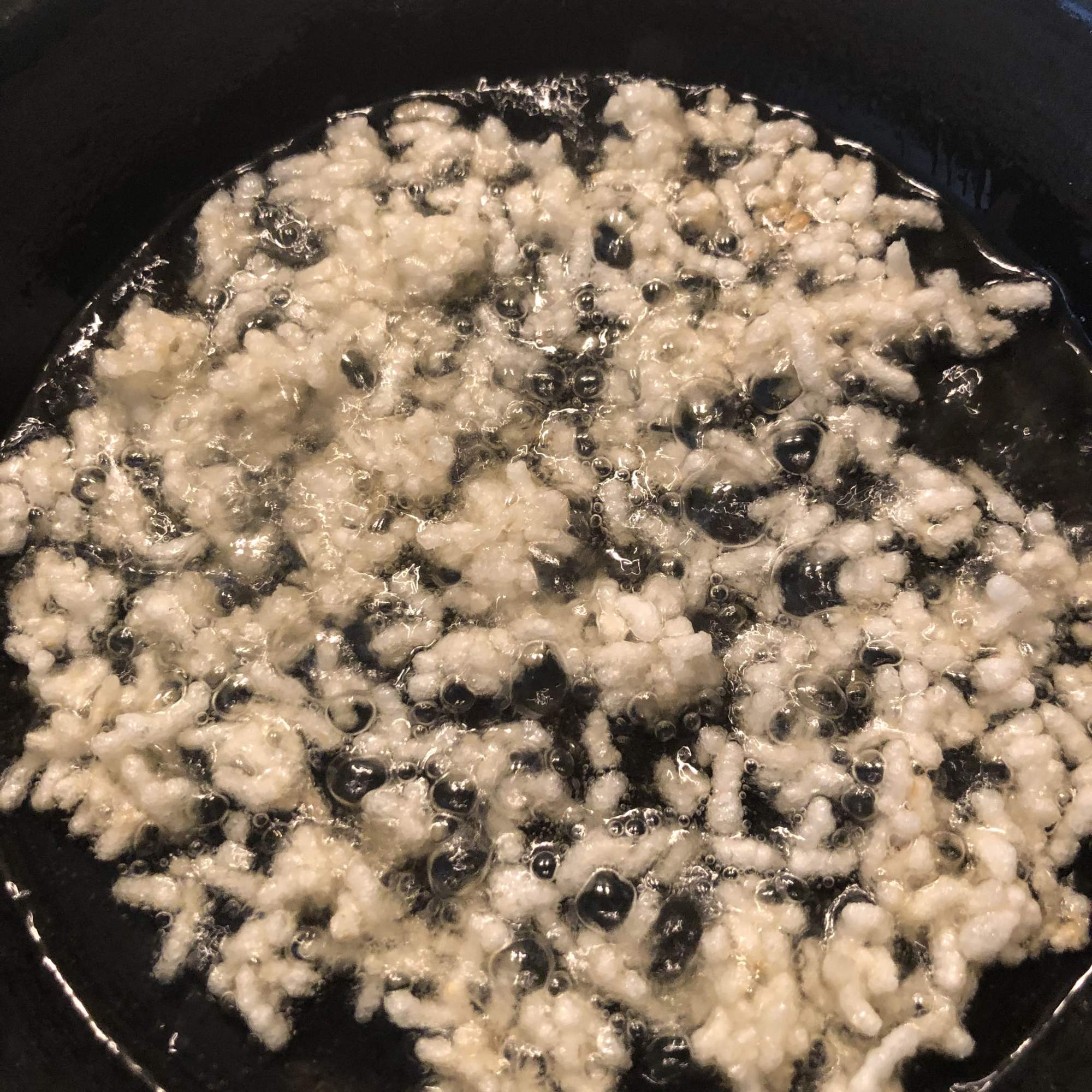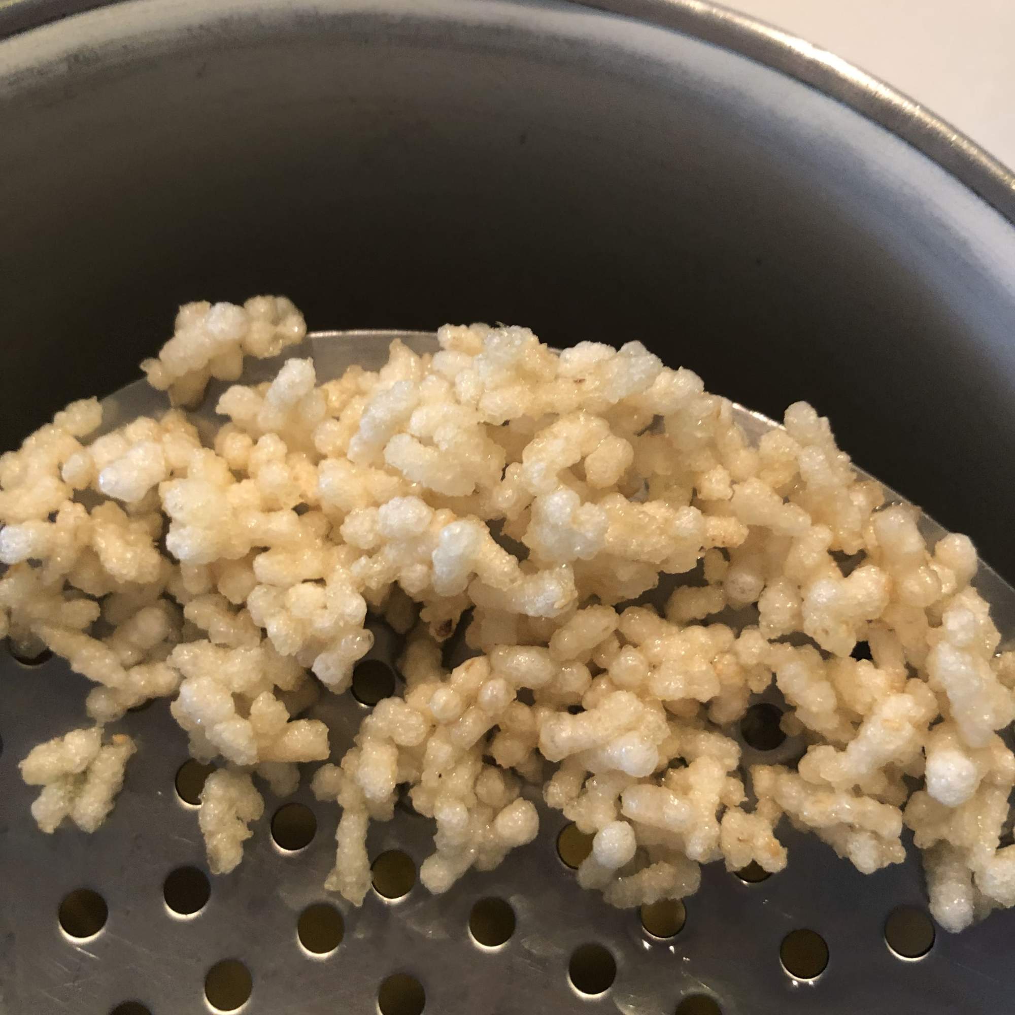 En un cazo pequeño, pon a calentar abundante aceite. Ve añadiendo el arroz en tandas, poca cantidad. Deja que se hinchen, saca del aceite y escurre en papel absorbente. Te aconsejo que no dejes el arroz más de un minuto o se tostará (me ha pasado).