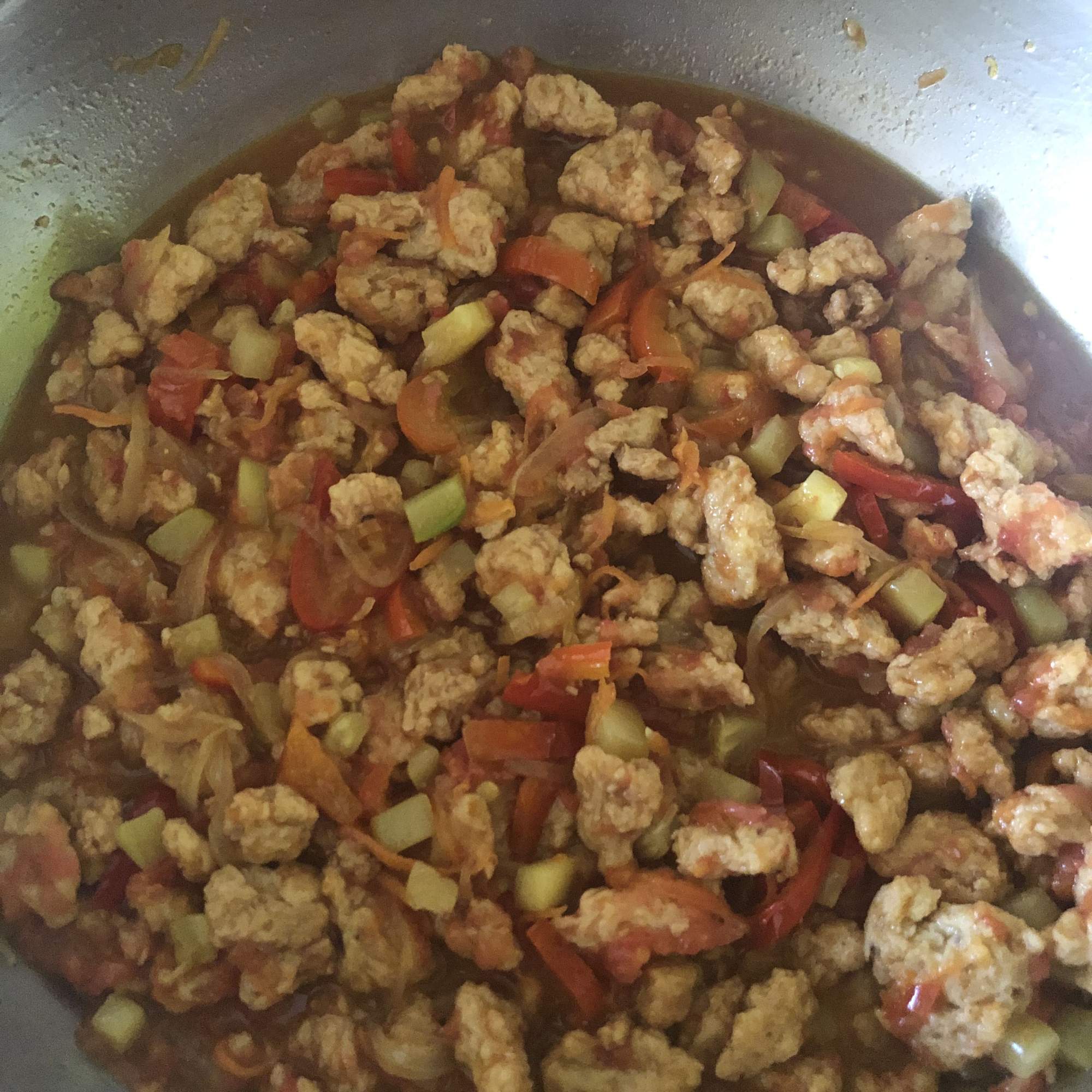 Cuando las verduras estén blanditas, añade la salsa de soja, el azúcar, el tomate y el chorrito de vino. Cocina a fuego medio hasta que reduzca la salsa. Si te parece que la soja no está a tu gusto, añade un poco más de agua y cuece más tiempo.