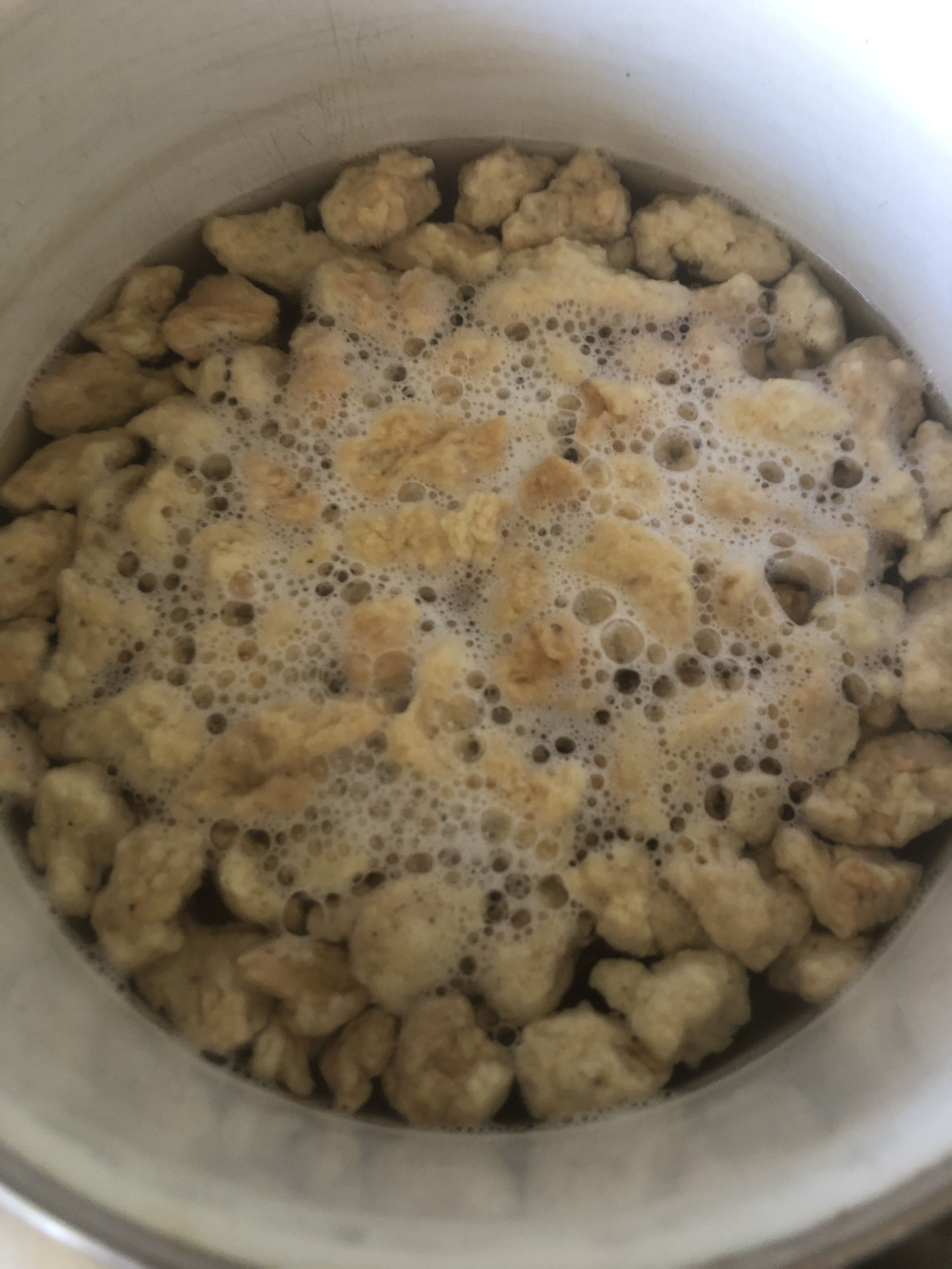 Hidrata la soja. Para ello, pon a calentar agua en un cazo (mejor caldo, si lo tienes). Cuando rompa a hervir añade la soja, cuece un par de minutos y apaga el fuego. Cubre con tapadera y deja reposar 15-20 minutos. Después escurre en un colador y con las manos para eliminar el exceso de agua.