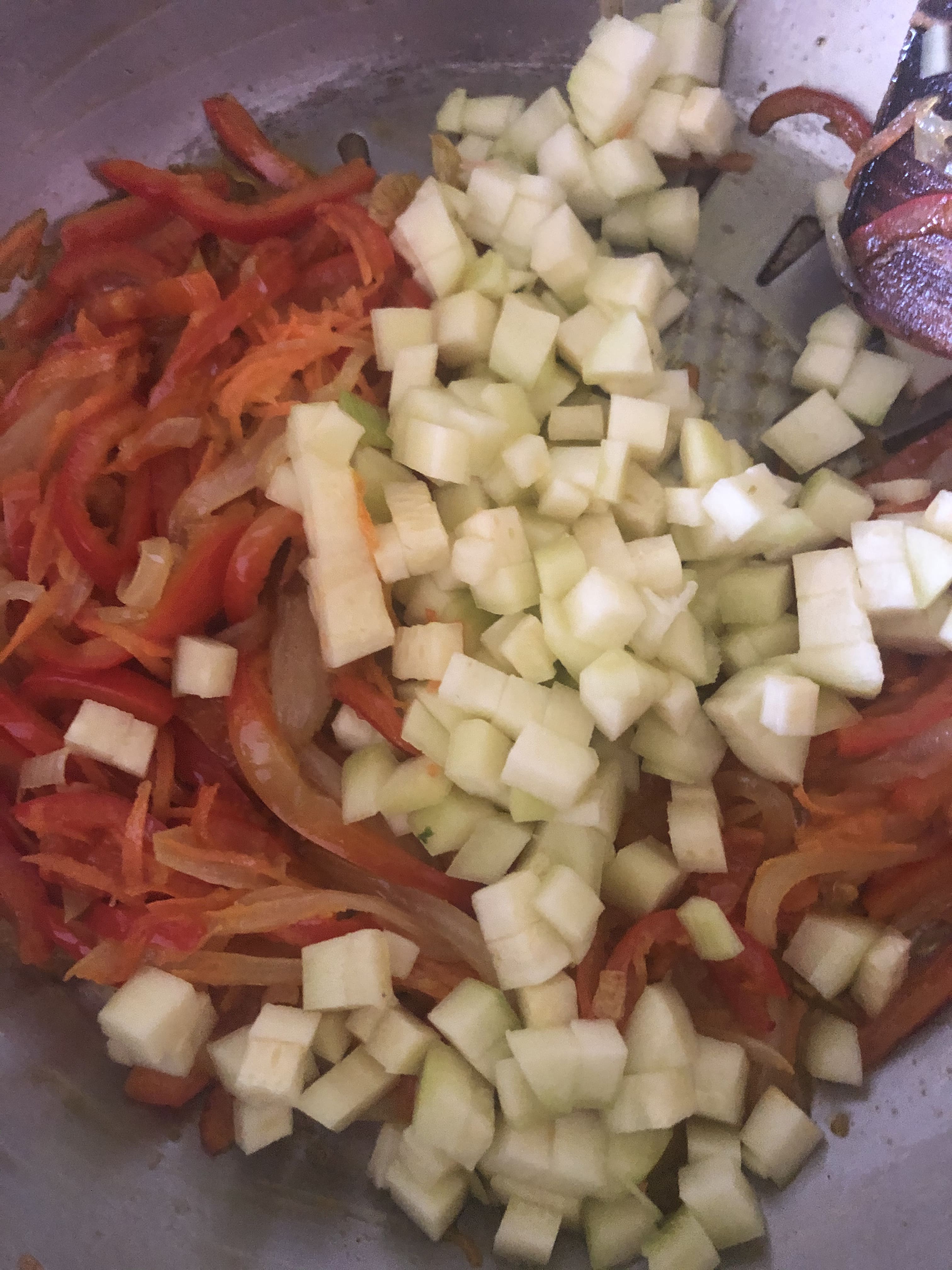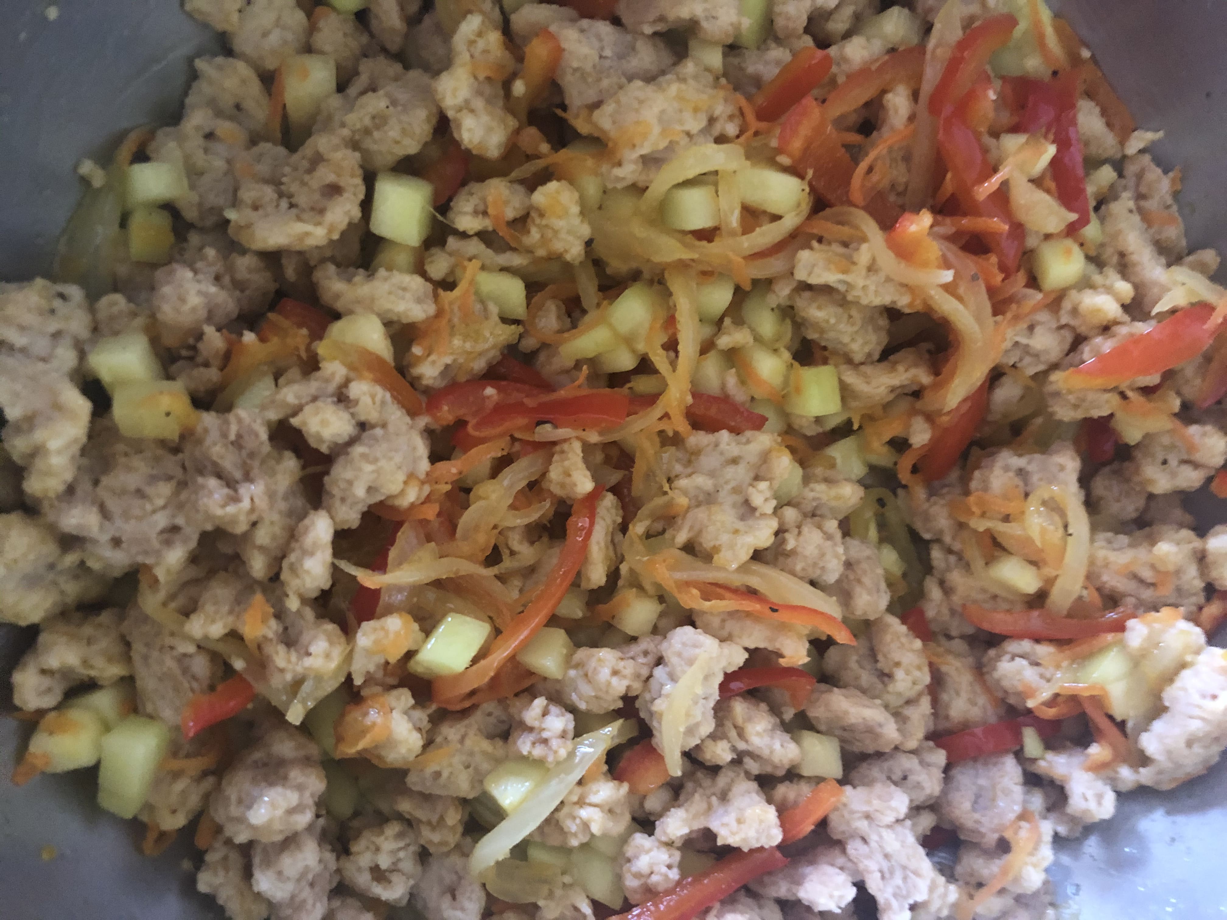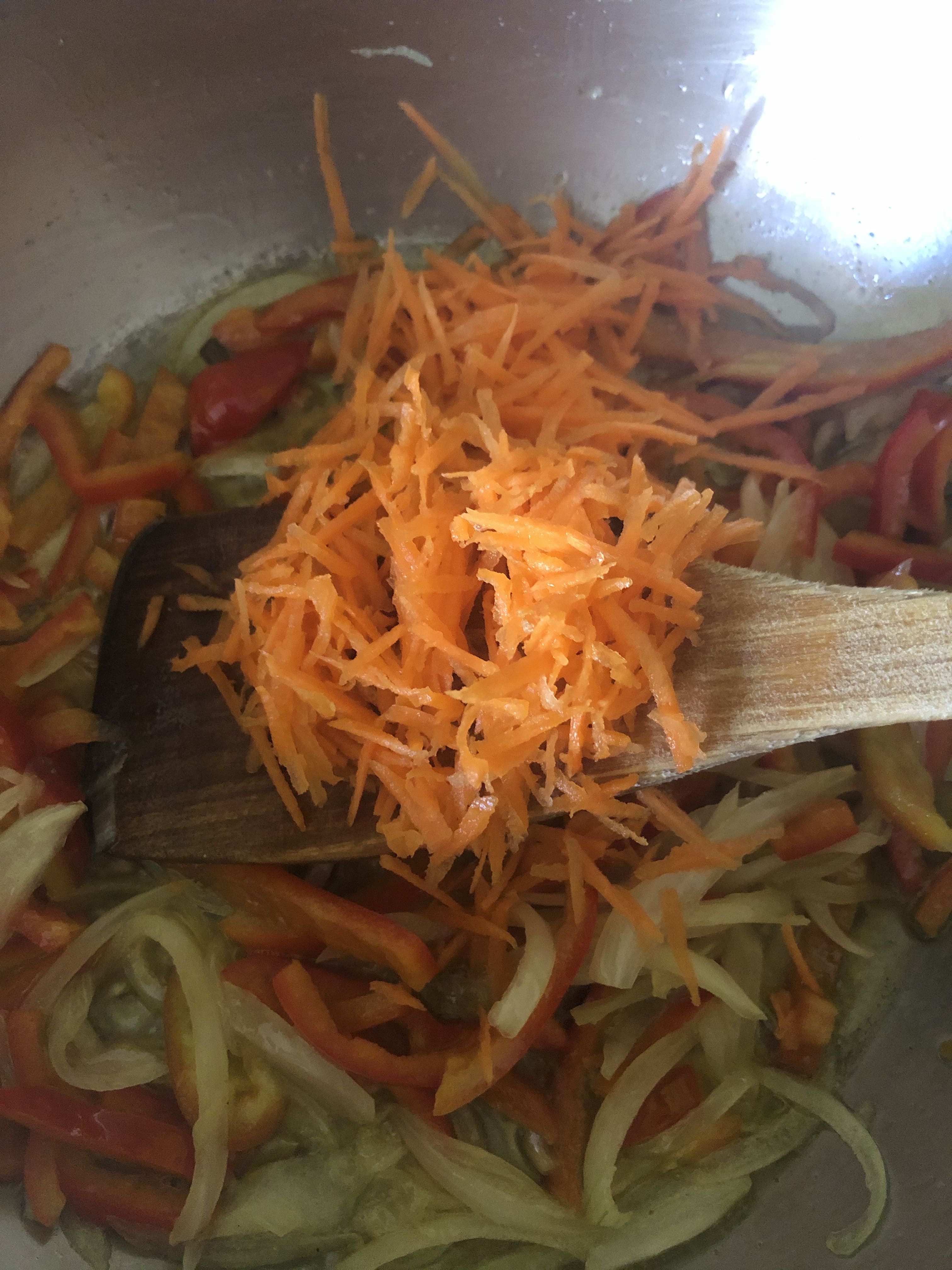 Corta la cebolla en juliana; el pimiento en tiras; el calabacín en cubos y ralla la zanahoria. Ralla también los tomates y reserva. En una sartén con un poco de aceite pocha la cebolla. Cuando empiece a transparentar añade el pimiento y la zanahoria. Por último, el calabacín y la soja texturizada para que vaya tomando los sabores. Salpimenta y mezcla todo bien.