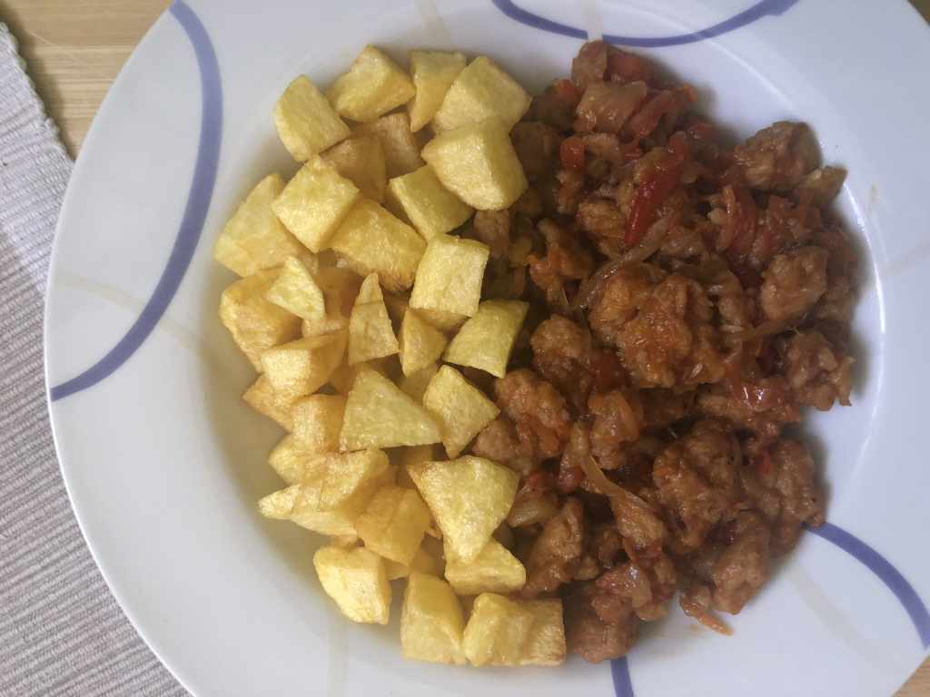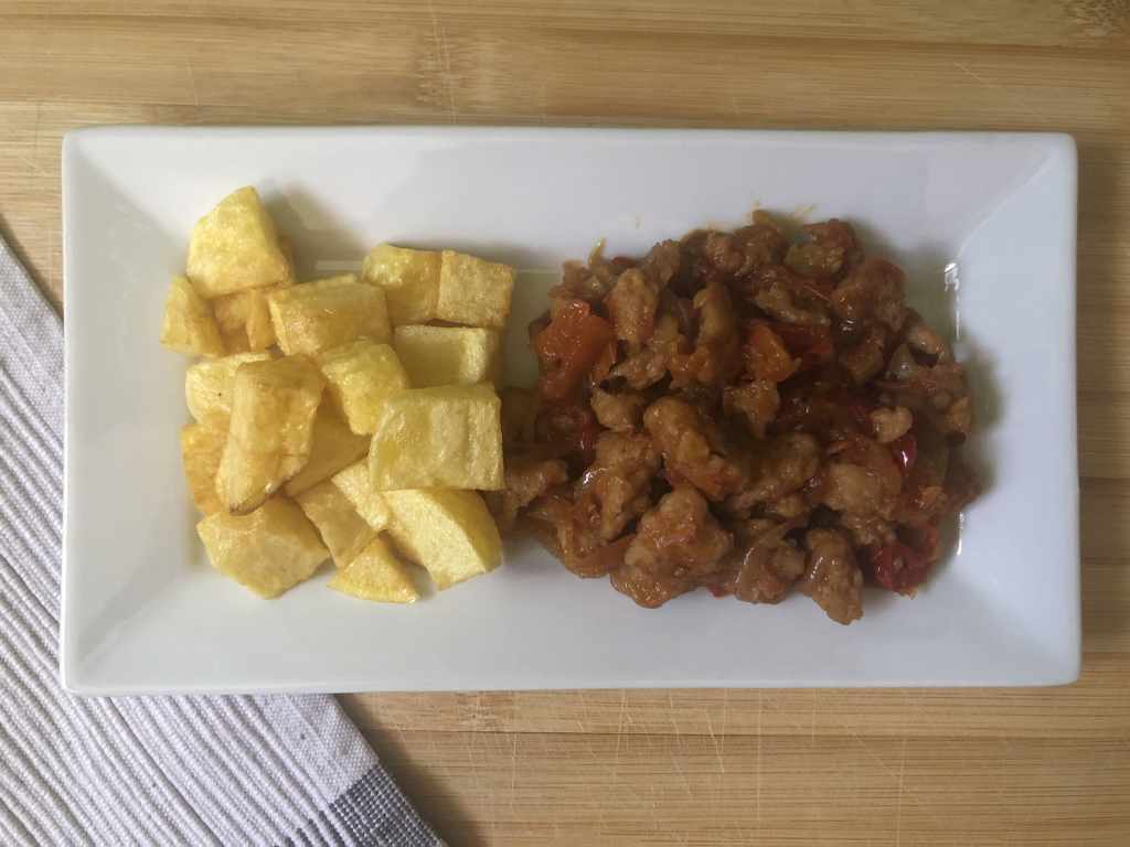 Pela y corta las patatas en cubos y fríe en abundante aceite. Sirve acompañando a la soja.