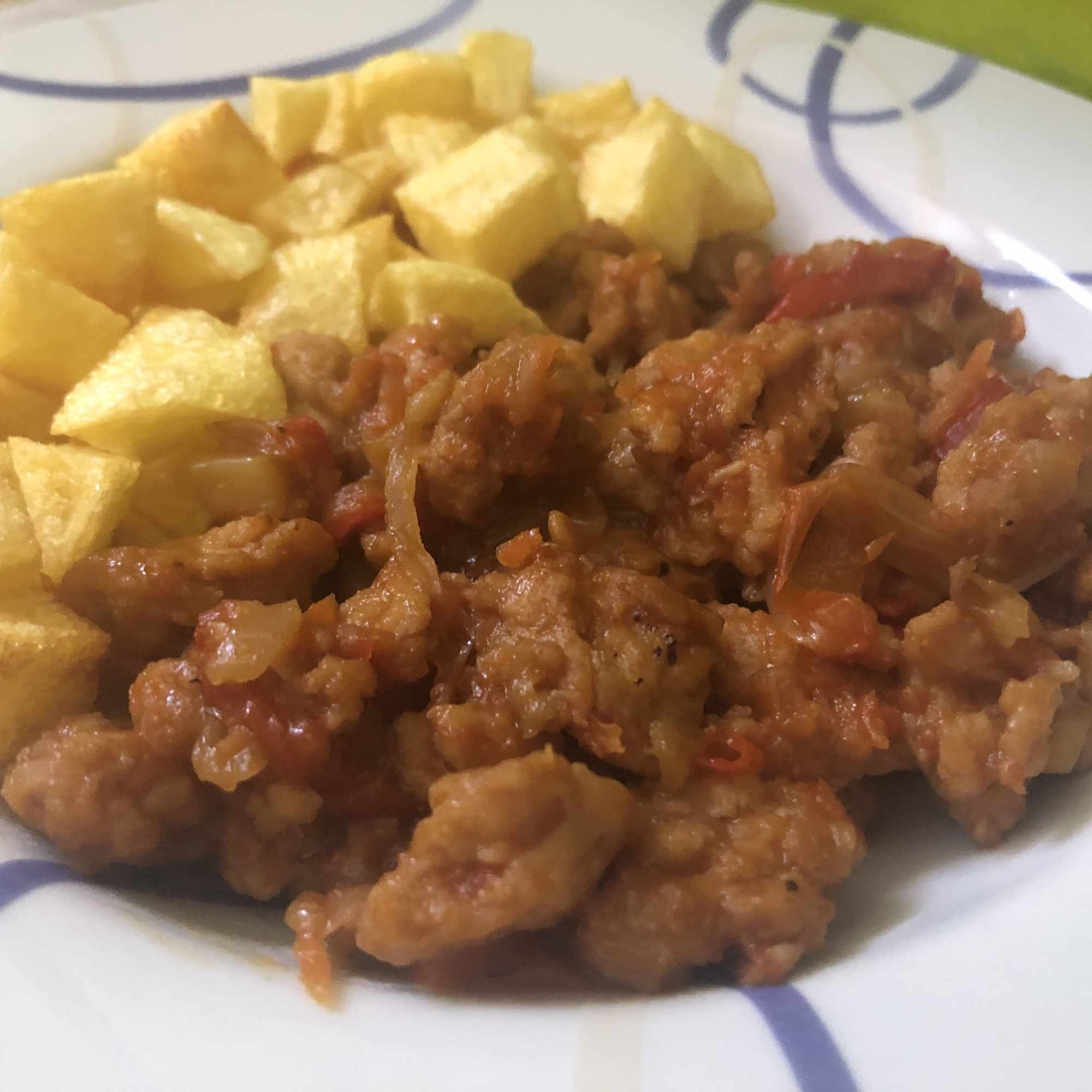 Suelo utilizar mucho la soja texturizada, sobre todo, para aquellas recetas que llevan carne picada: canelones, pastel de carne, moussaka o berenjenas rellenas. No hace demasiado tiempo vi una receta que me llamó enormemente la atención: era un guiso de soja. Tal cual. Como si lo hicieras con carne: con su cebolla, su ajo, su pimiento y tomate,… Tan simple que ni siquiera se me había ocurrido hacerlo así.