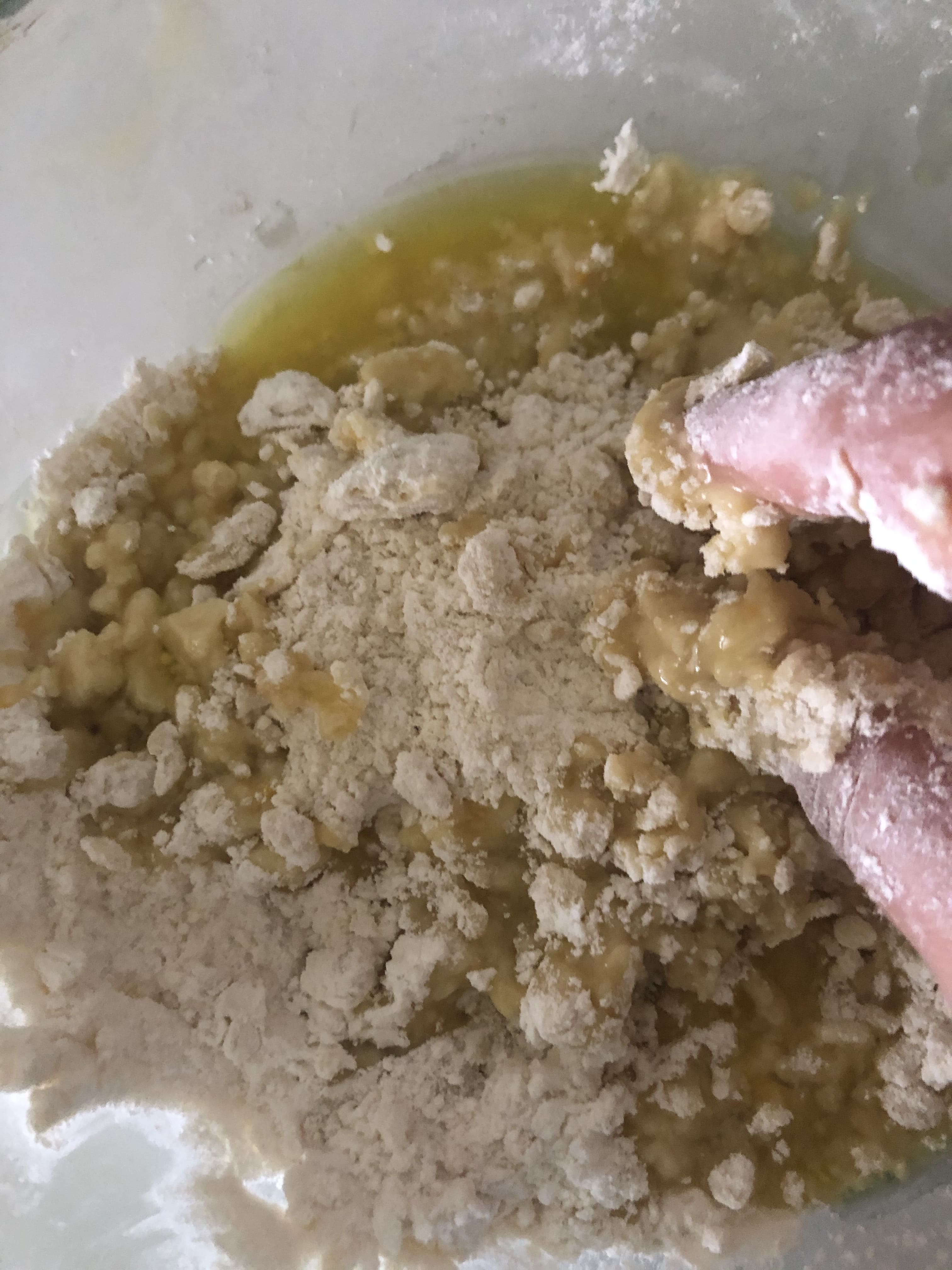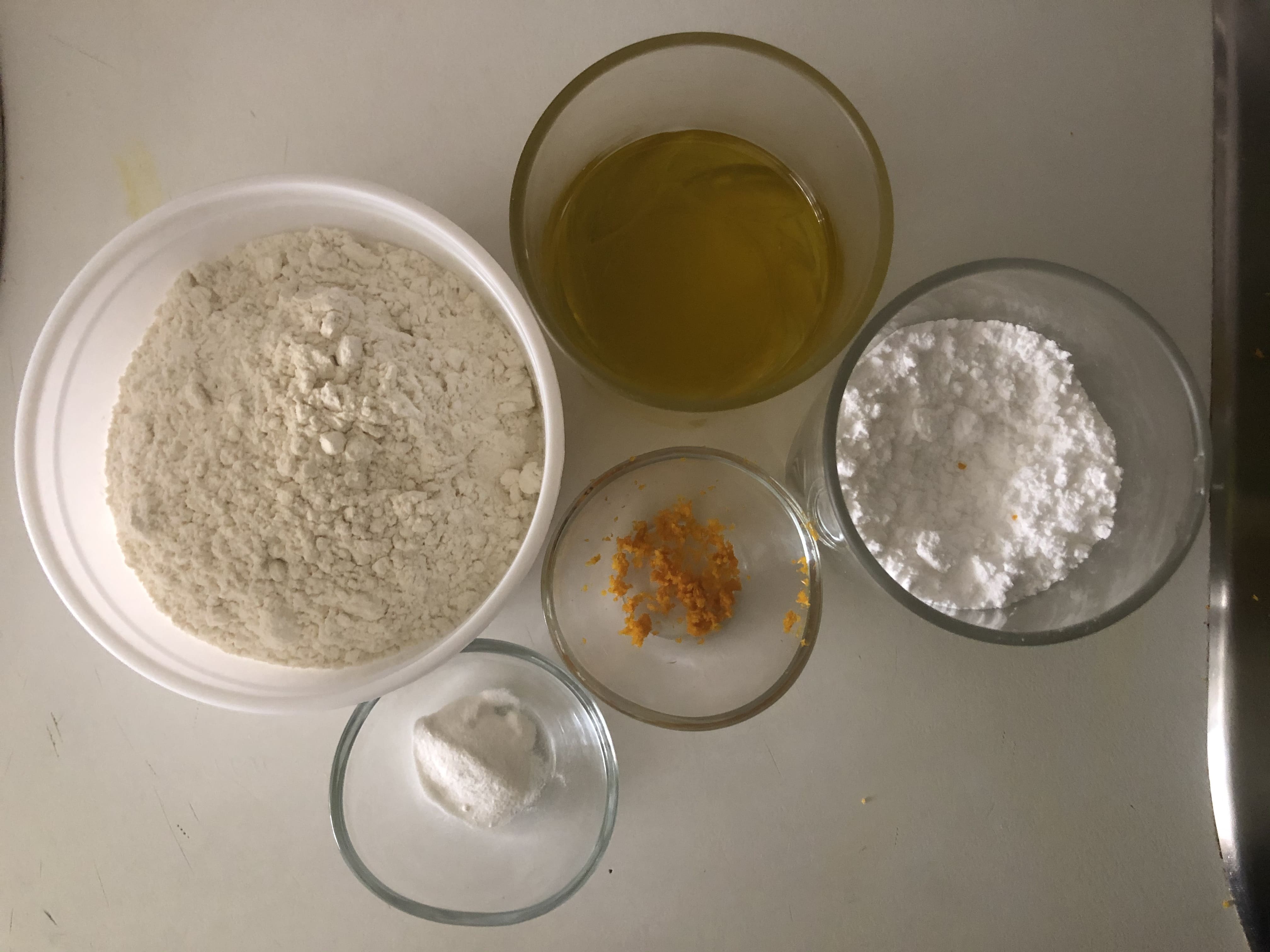 Tamiza la harina, el polvo de hornear y el azúcar. Añade la ralladura de naranja y mezcla bien. Agrega el aceite y ve amasando con los dedos hasta obtener una pasta lisa y maleable.