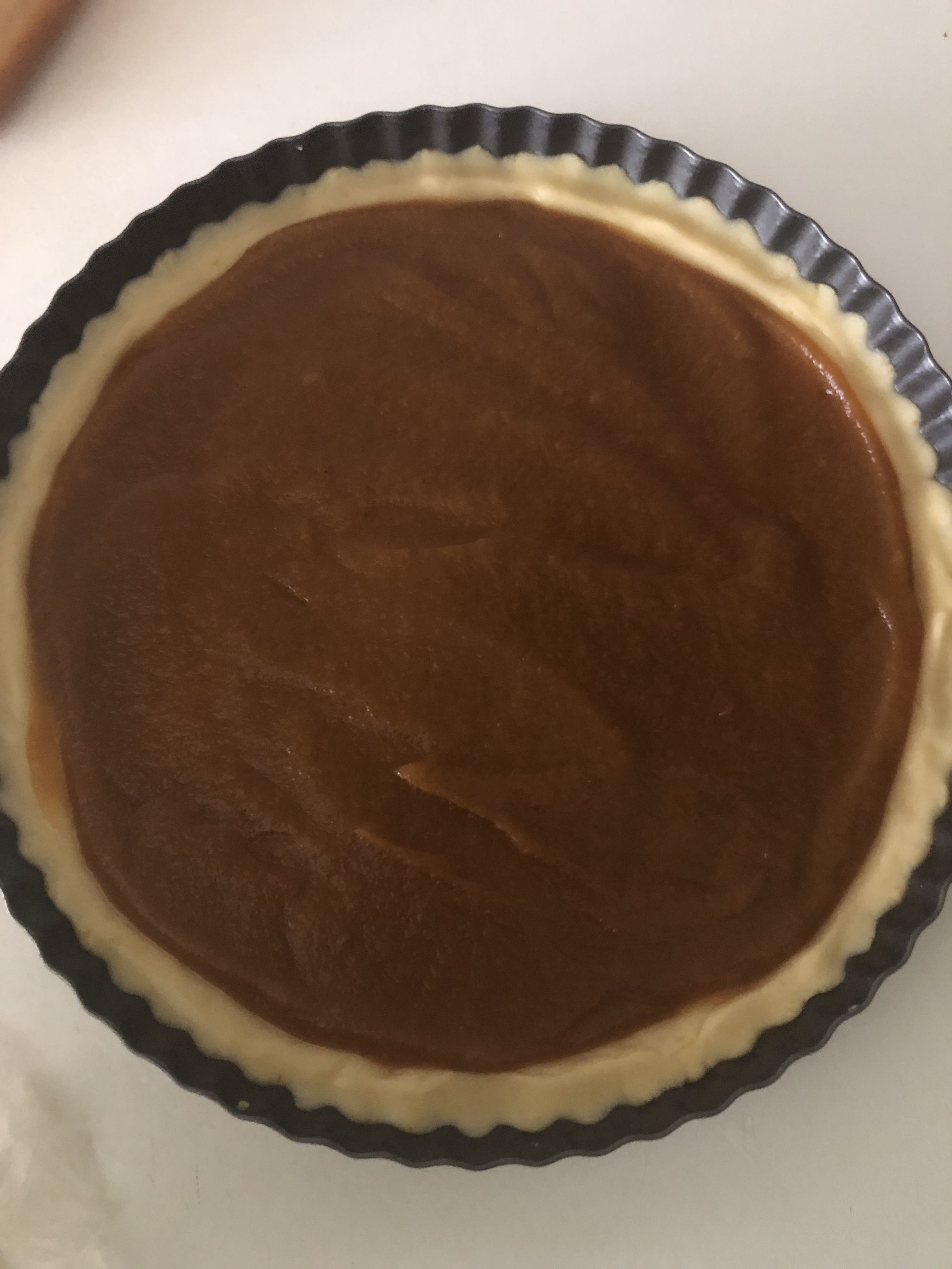 Ve añadiendo pequeñas cantidades del resto de la masa al molde que vayas a utilizar. Presiona con el puño y cubre toda la superficie, intentando que quede un grosor homogéneo (no demasiado grueso). Extiende el dulce de batata por encima. Yo he puesto una cantidad similar a la masa (que quede finita).