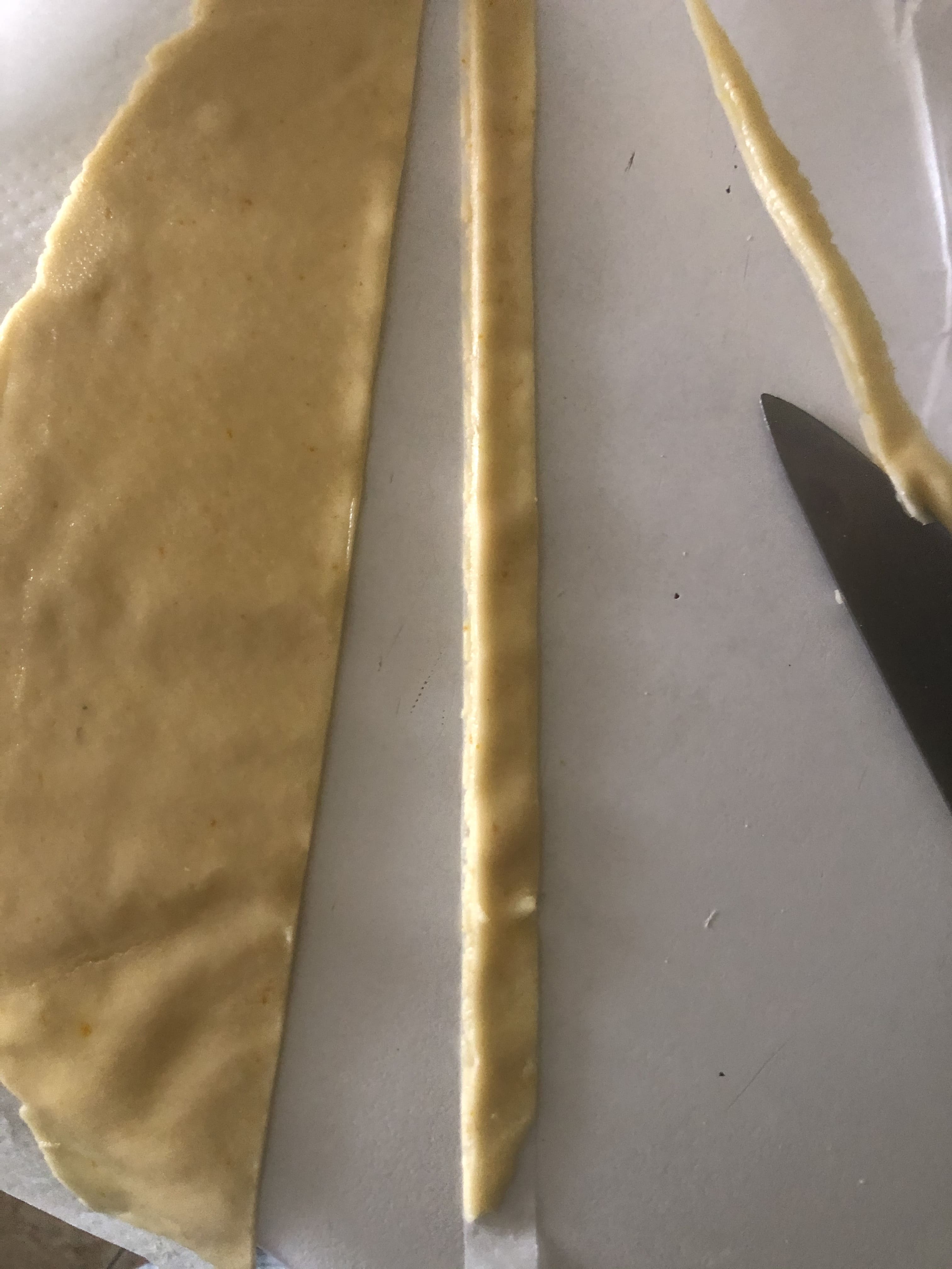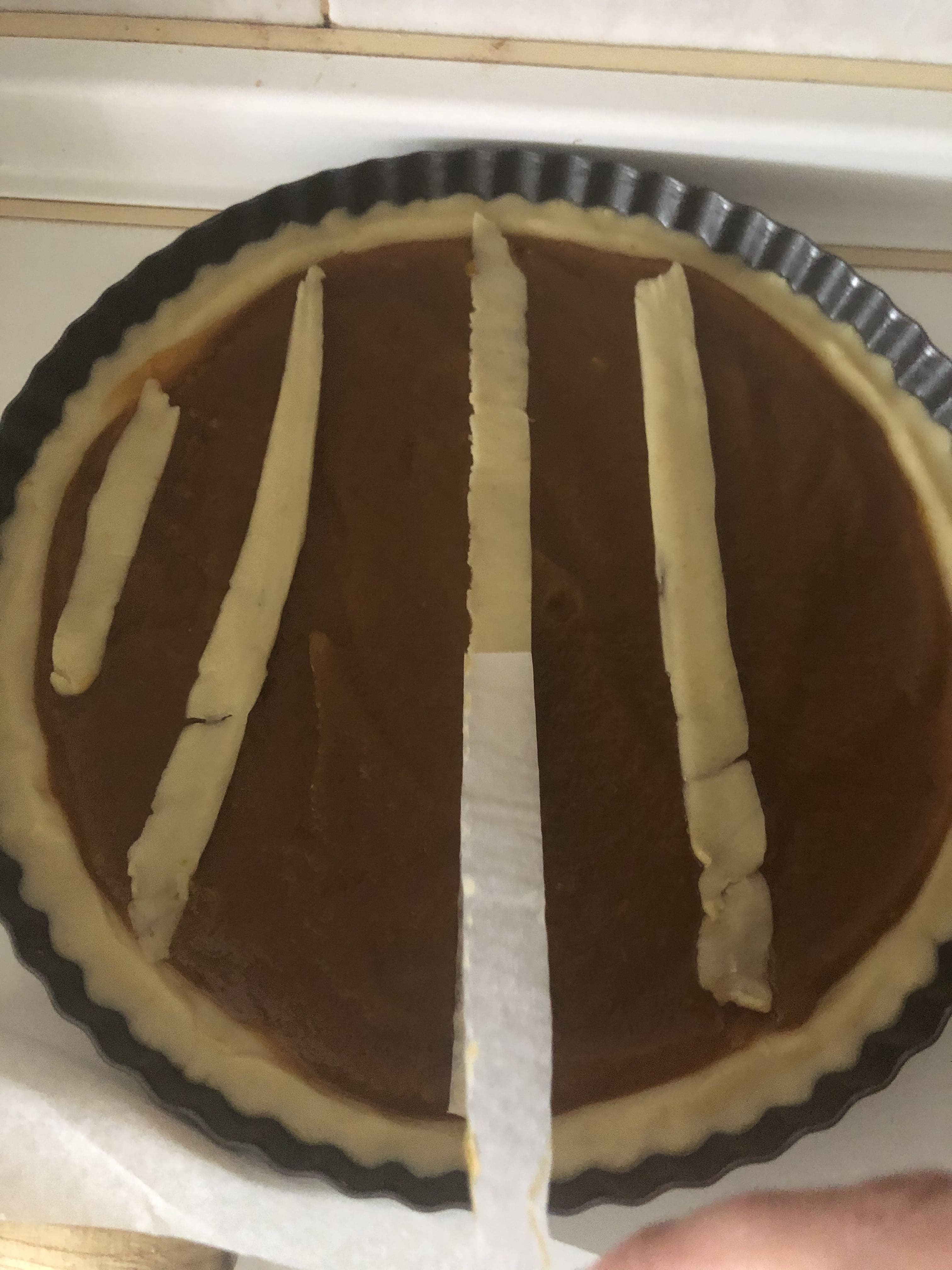Saca la masa del congelador y retira uno de los papeles. Haz tiras del mismo grosor con el cuchillo y después, con una tijera de cocina, ve cortando poco a poco. Coloca la parte de la masa sobre la tarta, recorta lo que sobre y, con mucho cuidado, retira el papel vegetal. Como ves, quedará fácilmente fijada al relleno. 😉