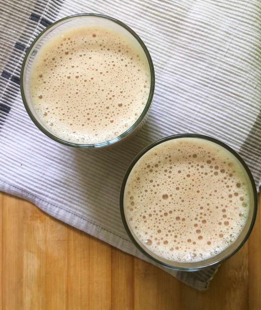 Toma otro recipiente y comienza el proceso de tirar el té de una taza a otra varias veces, hasta conseguir una textura cremosa y espumosa. Cuando esté listo, también estará perfecto para tomar.