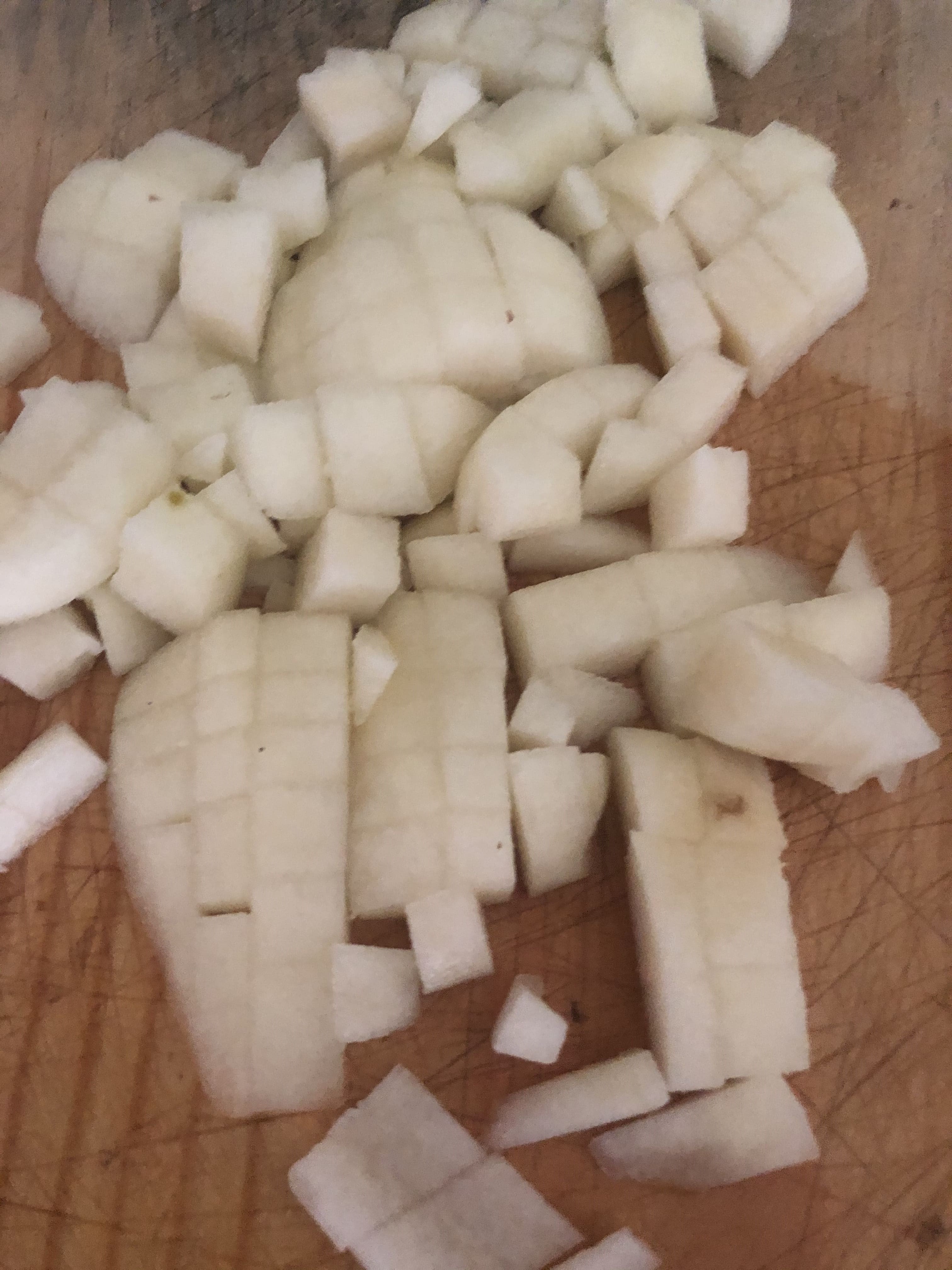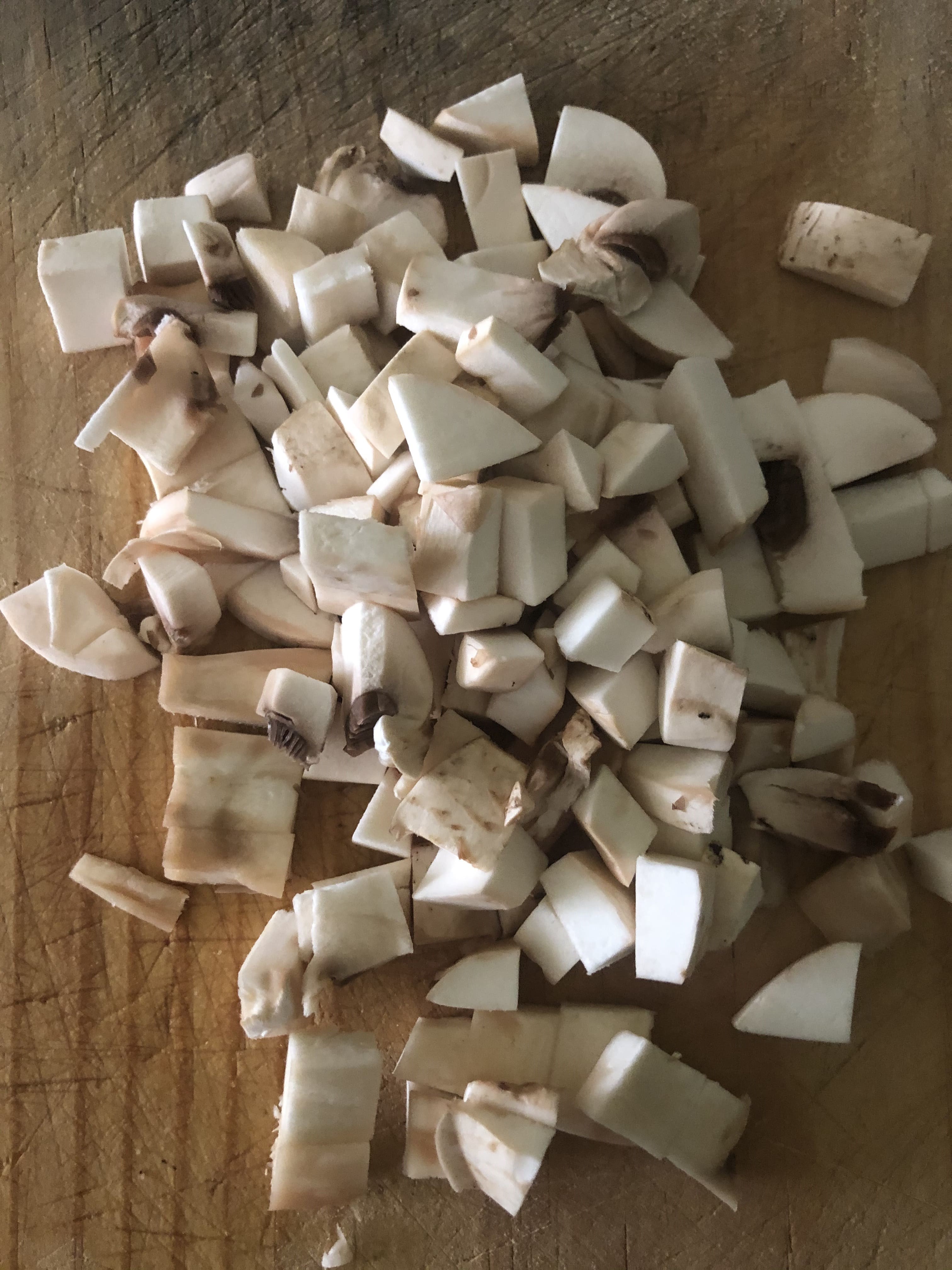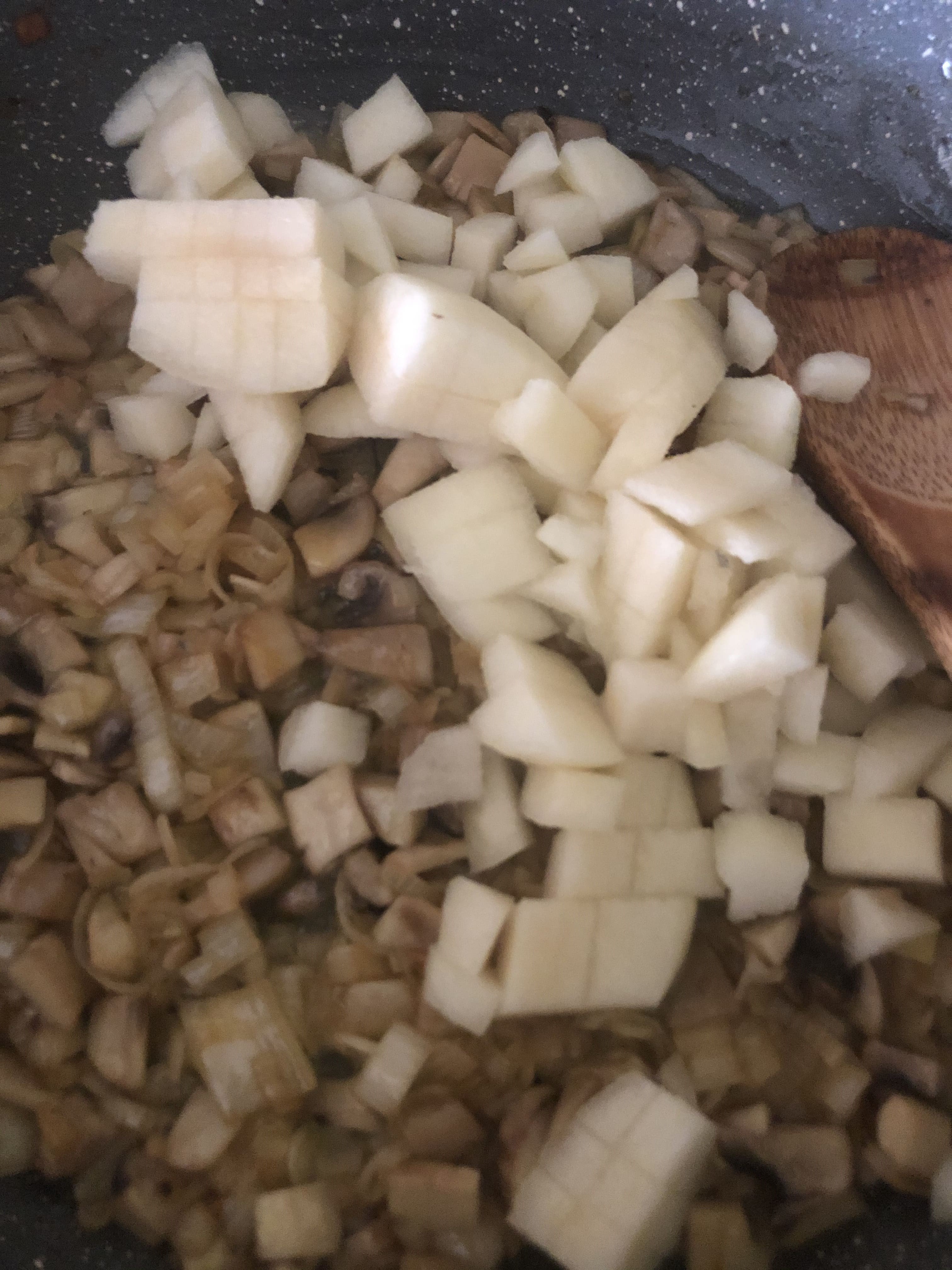 Limpia y corta el puerro en rodajas. Lava y corta los champiñones finamente. Pela las peras y corta en cubos no demasiado grandes.