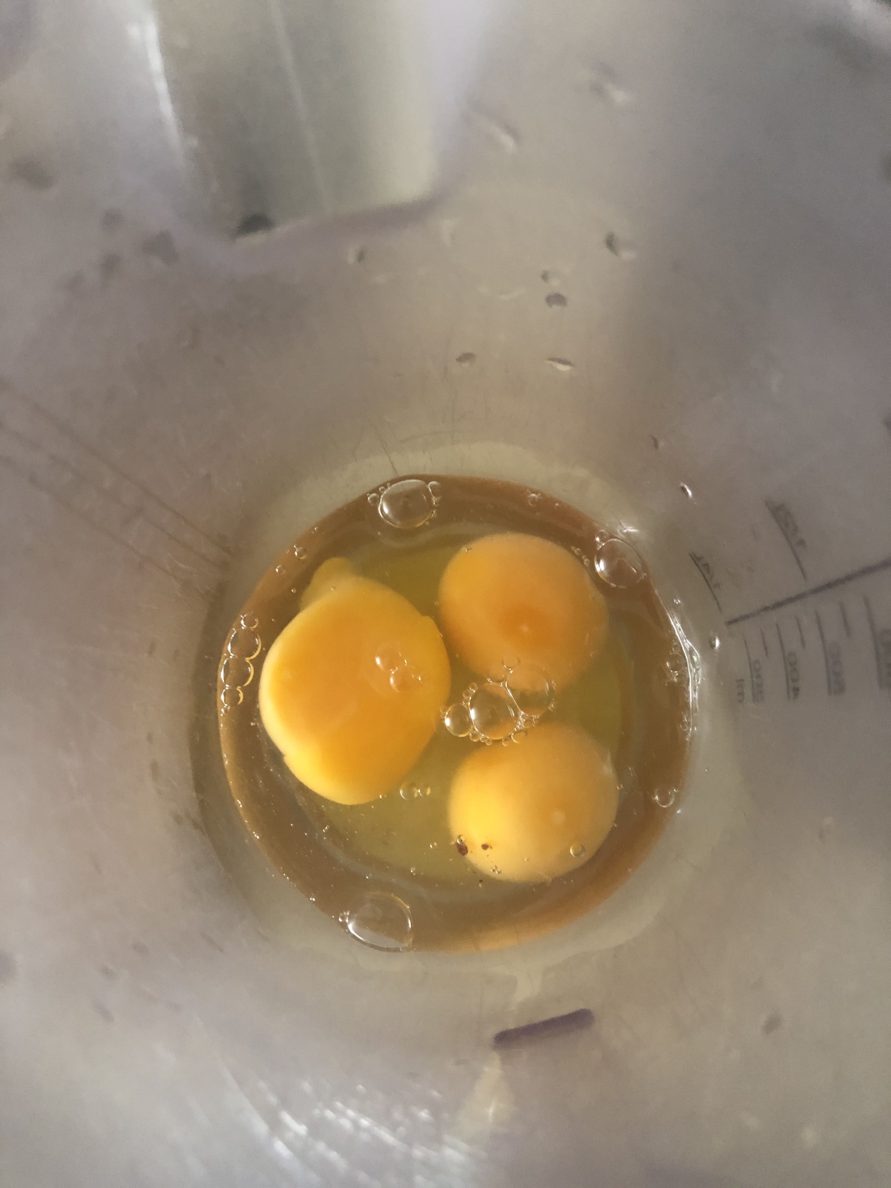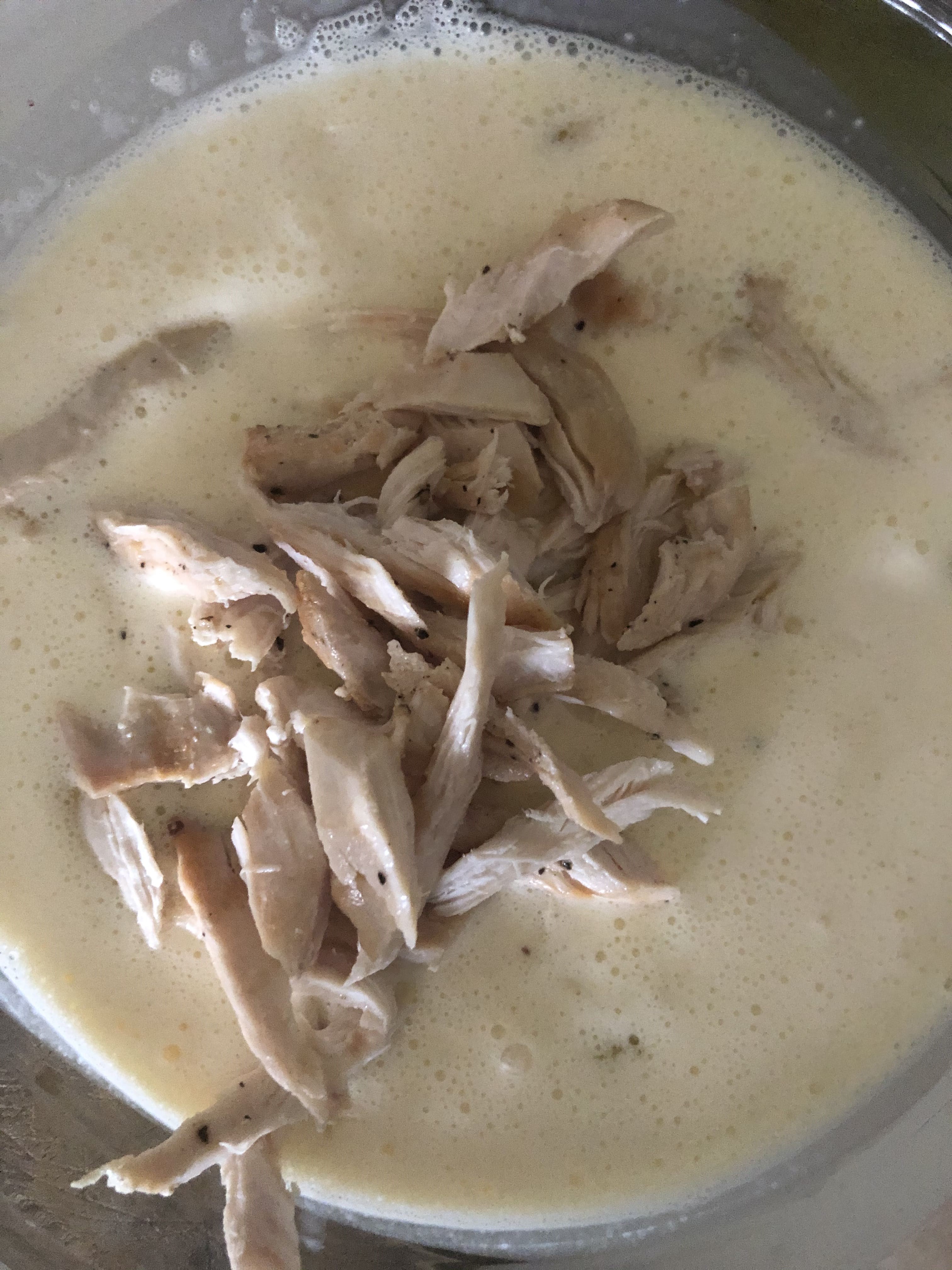 Mientras se hace el sofrito, deshilacha las pechugas con los dedos. Bate los huevos junto con la nata y parte del queso azul (yo uso la batidora). Agrega el pollo y el resto de ingredientes, mezclando todo bien.