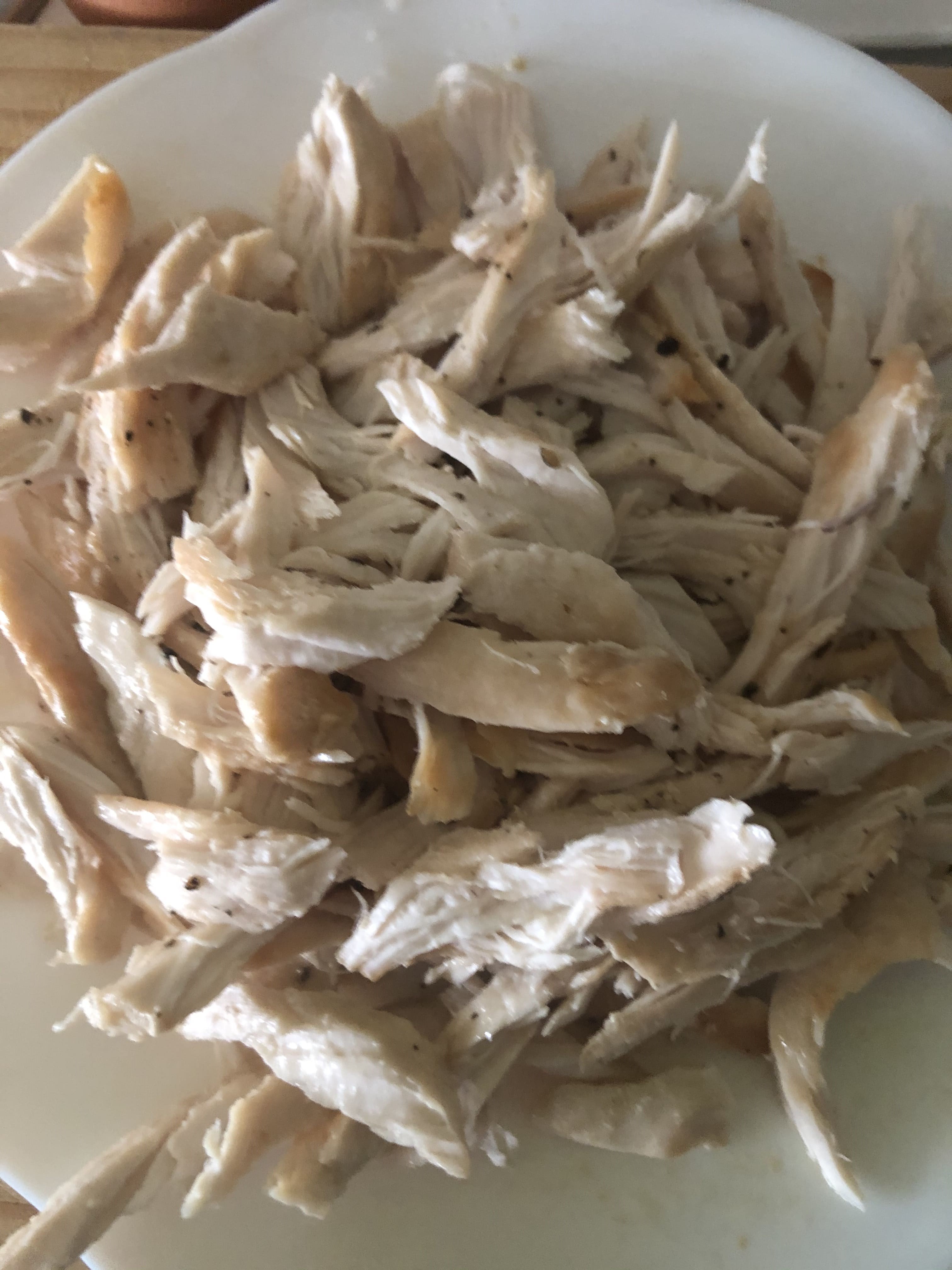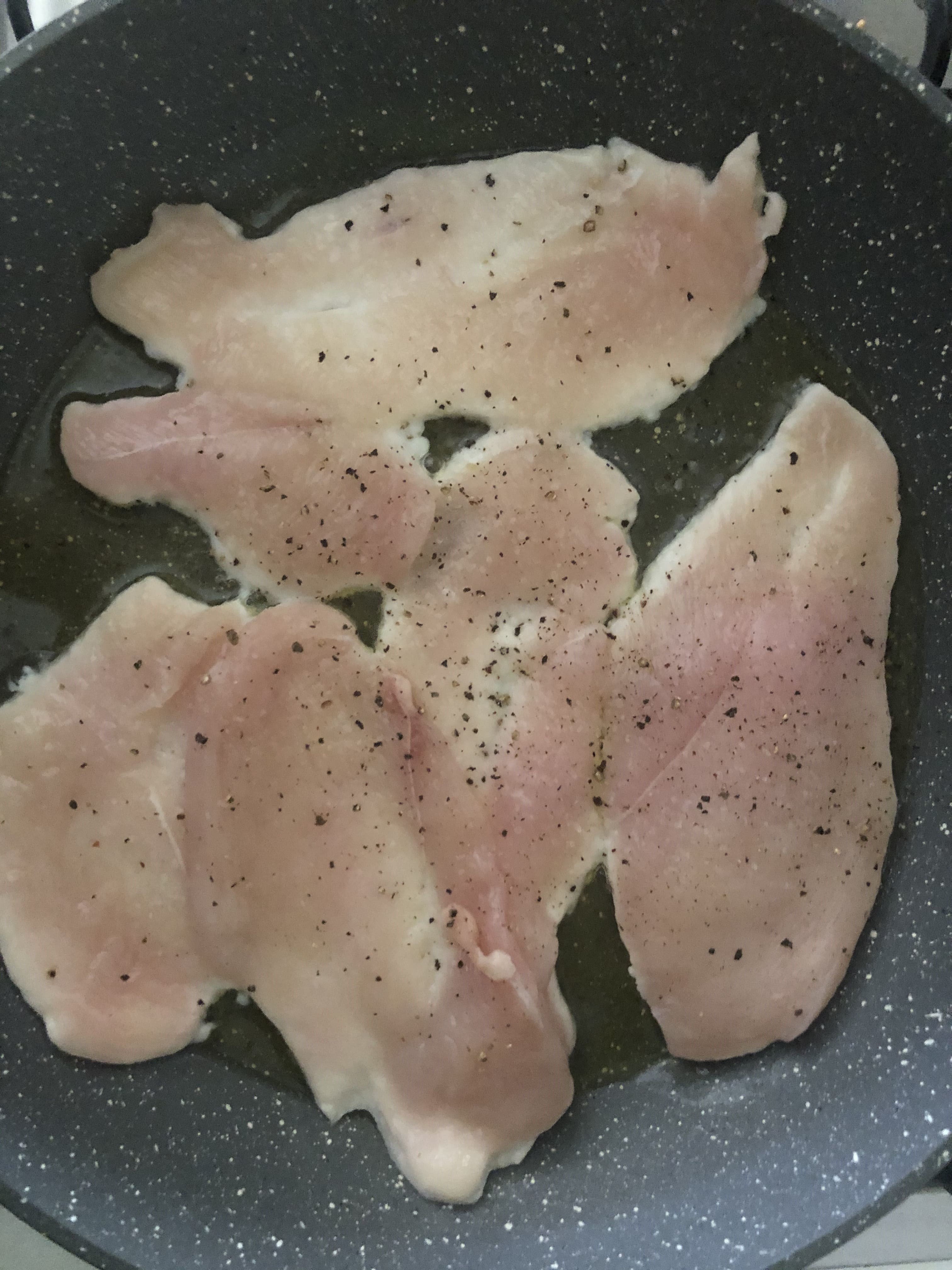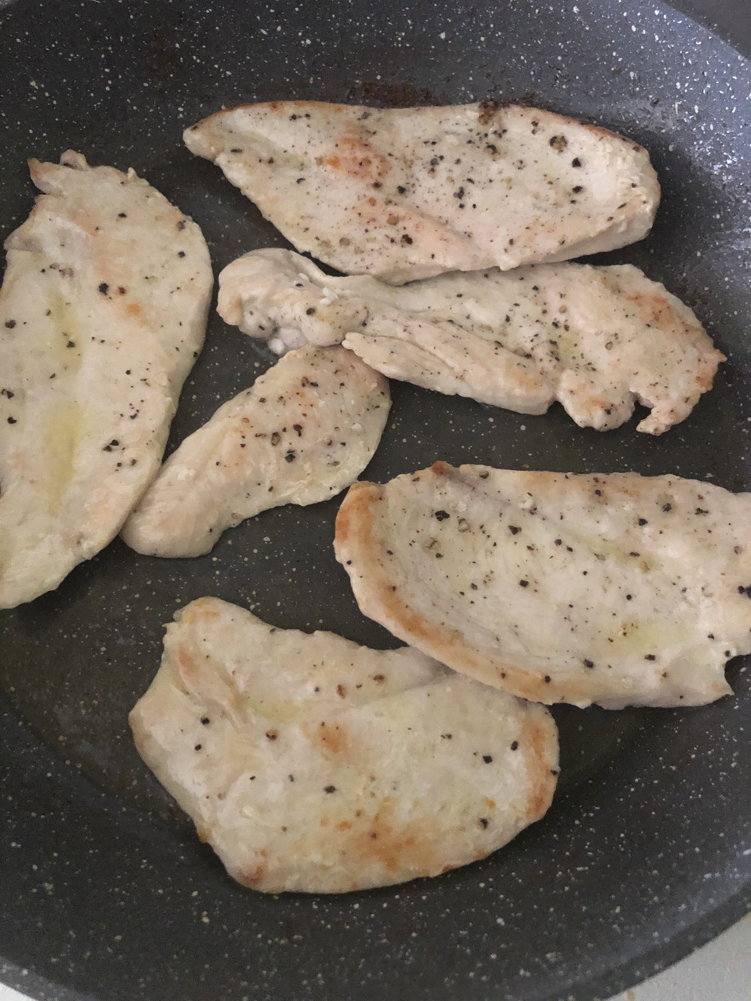 Salpimenta las pechugas y ásalas en una sartén con un poco de aceite. Coloca sobre papel absorbente y deja que se enfríen.