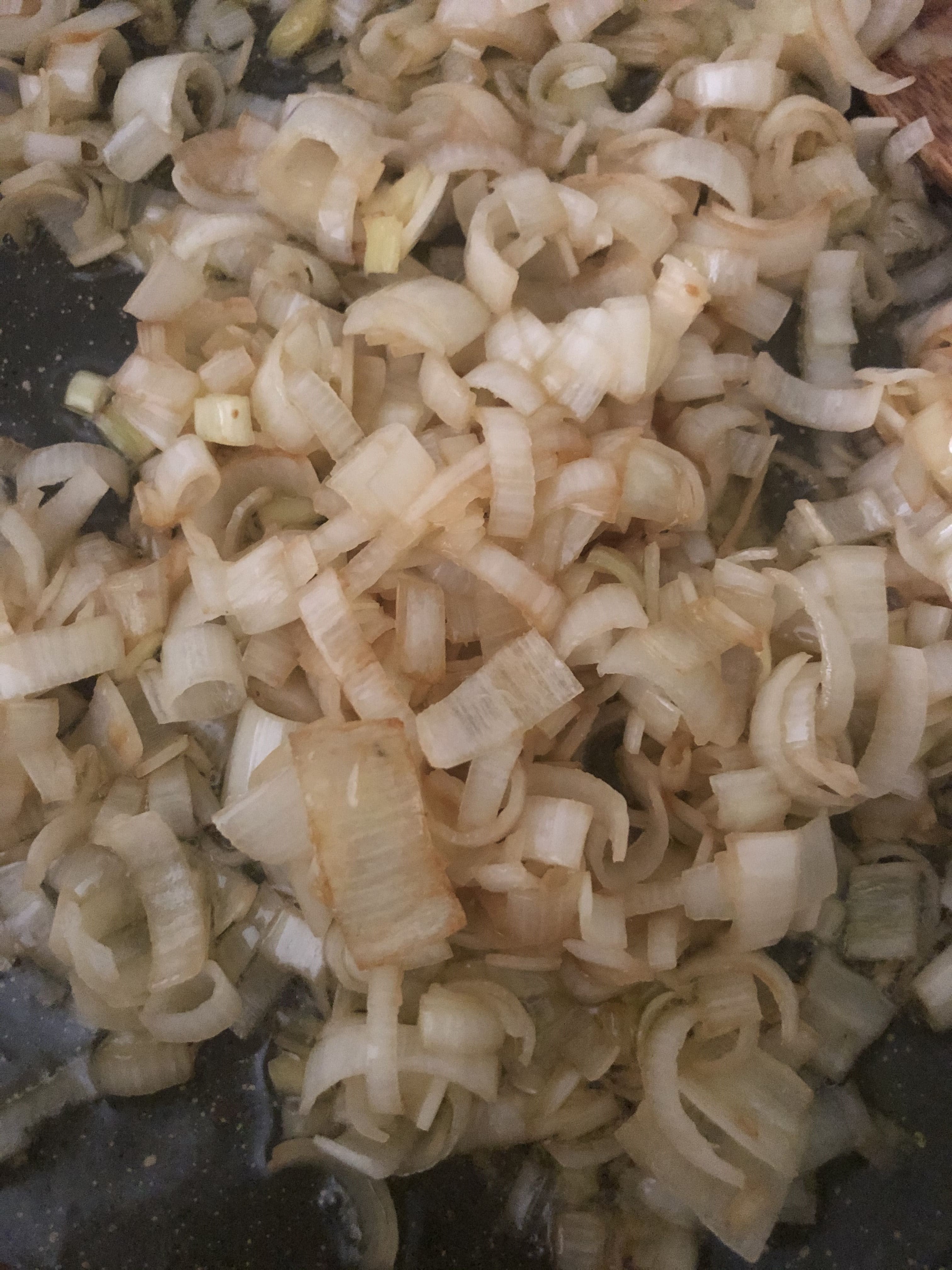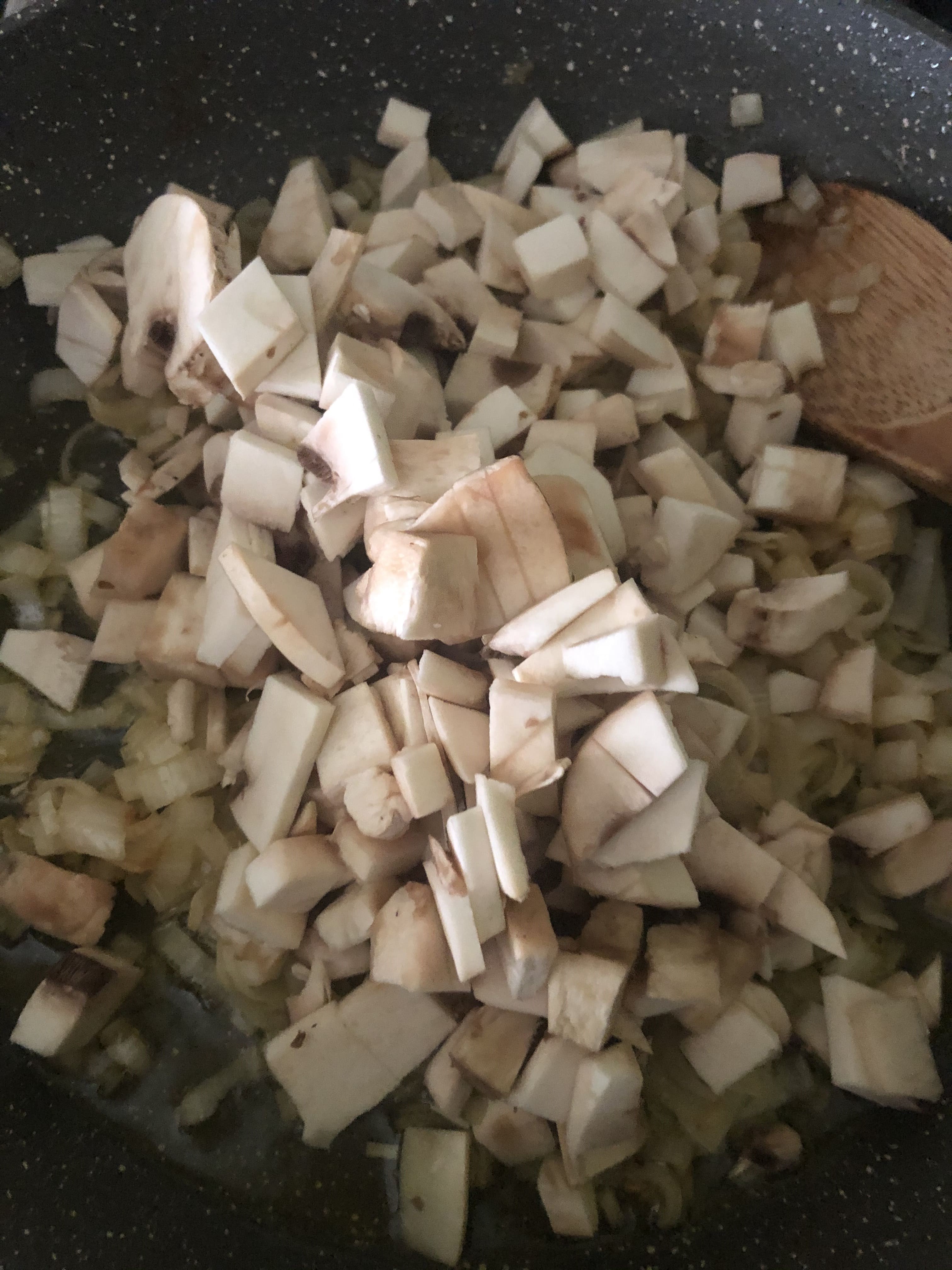 Vierte un poco de aceite en una sartén y pocha el puerro. Una vez que empiece a estar transparente, agrega los champiñones. Cocina unos minutos y añade las peras. Sazona y deja cocinar hasta que las peras estén blanditas pero que no se deshagan. Elimina el exceso de aceite y reserva.