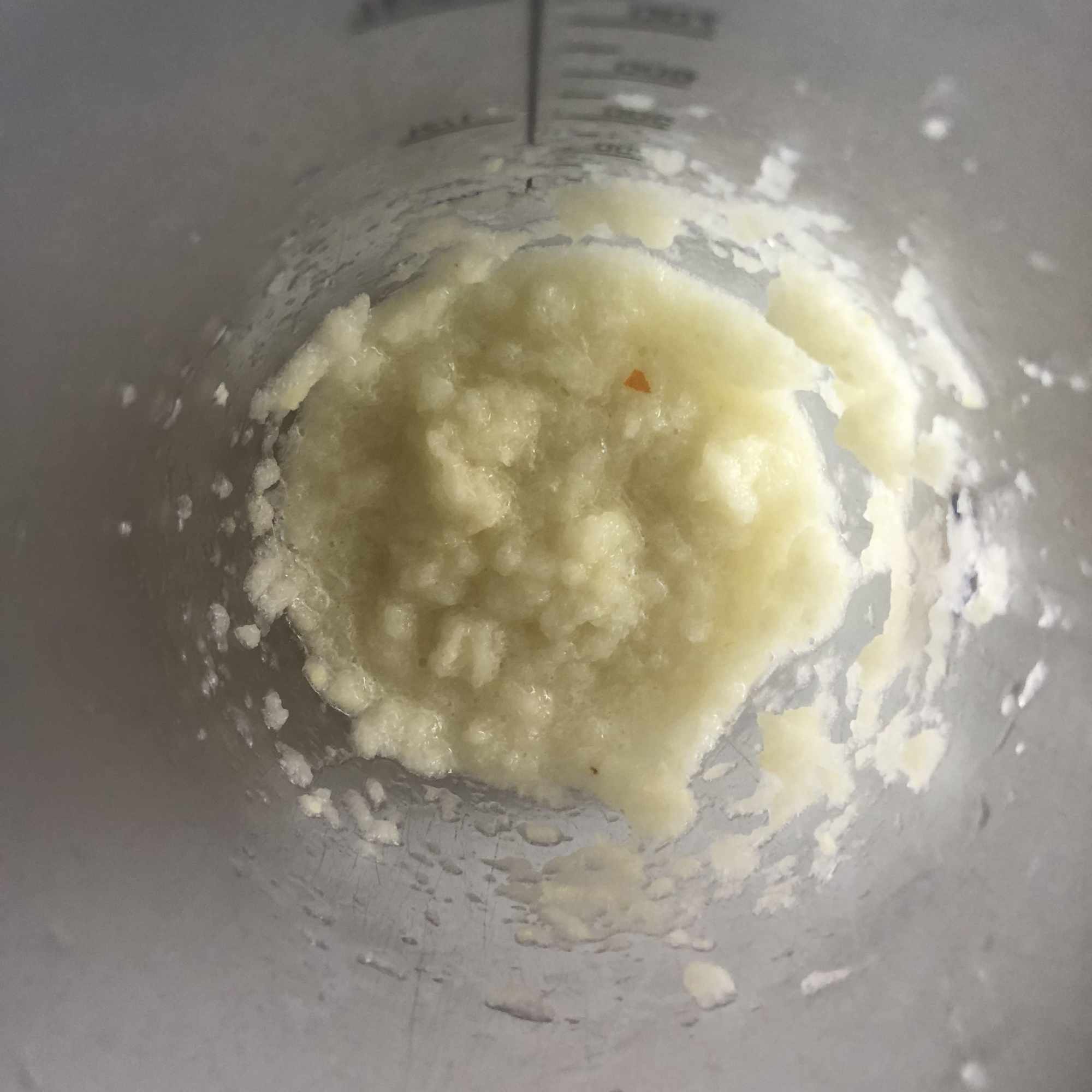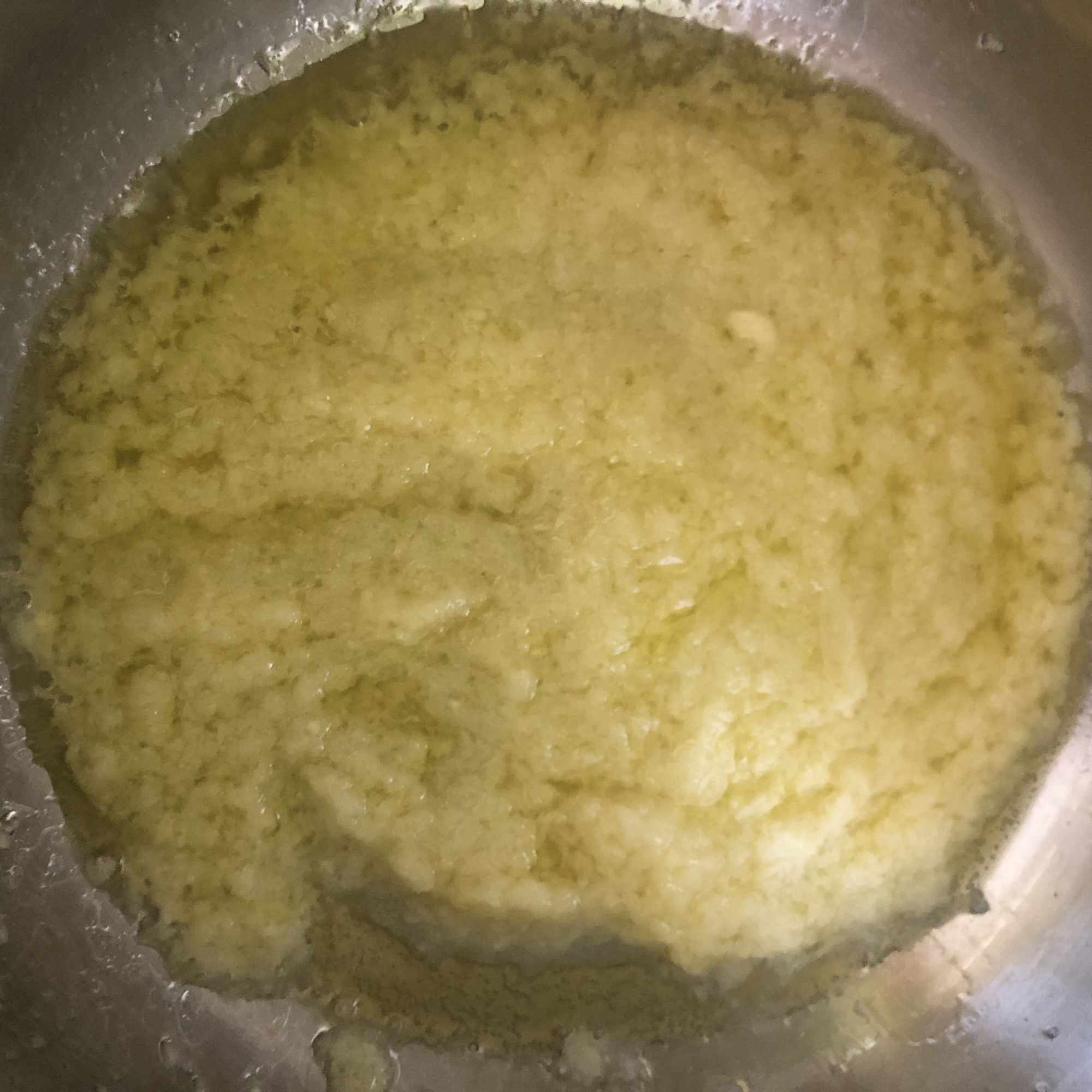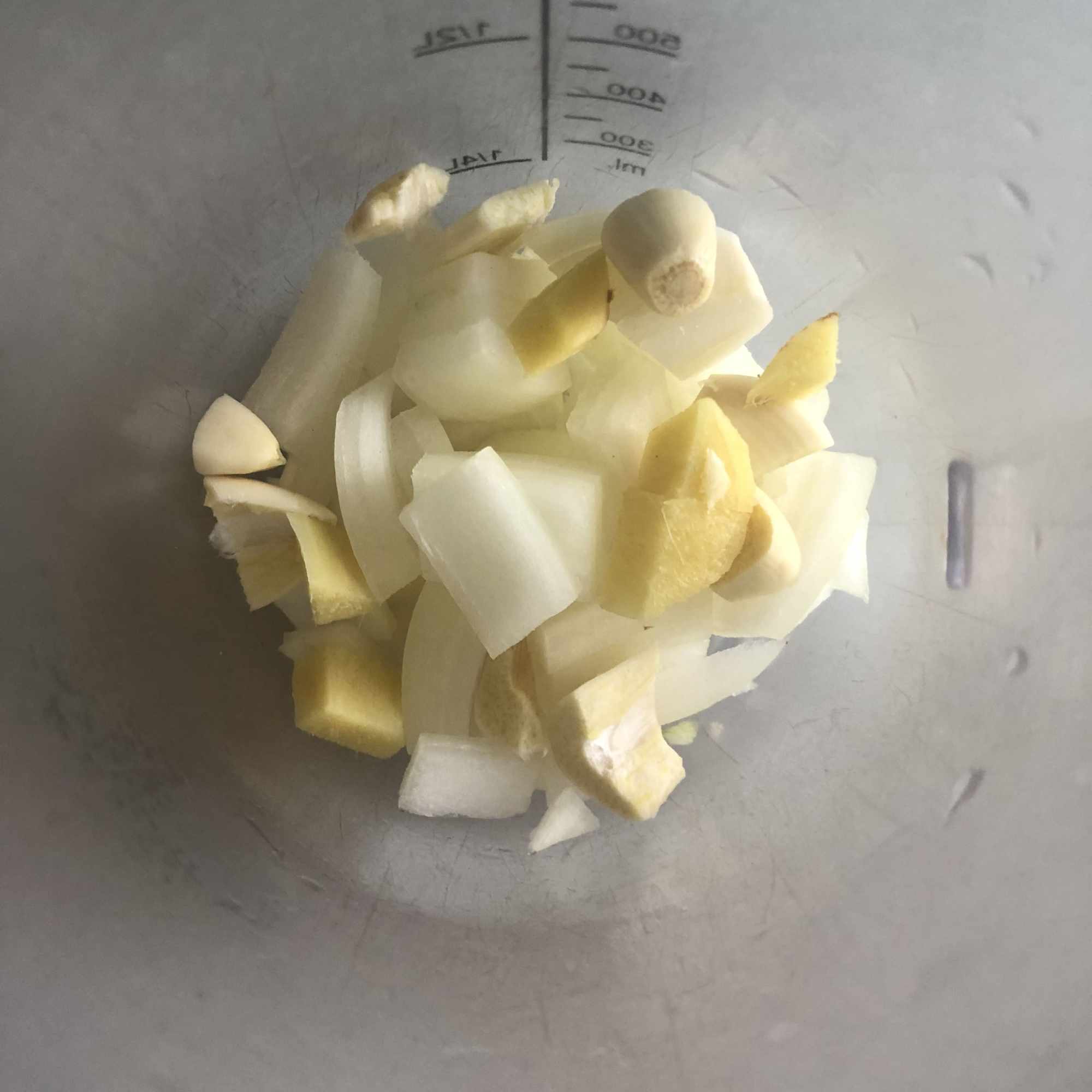 Corta la cebolla en trozos medianos, pela el ajo y retira el germen y pela el jengibre y córtalo a la mitad. Vierte todo en el vaso de la batidora y tritura hasta obtener una pasta.