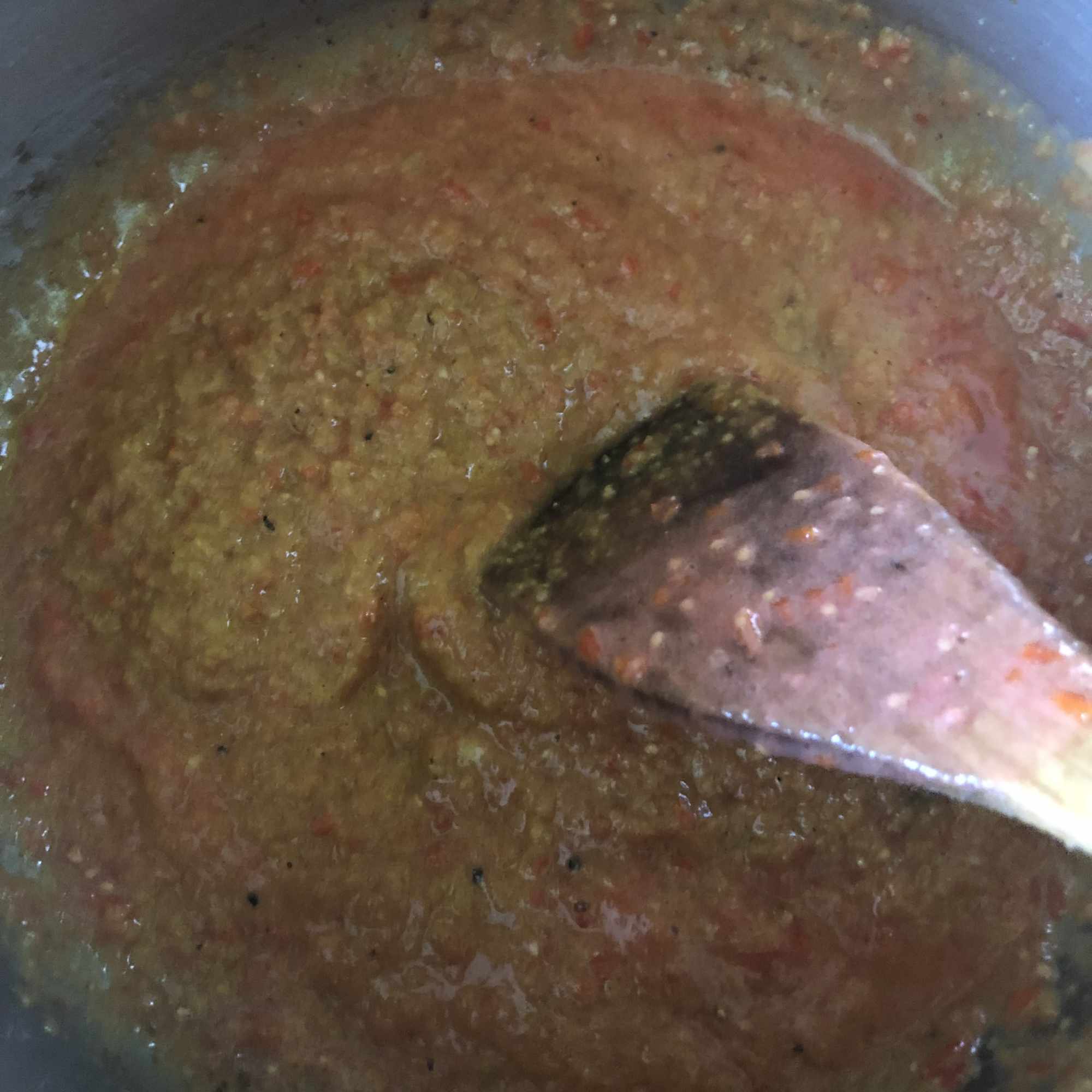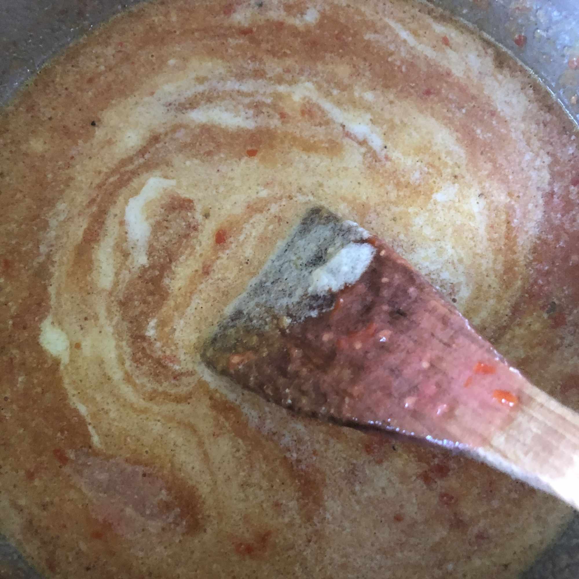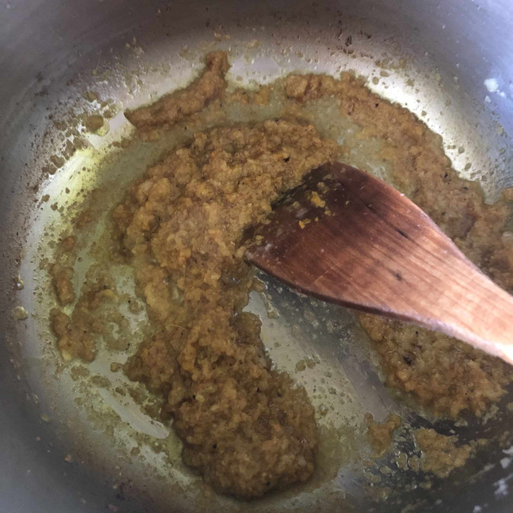 Calienta un poco de aceite en una cazuela o sartén honda y añade la pasta hasta que adquiera un color doradito. Agrega la mezcla de especias y mezcla todo bien sin que lleguen a quemarse.
