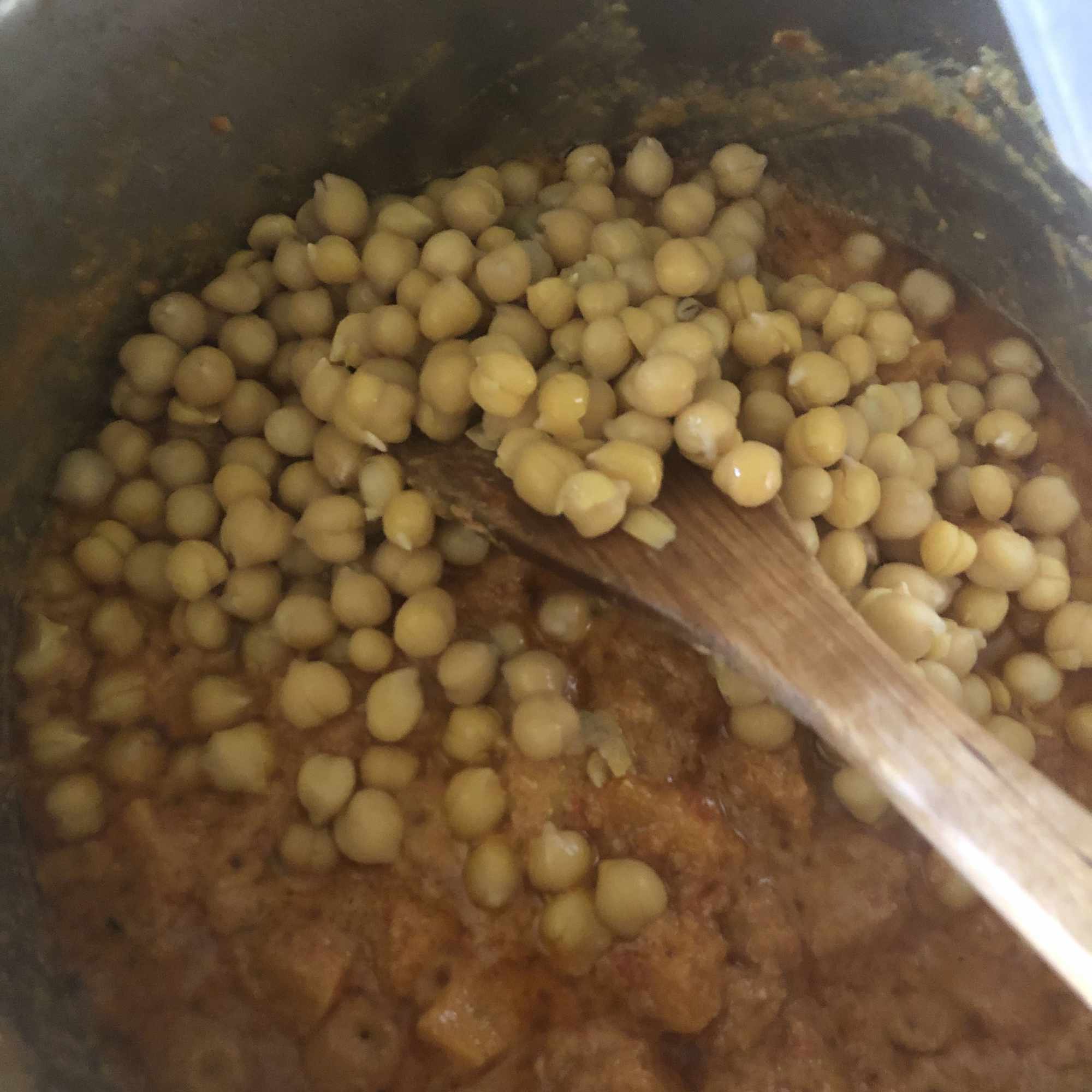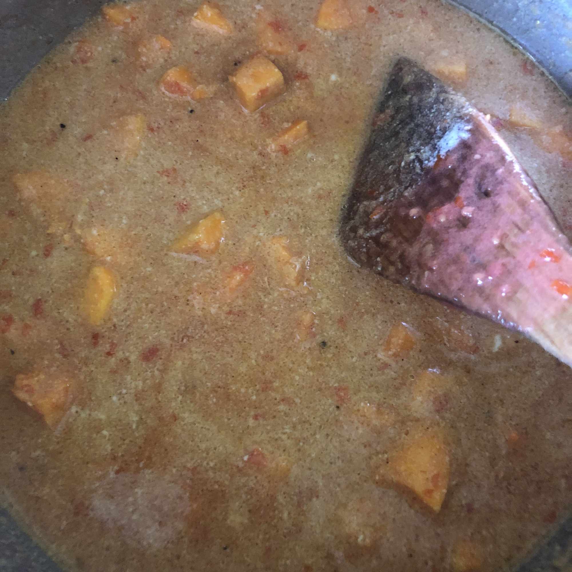 Continúa con el tomate, la leche de coco y la calabaza y cocina a fuego medio hasta que la calabaza esté blandita (unos 20-30 minutos). En ese punto, agrega los garbanzos y las espinacas y cuece 5 minutos más.
